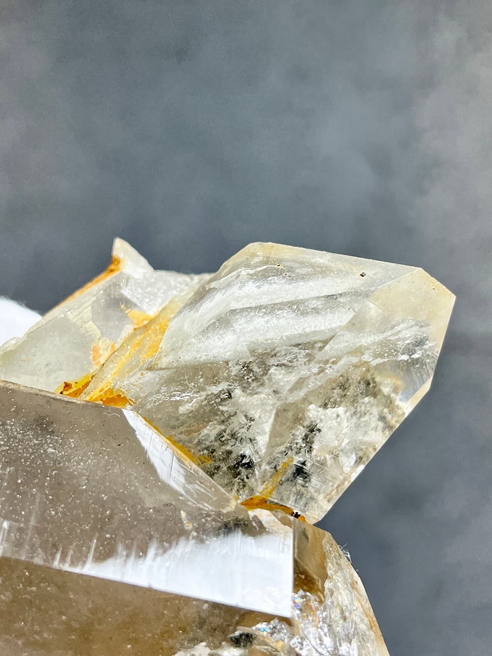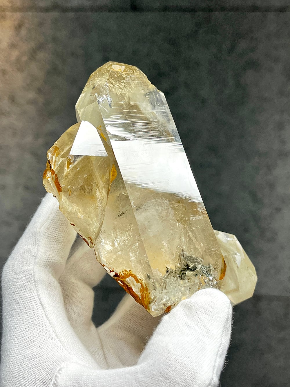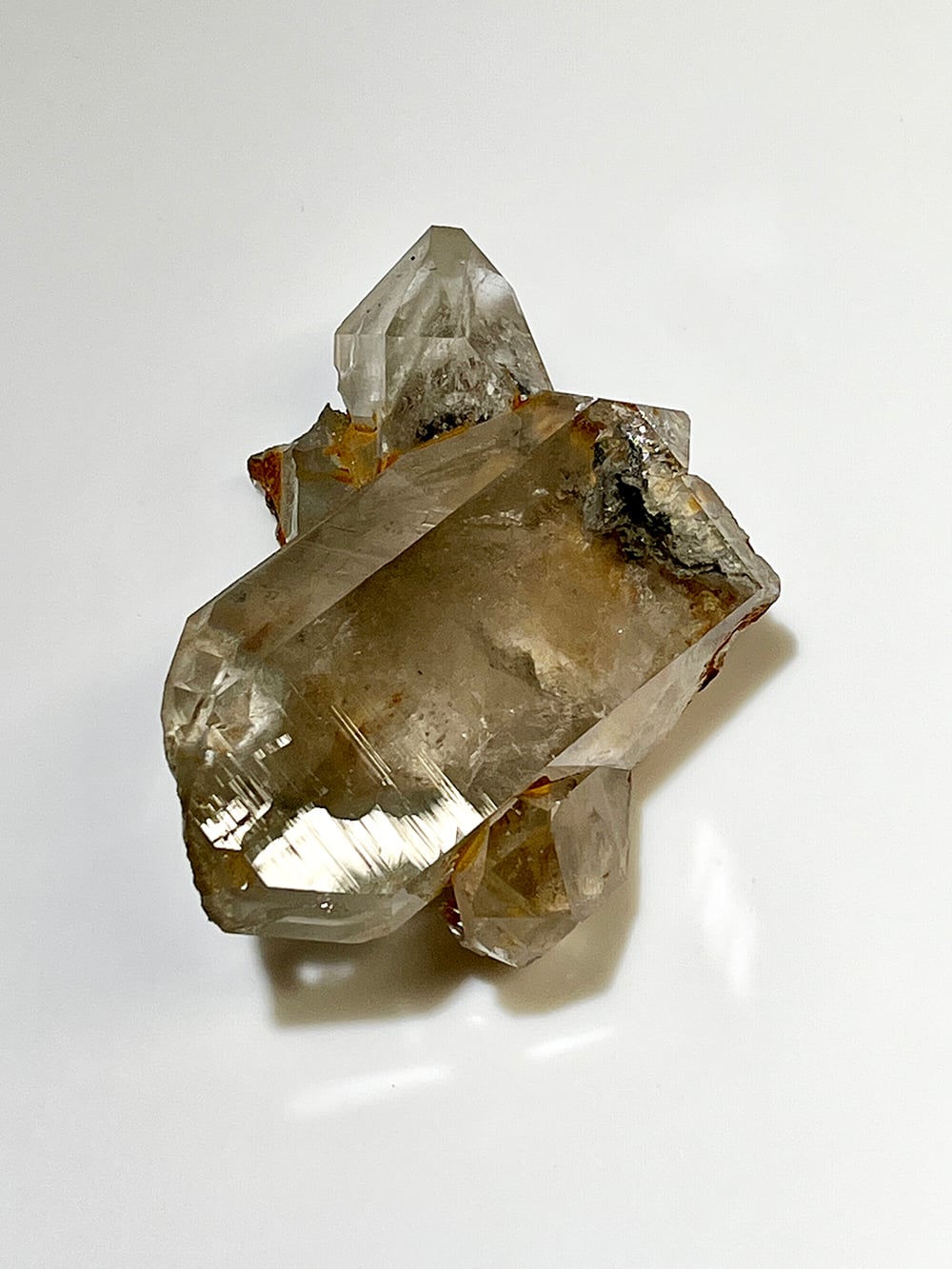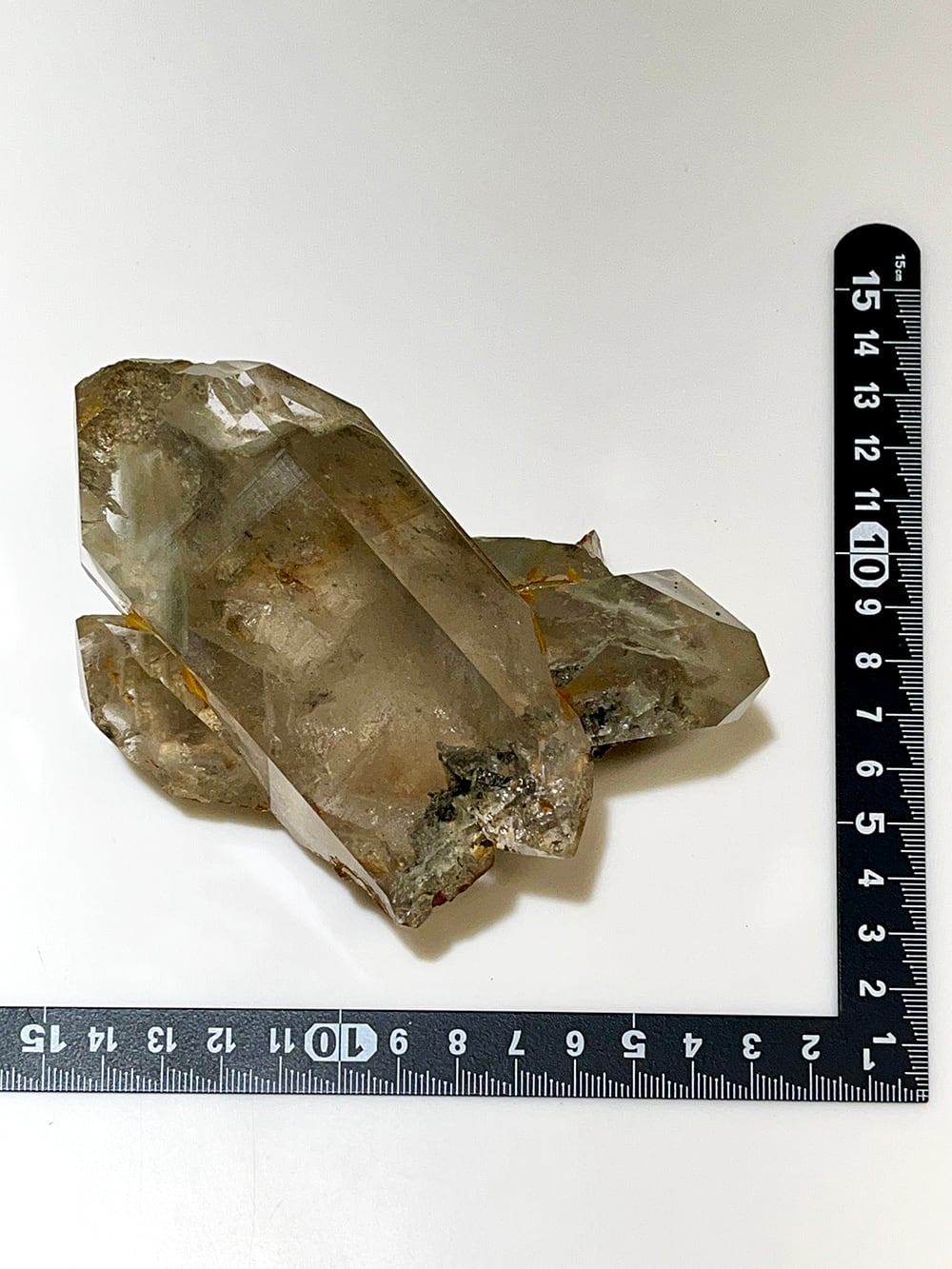 画像でも伝わるほど照りが素晴らしいクォーツクラスター。中心の大きなクォーツは両剣になっており、画像1枚目の上側にはファントム、下側にはレインボーを見ることができる水晶の美しさと面白さが全て詰まったような贅沢なクラスターです。裏側を見るとファントムが生成される過程を感じられる層があり、クローライトを表面に纏った美しいポイントの姿も見ることができます。