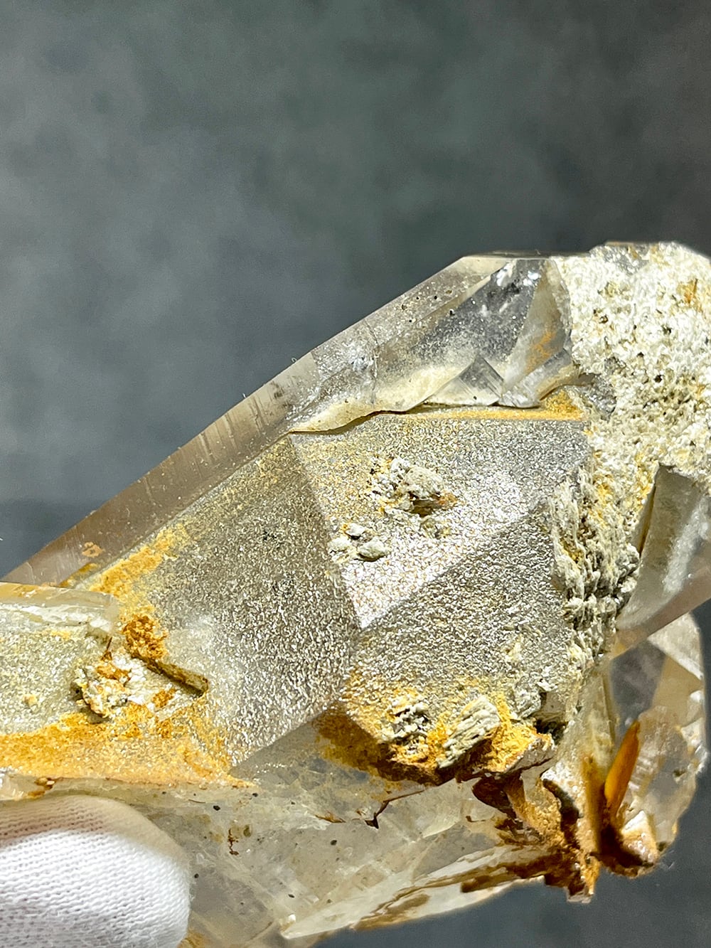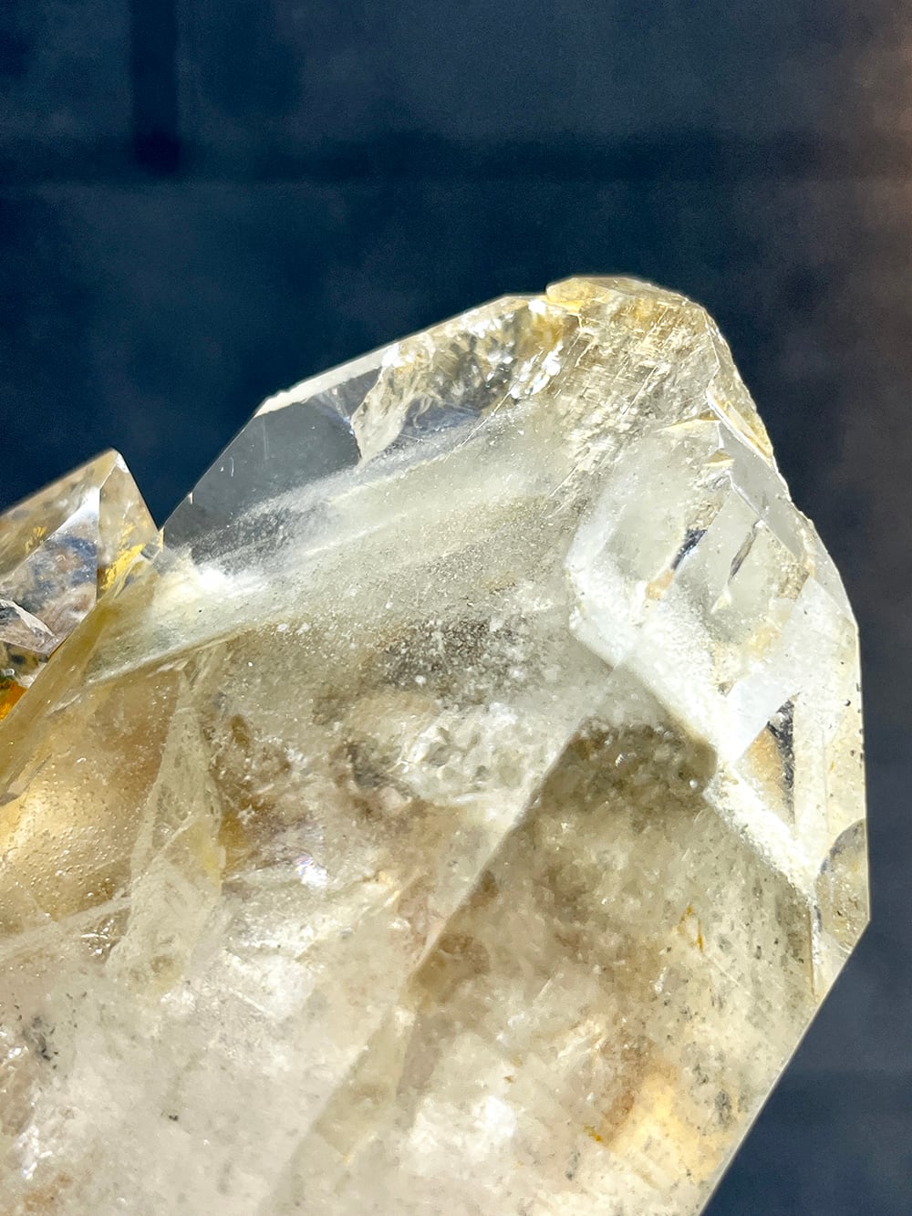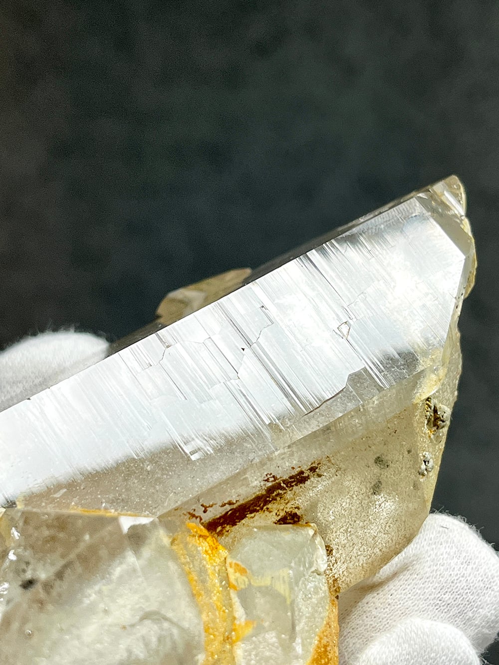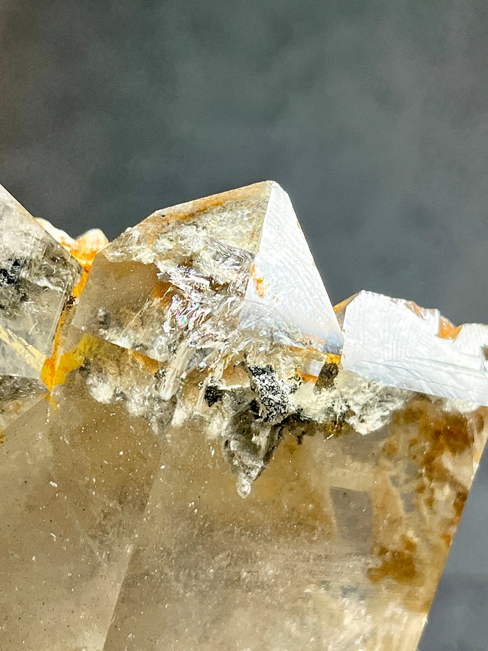 画像でも伝わるほど照りが素晴らしいクォーツクラスター。中心の大きなクォーツは両剣になっており、画像1枚目の上側にはファントム、下側にはレインボーを見ることができる水晶の美しさと面白さが全て詰まったような贅沢なクラスターです。裏側を見るとファントムが生成される過程を感じられる層があり、クローライトを表面に纏った美しいポイントの姿も見ることができます。