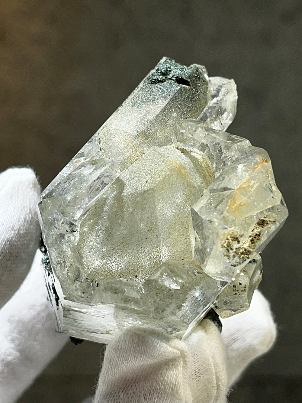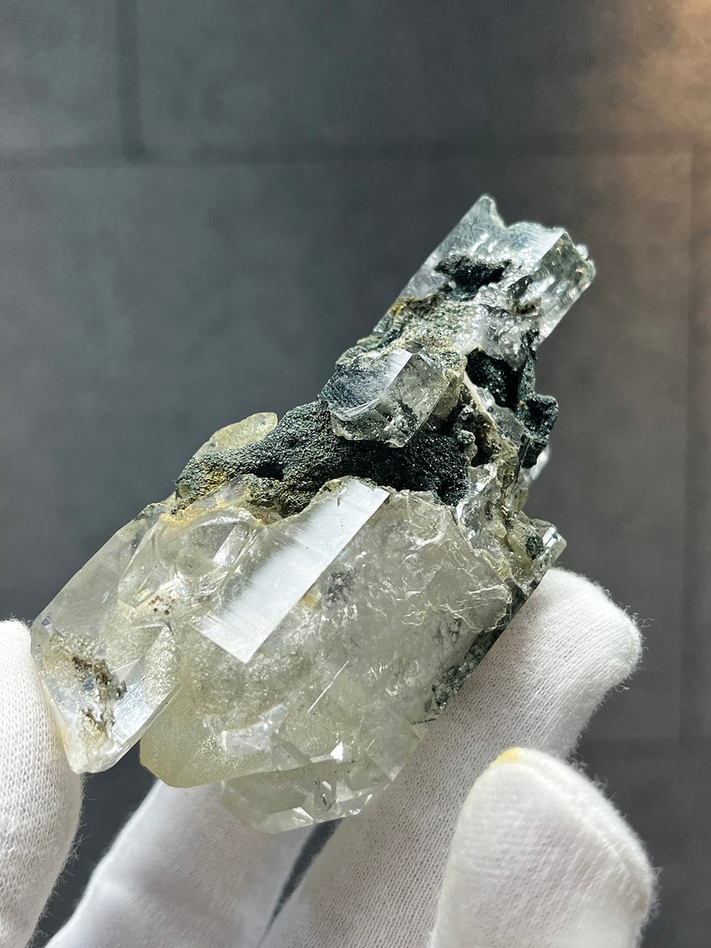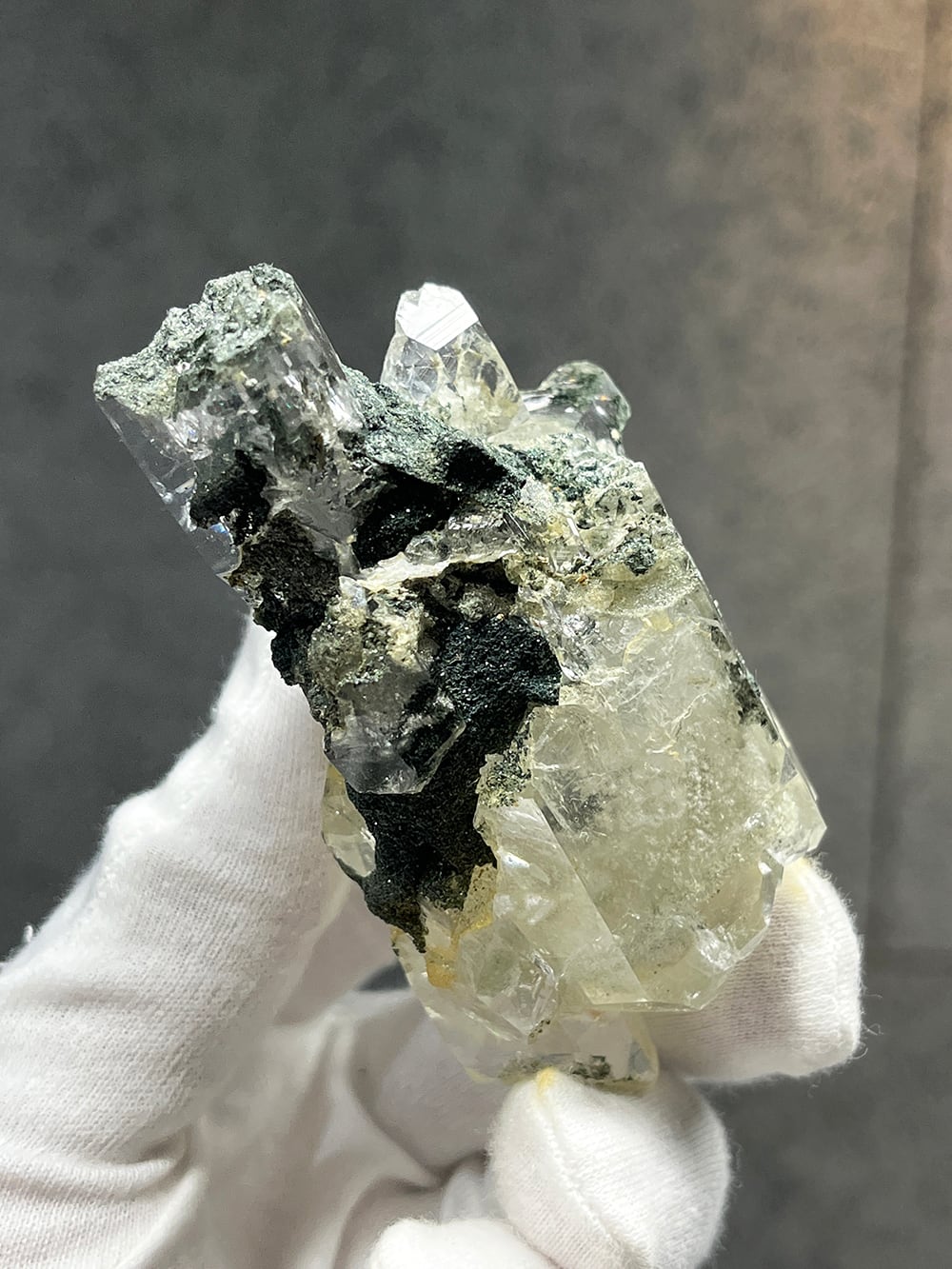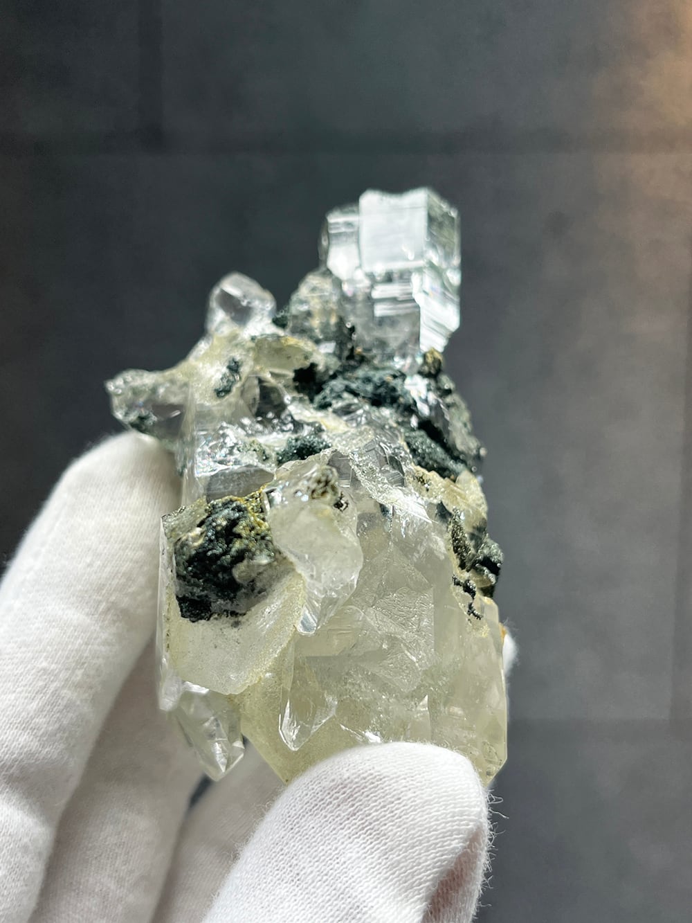 何よりその特徴は建築物のように入り組んだ形。どの角度から見ても違う景色を見ることができ、画像7枚目の方向から見ると中心の大きなポイントが周りを包み込まれるように生成されています。そしてその中心のポイントのみクローライトの付着で表面が梨地になっていて、面白い質感のコントラストが作られています。さらに外側からるとファントムとしても見ることもできます。