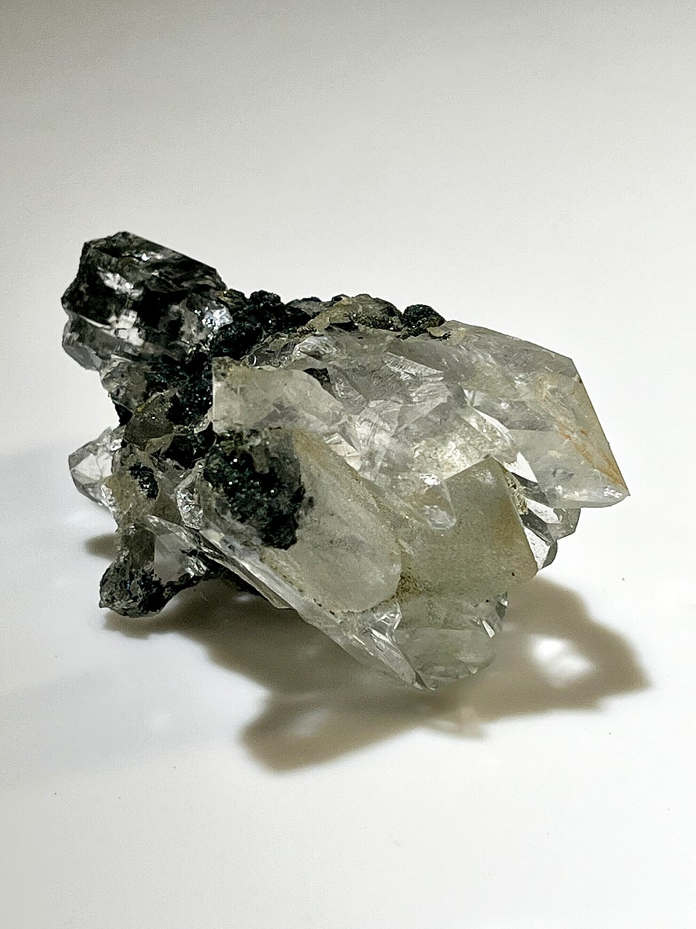 絶妙にクォーツが入り組んだクラスター。色の濃いグリーンのクローライトが表面を侵食し、水晶内部にも取り込まれガーデンクォーツになっています。