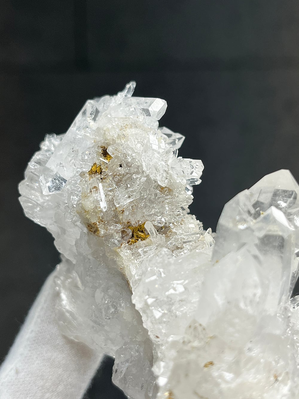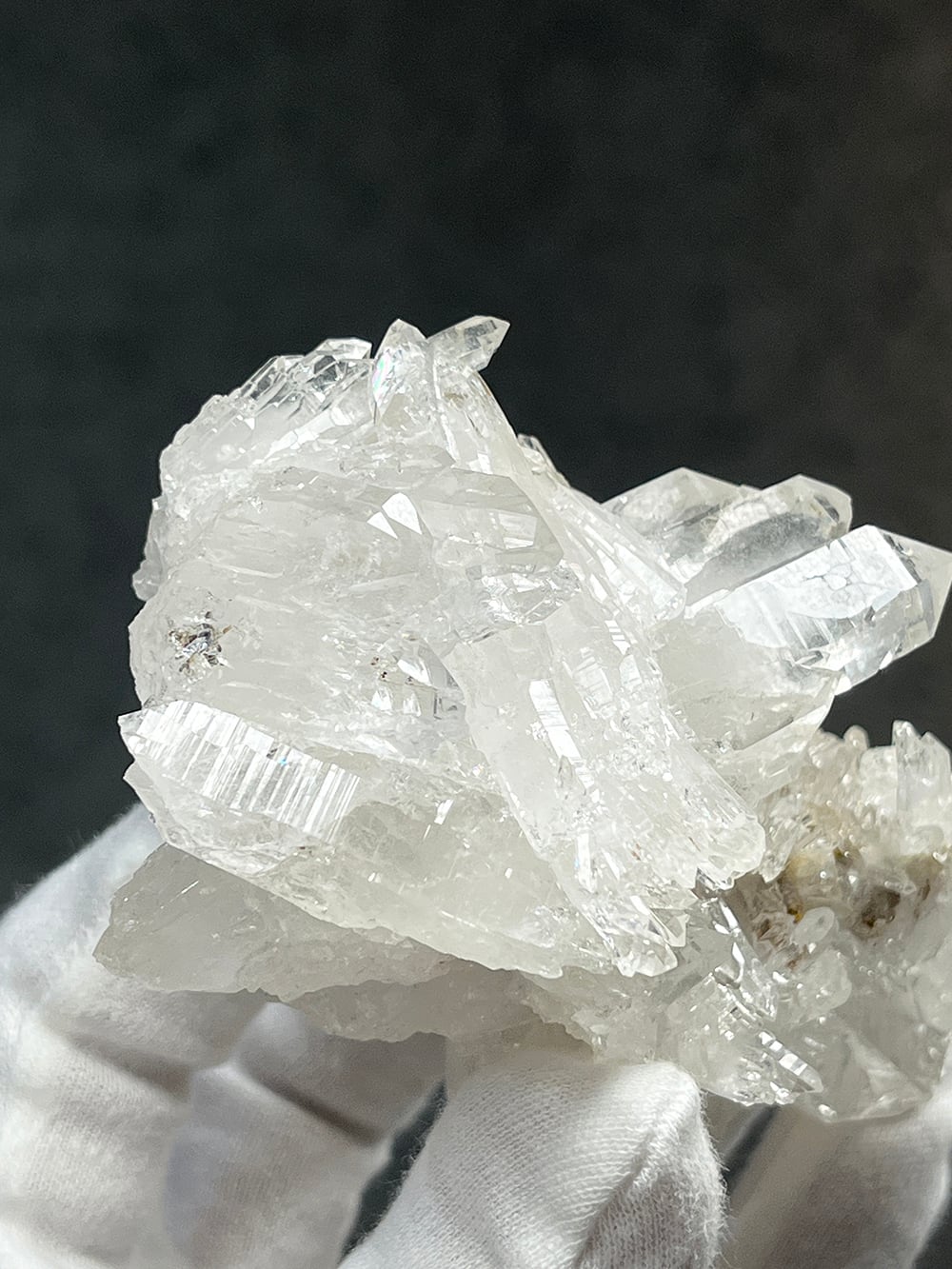 形に特徴のあるクラスターですが、それ以上にその輝きに驚きます。一つひとつの結晶は小さいですが、その全ての光沢に圧倒されます。画像では伝えきれませんが、常に水に濡れているかのような表情です。