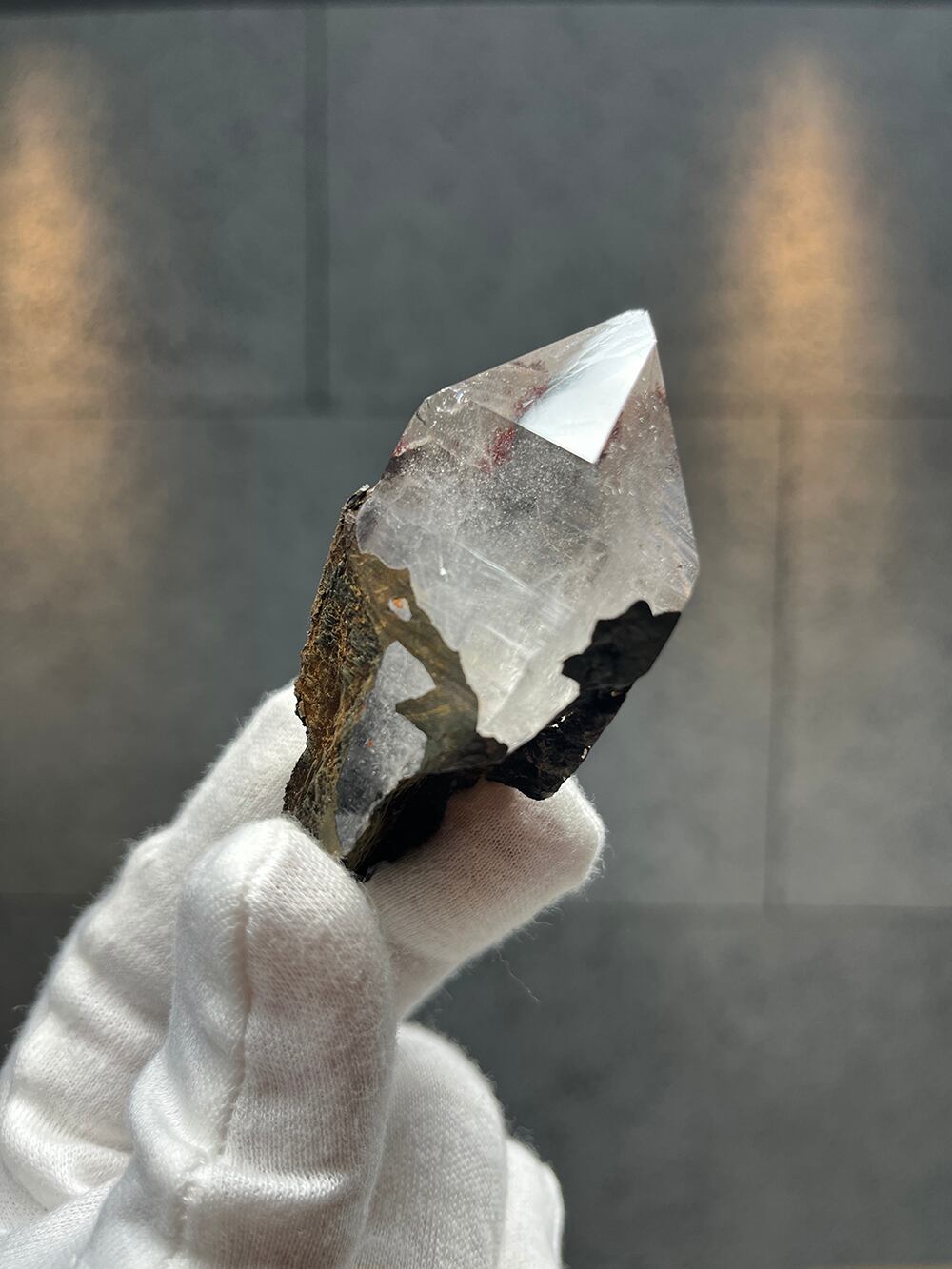 透明度の高い美しい単結晶を酸化鉄が包んでいる不思議な印象のクォーツ。ところどころ酸化鉄は剥離しており、そこから美しい内部を覗くこともできます。ポイントは綺麗に残っており、その照りもかなりの美しさです。
