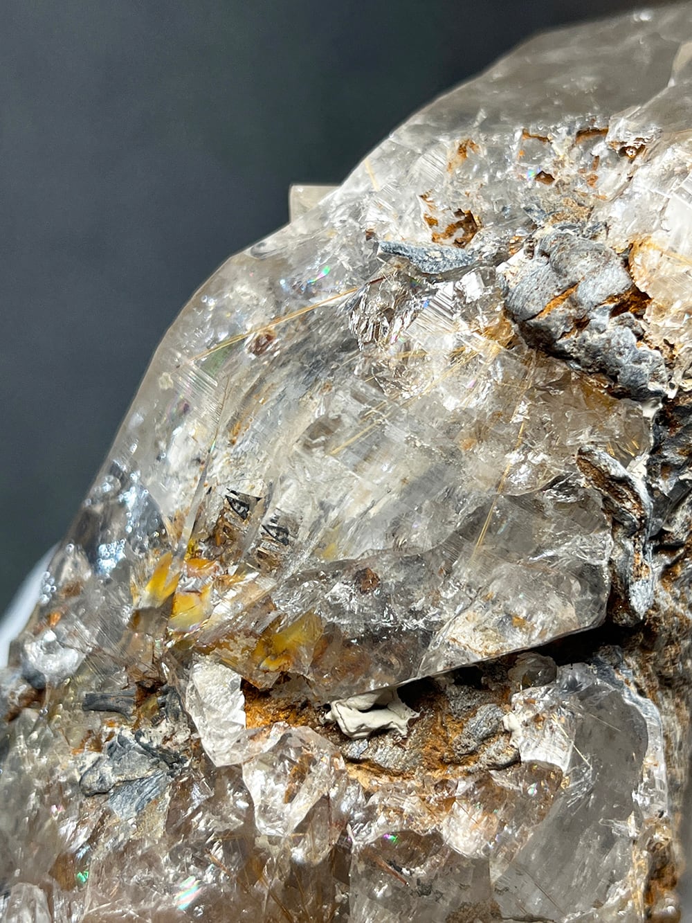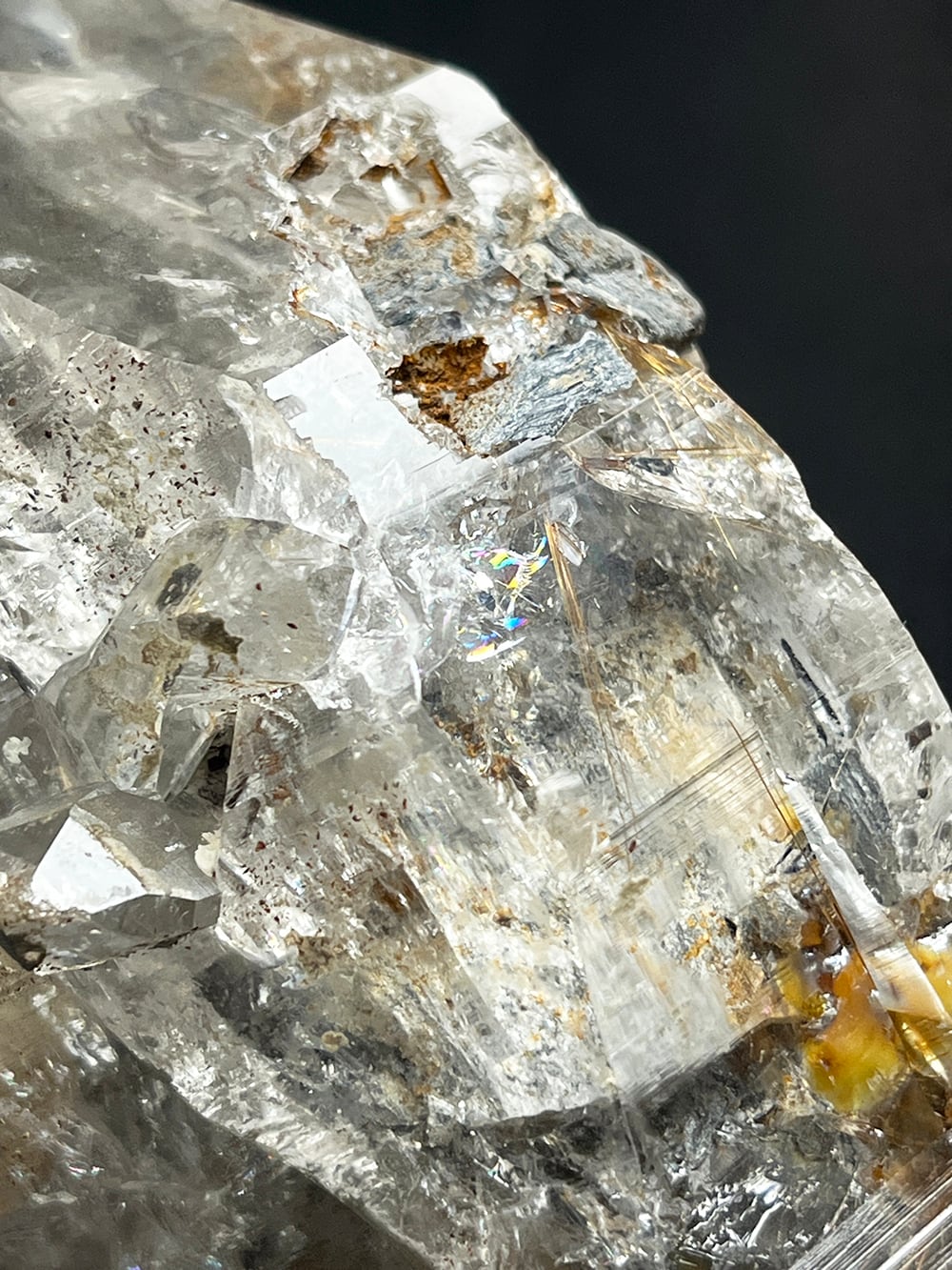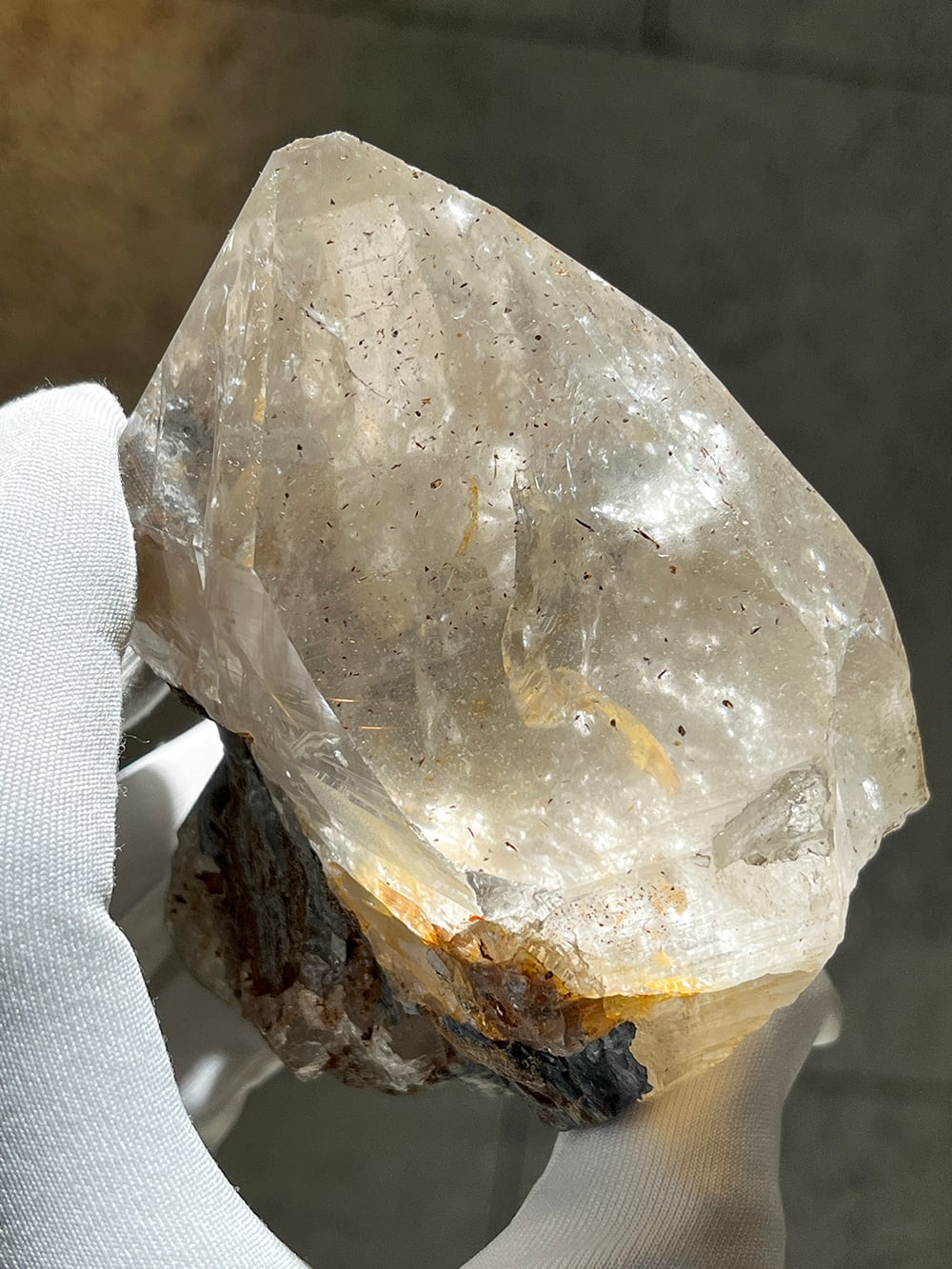 ゴールデンルチルを内包した、パキスタンはスカルドゥ産のクォーツ。かなりのボリュームがあるポイントで、重さも700gあります。手のひらに乗せるとそのずっしりとした重みを感じ、美しい照りやレインボーをたくさん見ることが出来ます。ルチルを内包している部分のクォーツの透明度も素晴らしく、はっきりとその金色の針が見えます。