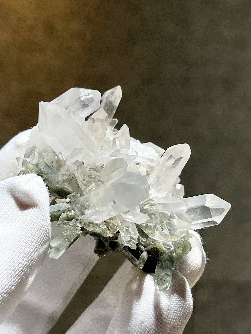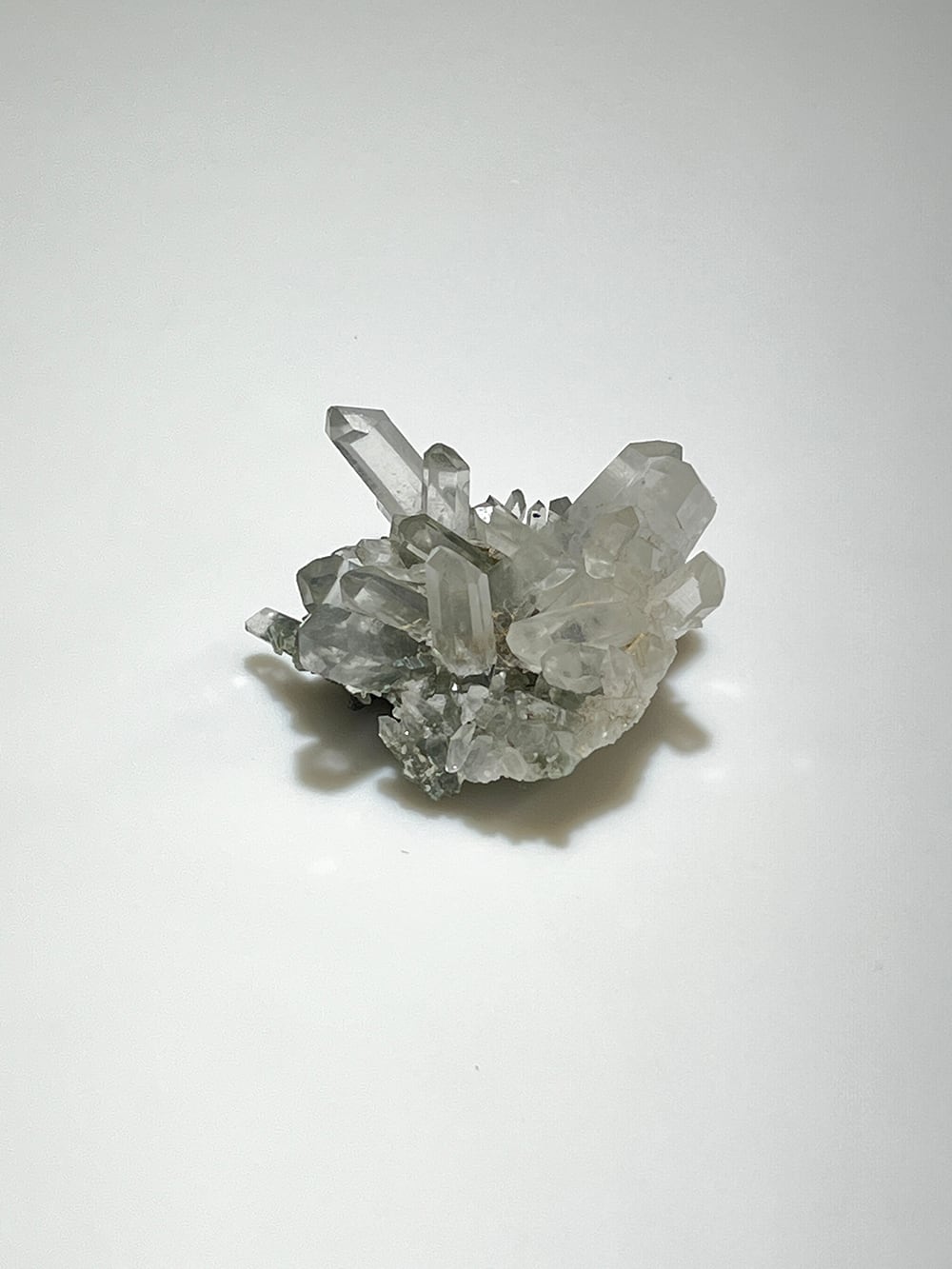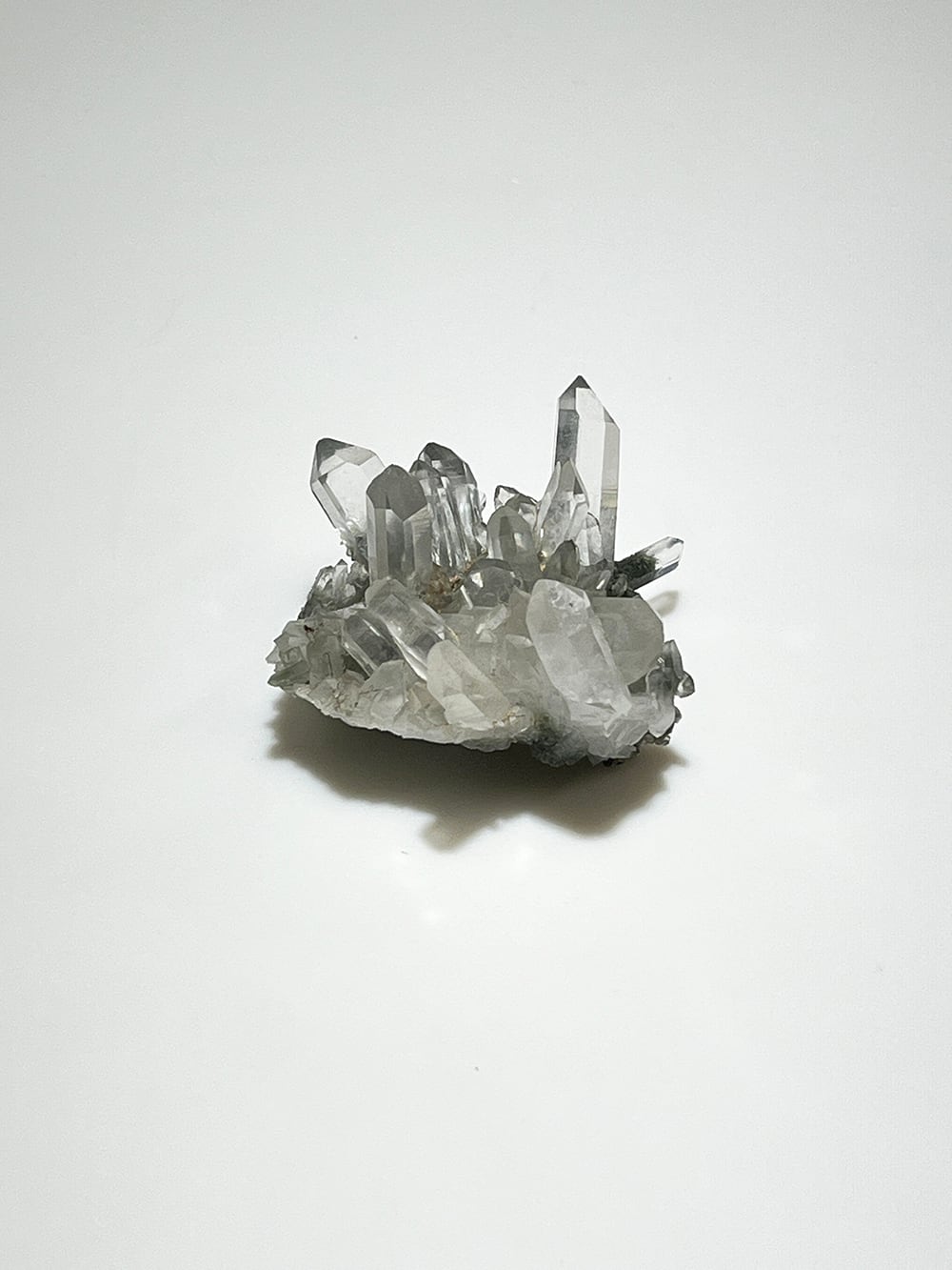 クローライトを内包したパキスタンのクォーツクラスター。パキスタンらしい少しグレーを帯びたクローライトとクォーツの相性がとても良いです。それぞれの結晶もダメージがなく綺麗な形をしており、とてもバランスの良いクラスターです。