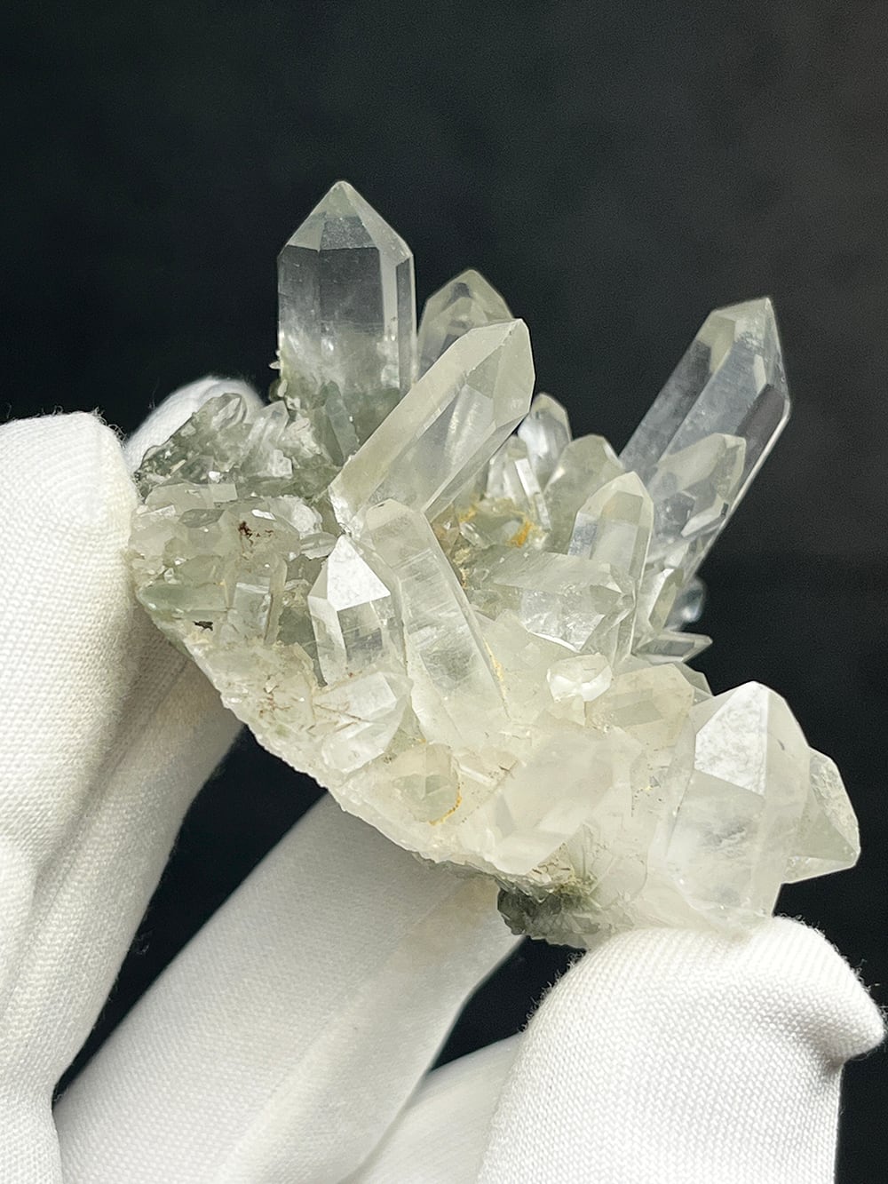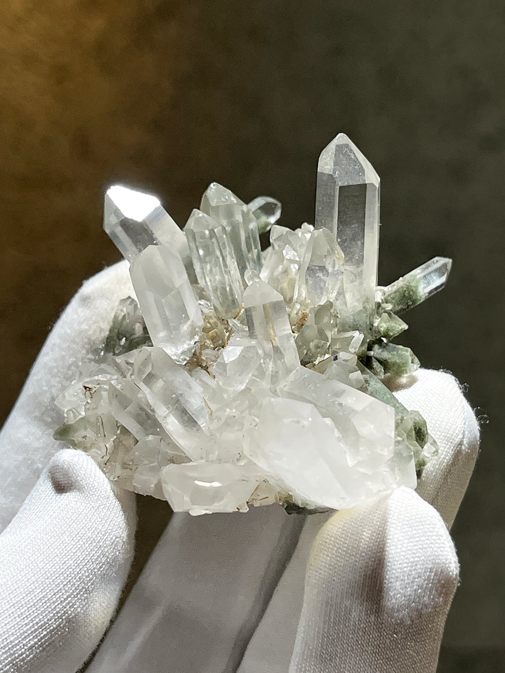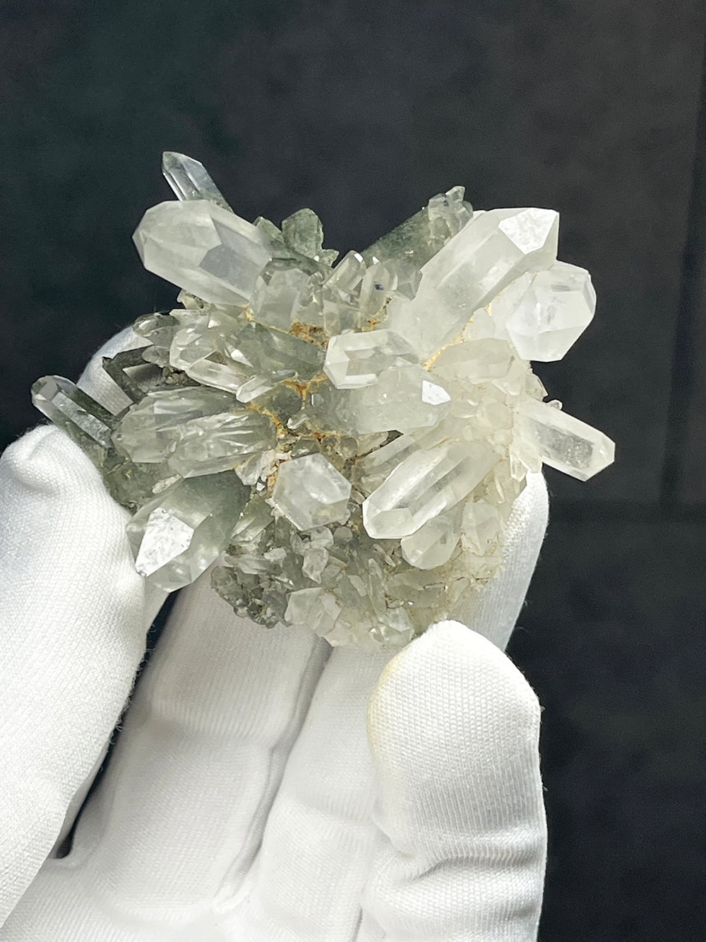 クローライトを内包したパキスタンのクォーツクラスター。パキスタンらしい少しグレーを帯びたクローライトとクォーツの相性がとても良いです。それぞれの結晶もダメージがなく綺麗な形をしており、とてもバランスの良いクラスターです。
