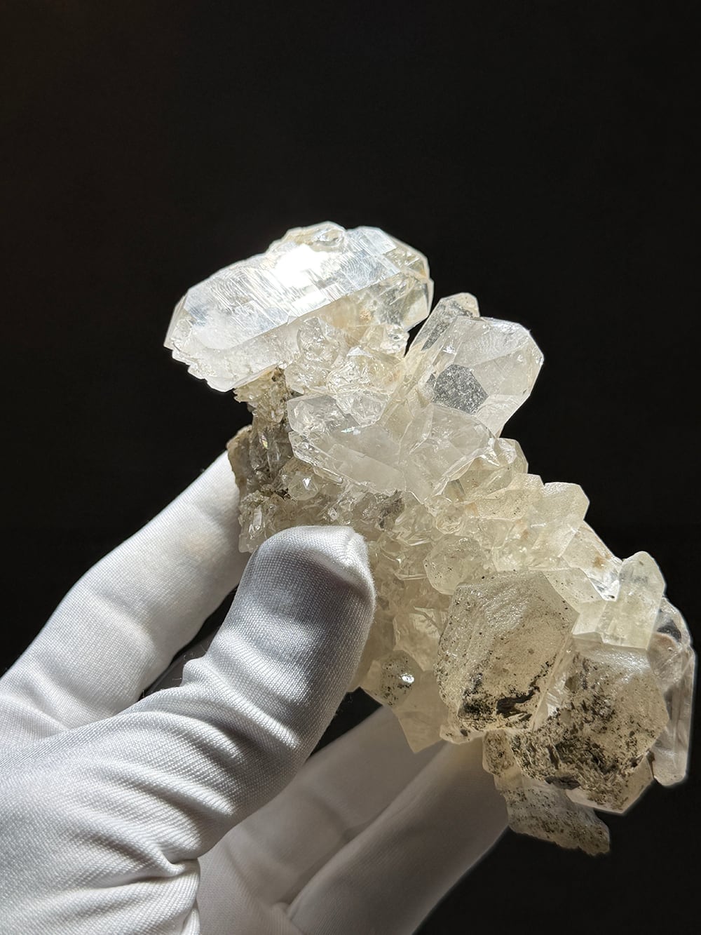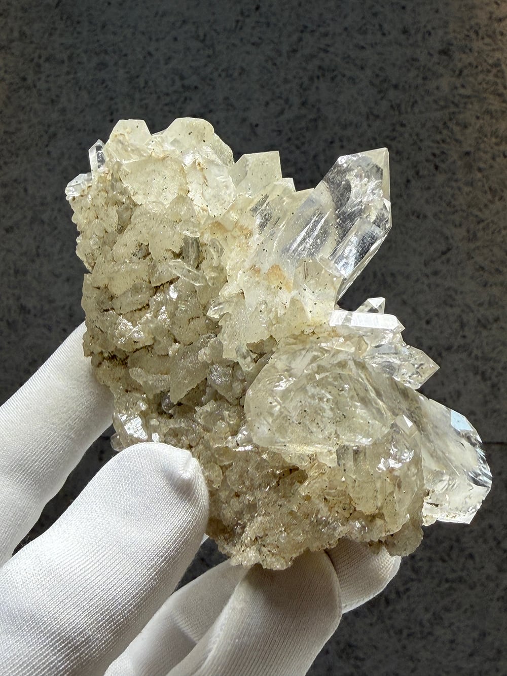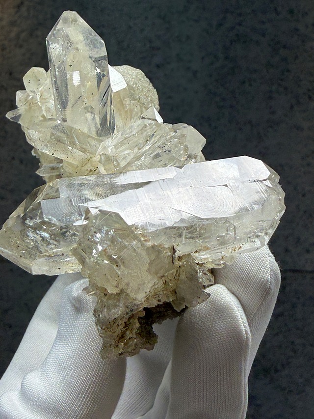 少しボリュームのあるインド産のクォーツクラスター。照りの美しい両剣のポイントや、他の鉱物に侵食されてマットになっているポイントなど、色々な表情を見ることができる美しいクラスターです。