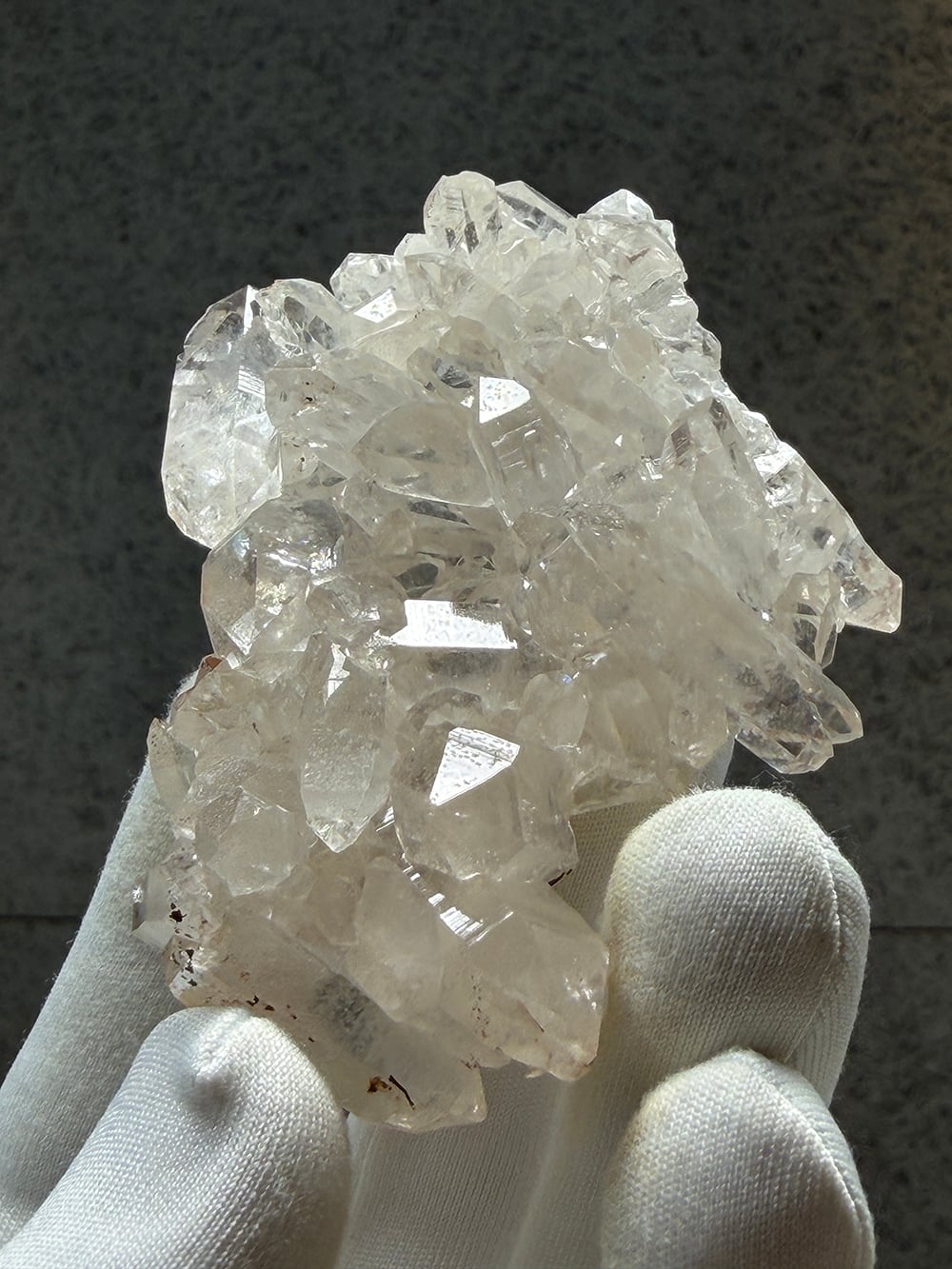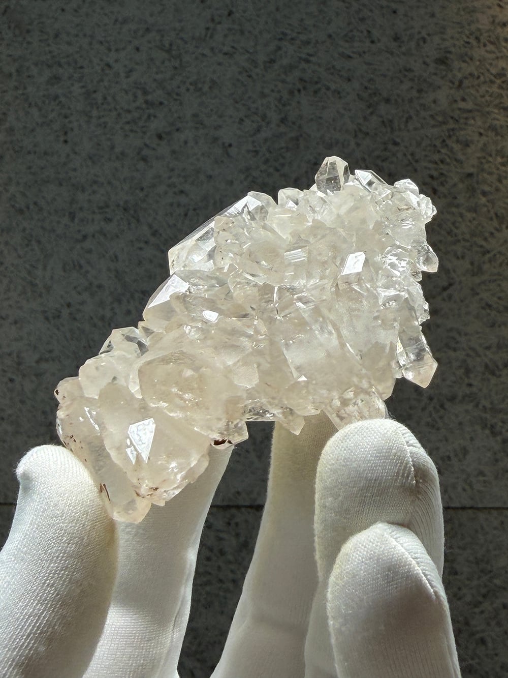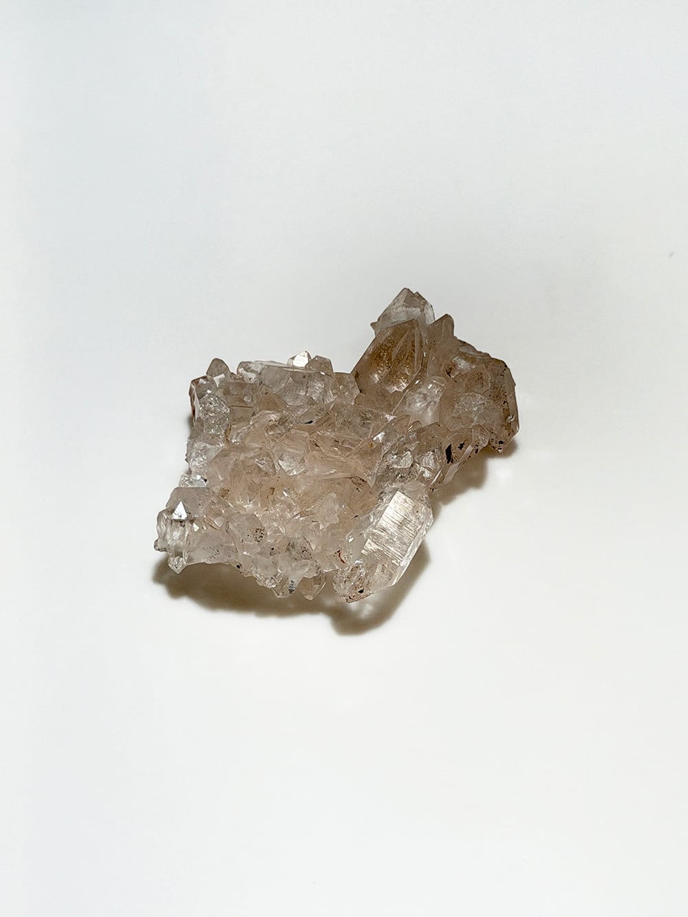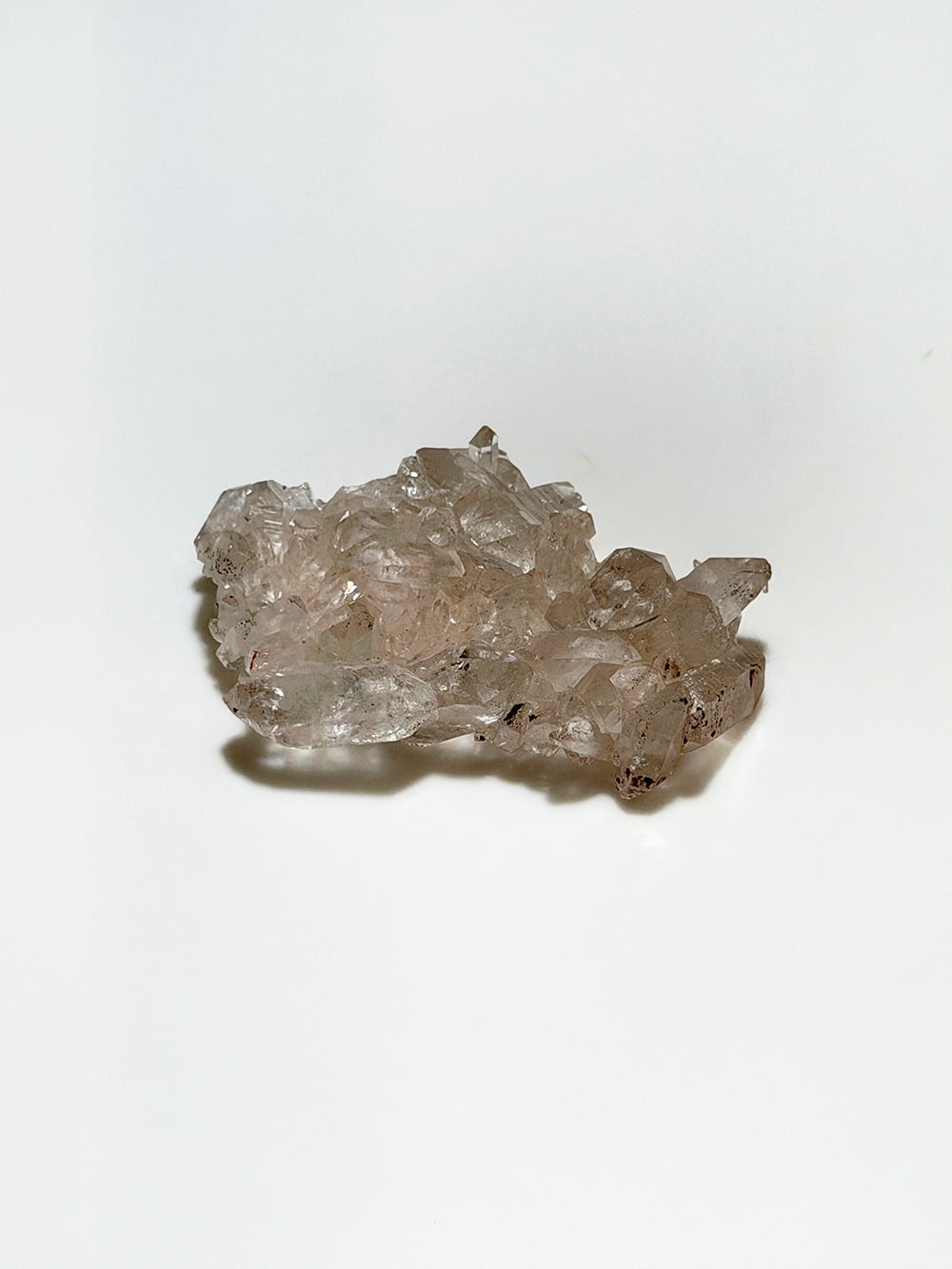 インド マニカラン産のクォーツクラスター。ほんの少しピンクカラーで、光を透過するととても美しい表情です。向こう側が透けて見えるようなフラットなタイプのクラスターです。
