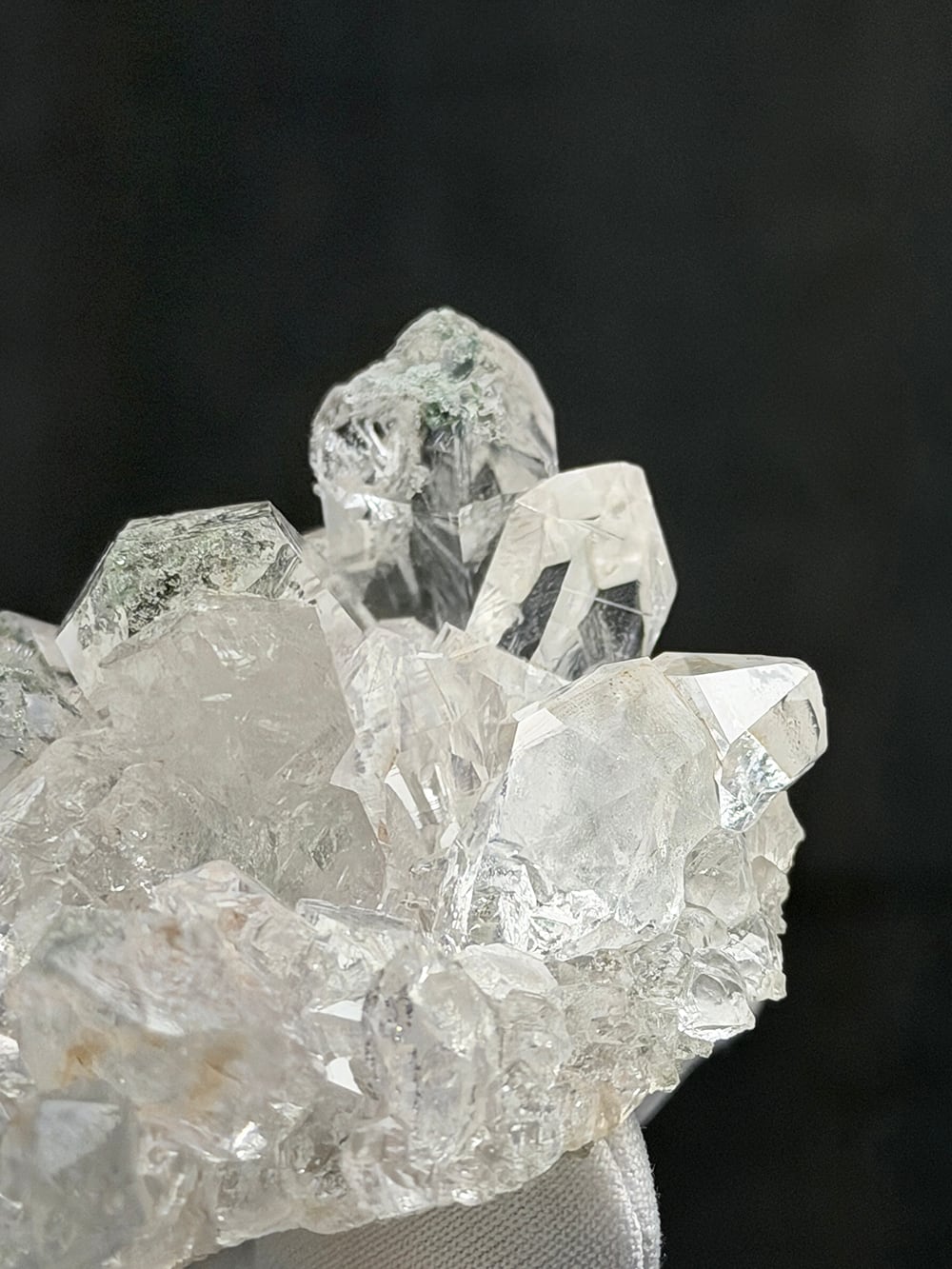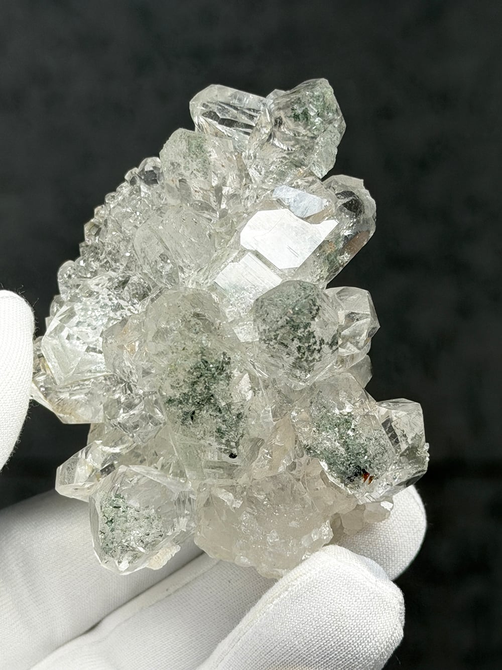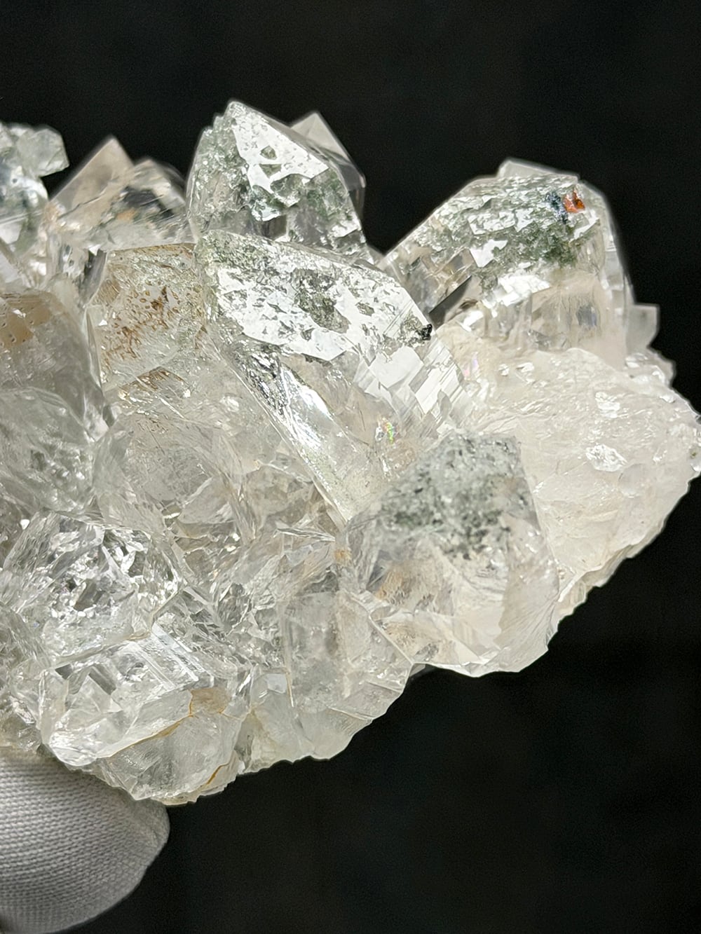 とても透明度が高く美しいクラスター。マニハール産の特徴とも言えるクローライトとアナテースも共生しています。手のひらサイズのちょうど良い大きさも◎な一点です。