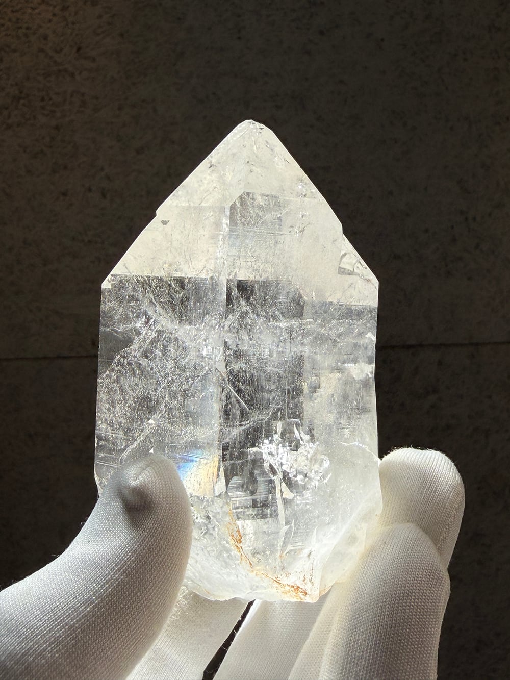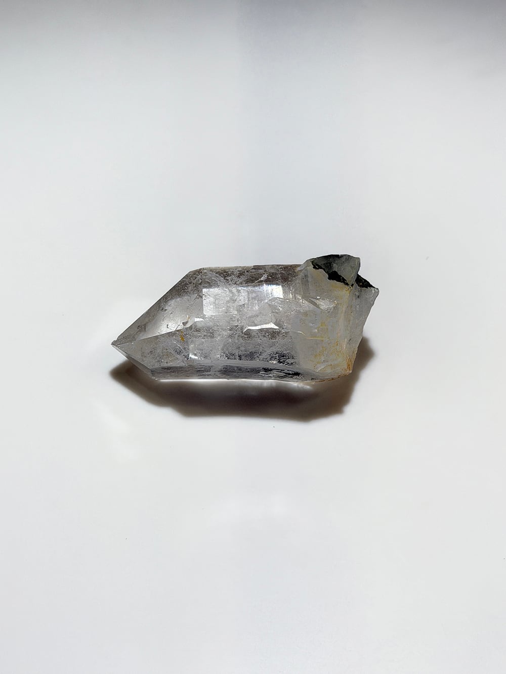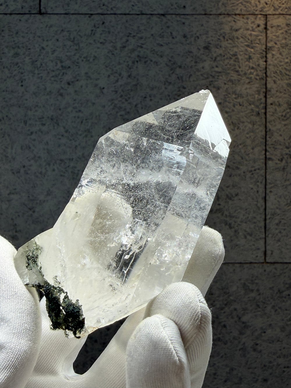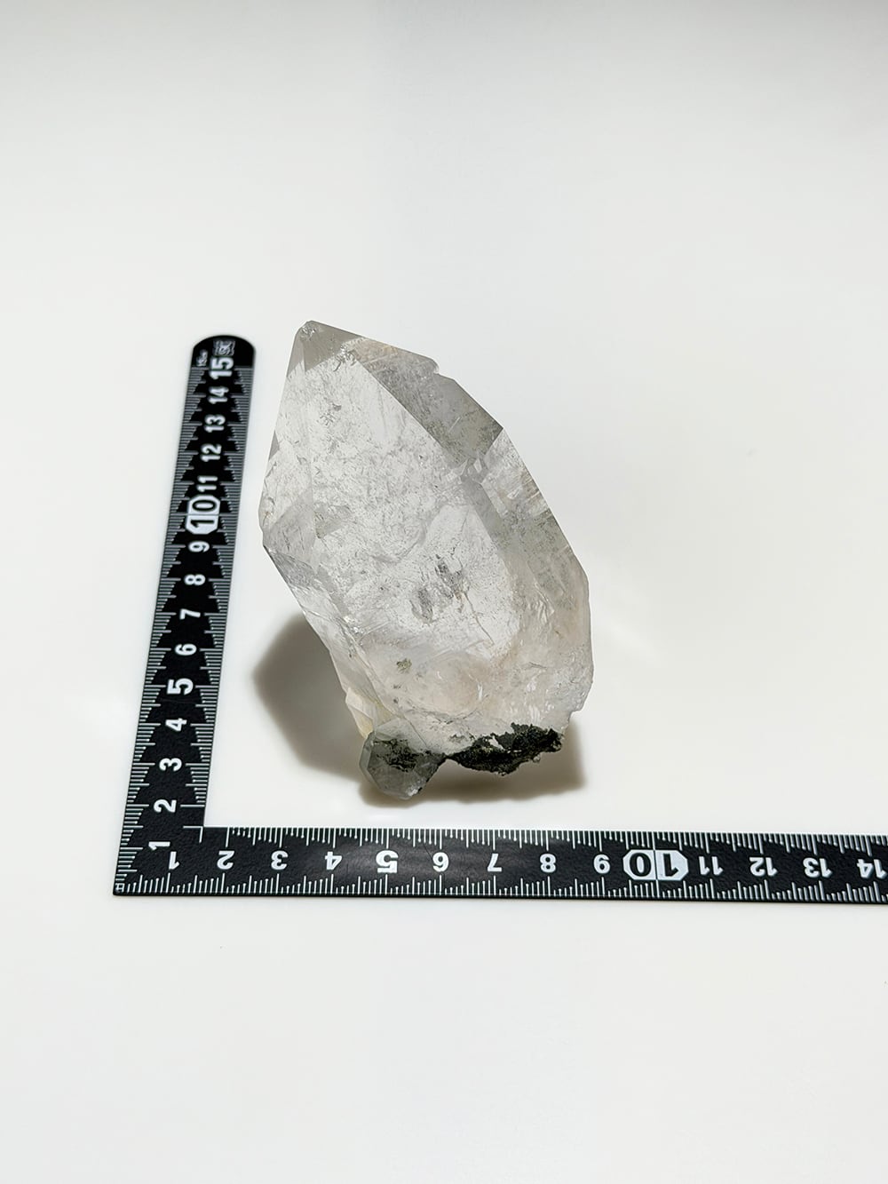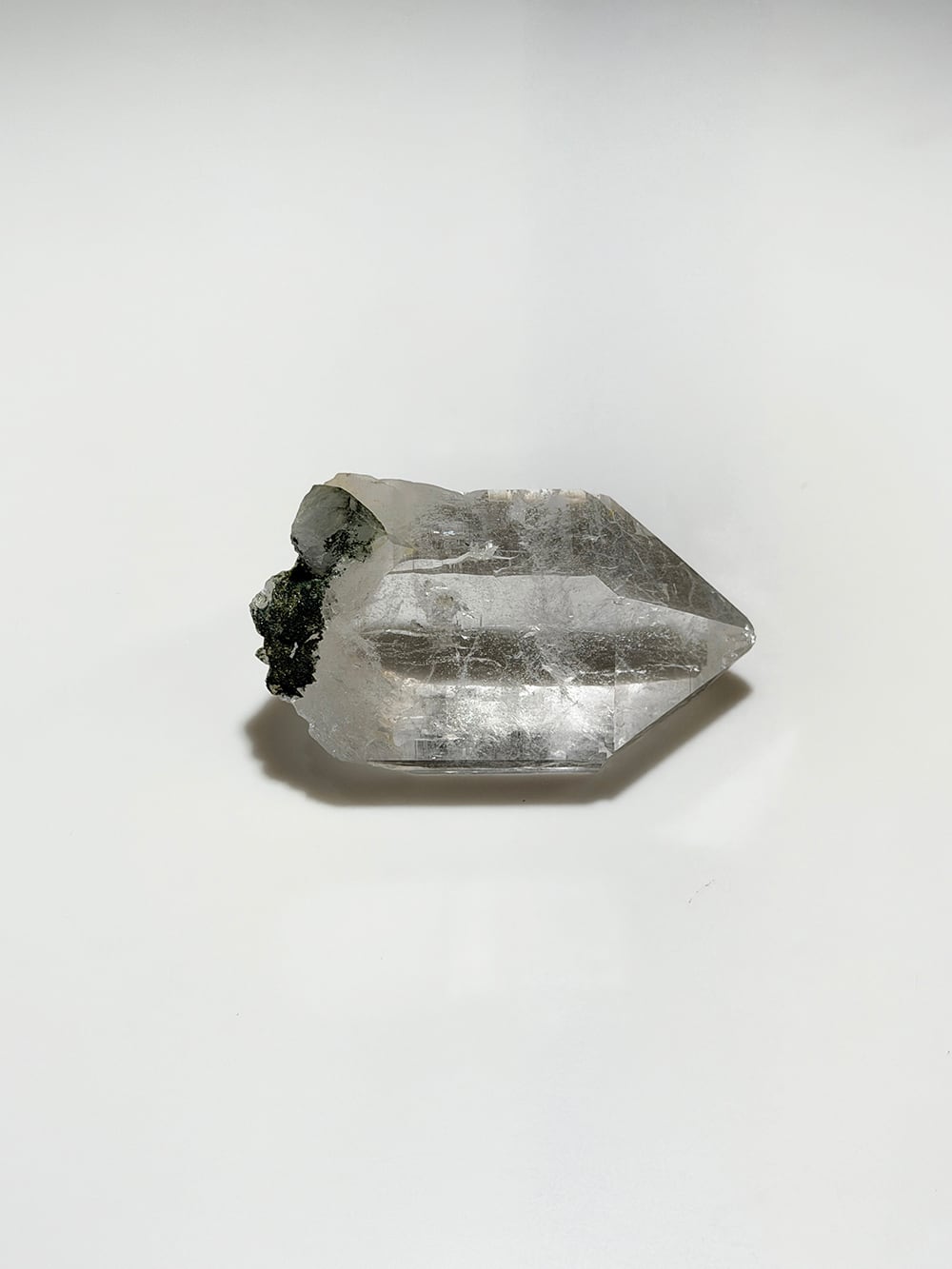 とてもクリアで大きめのクオーツの単結晶。エッジもとても綺麗に残っており、表面の照りも素晴らしいです。手のひらに乗せると丁度いいボリューム感と重さがあり、中を覗くと幻想的に散りばめられた気泡を眺めることができます。少しだけ付着しているクローライトのアクセントや、絶妙な角度で置くことが出来るのも◎です。