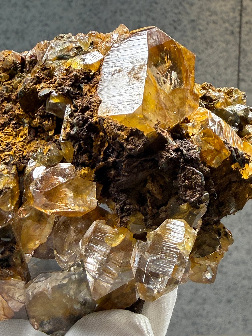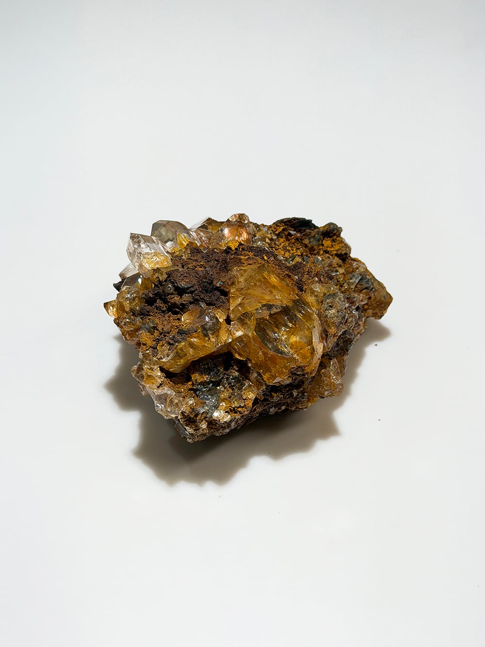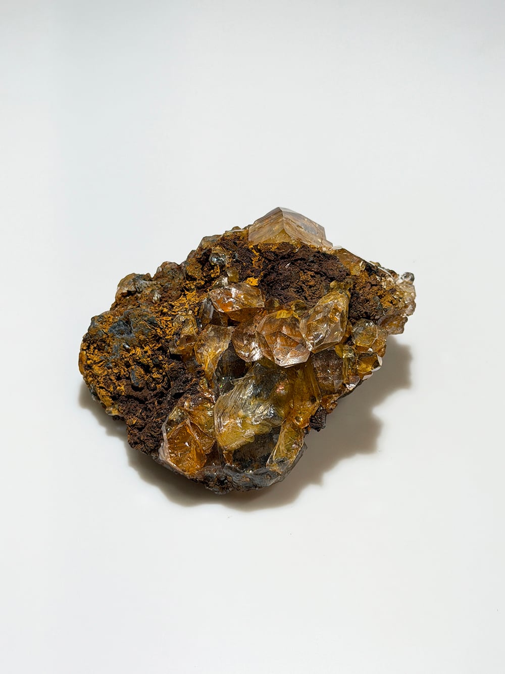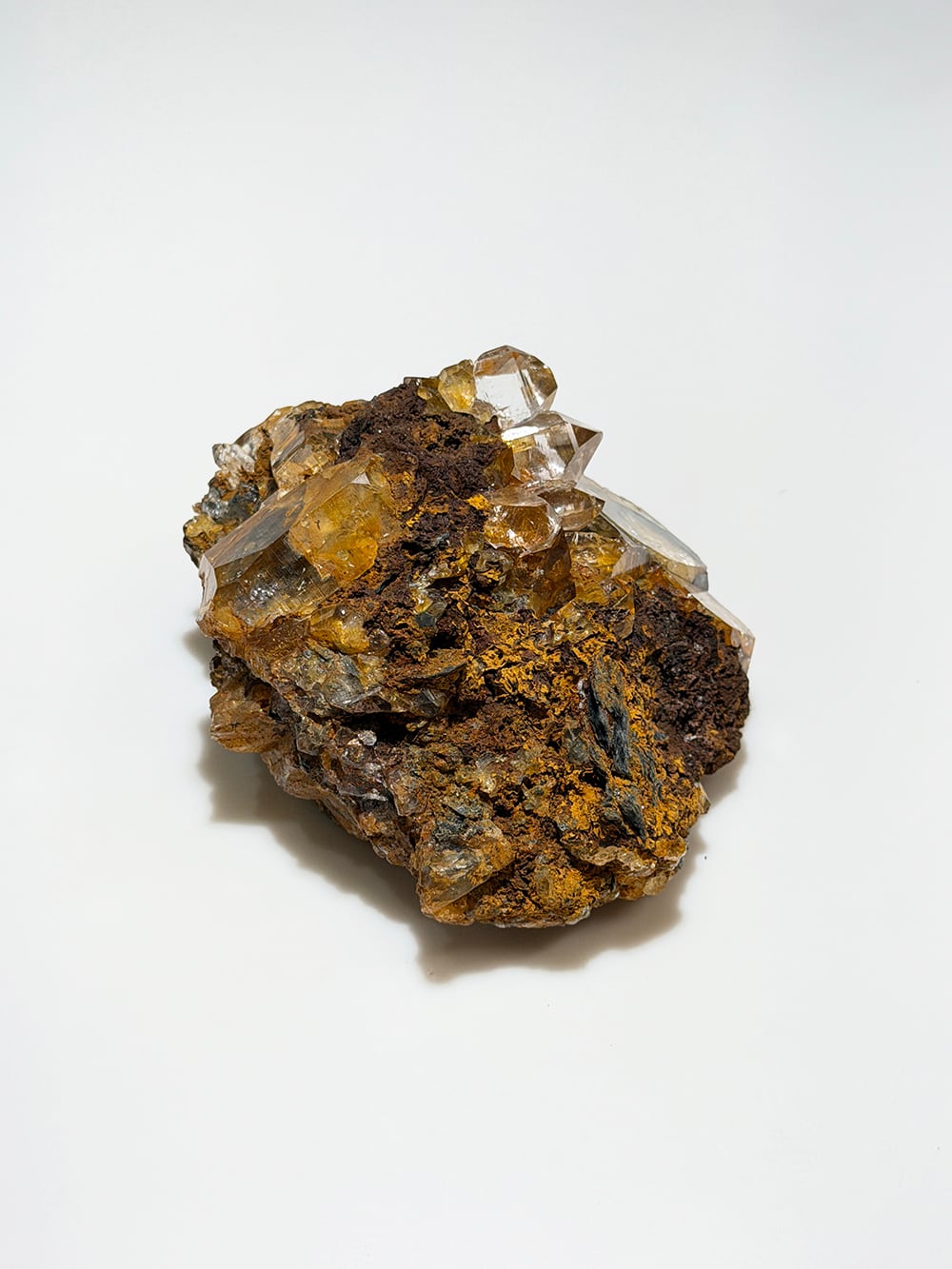 リモナイト(褐鉄鉱)を表面と水晶の中に閉じ込めたクォーツ。そのリモナイトを纏った独特な雰囲気と、クォーツの透明感と照りのコントラストが美しい鉱物です。細かな表面のテクスチャーとクォーツに内包されたリモナイトを覗き込むと、まるで別世界に居るかのような景色を眺めることができます。