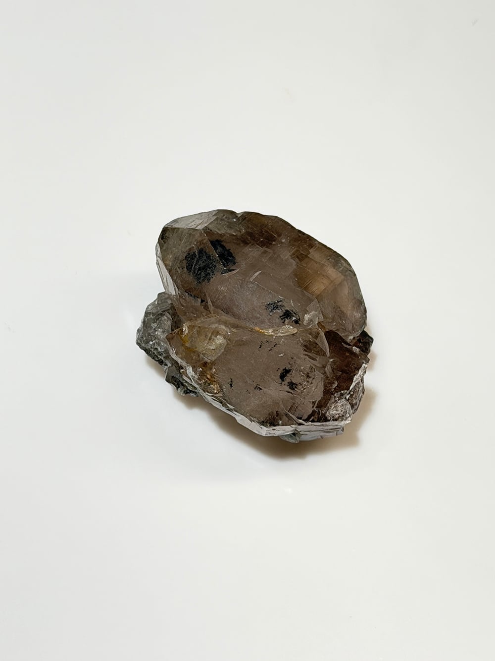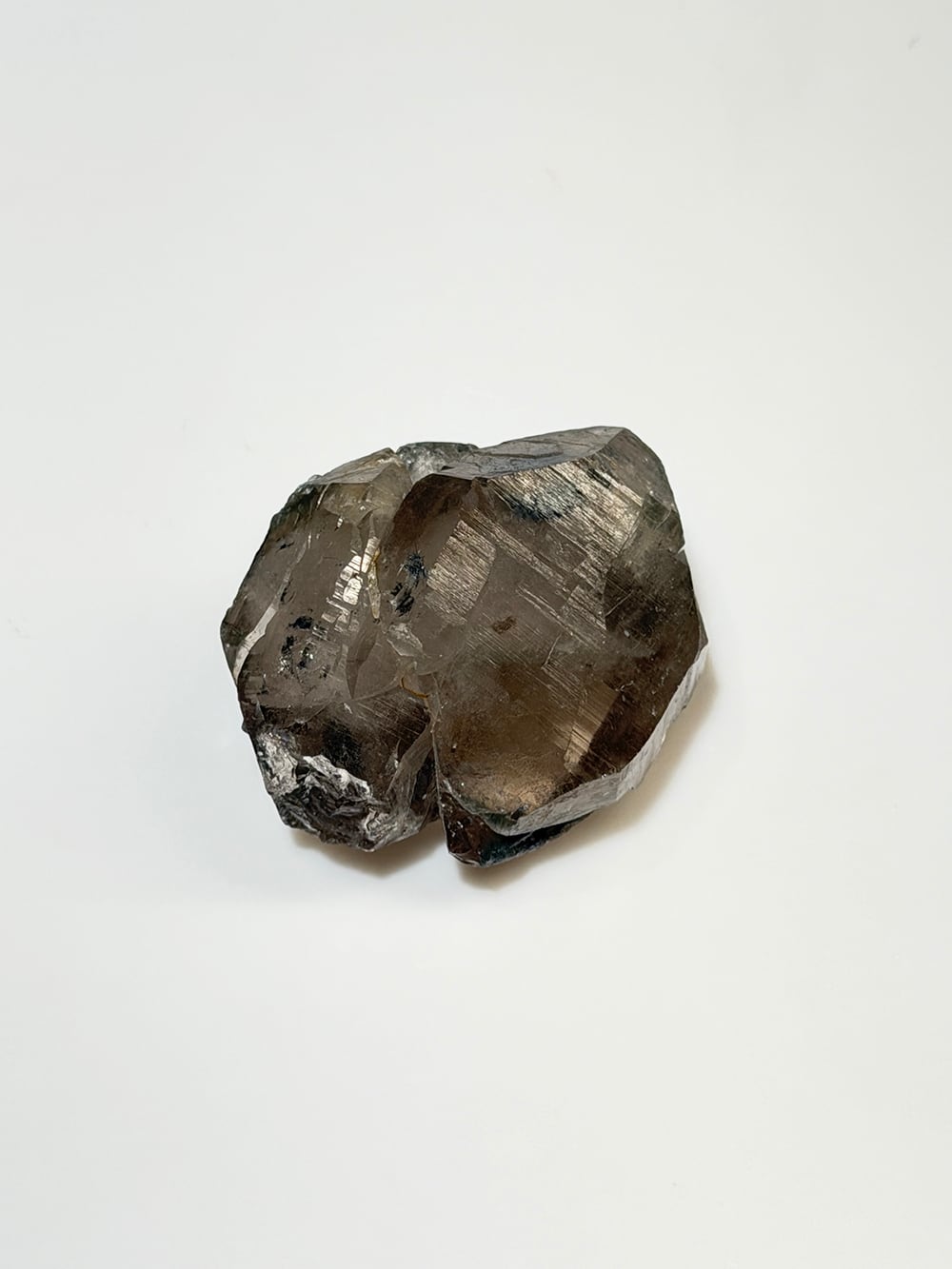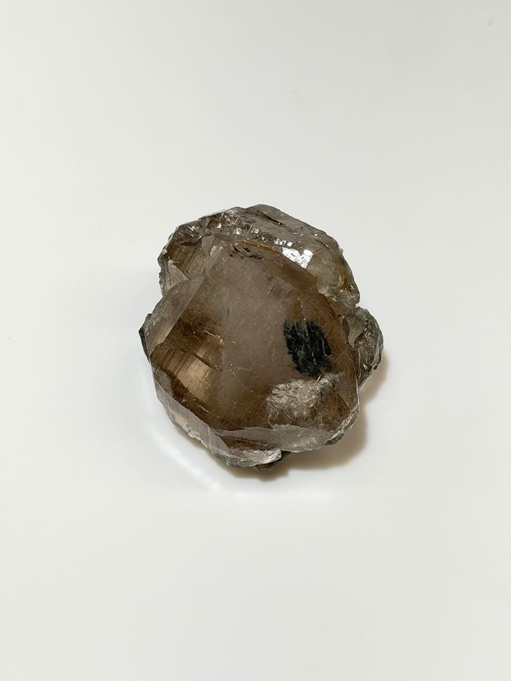 少しクローライトを中に内包したスモーキークォーツ。手のひらサイズのボリュームに、照りも良い一点です。一番大きな結晶にグインデルクォーツ(Gwindel:ねじれ水晶)の特徴が見られますが、断定はできない程度の現れ方です。色も形もユニークなクォーツです。