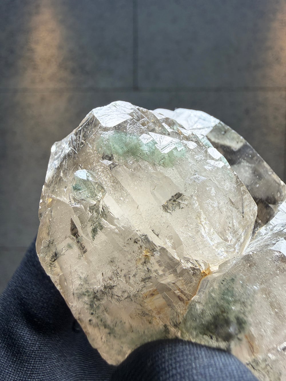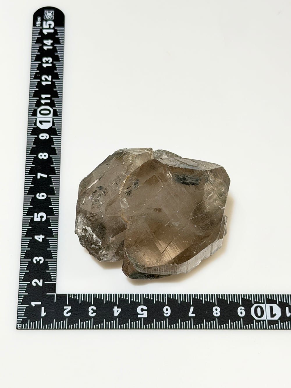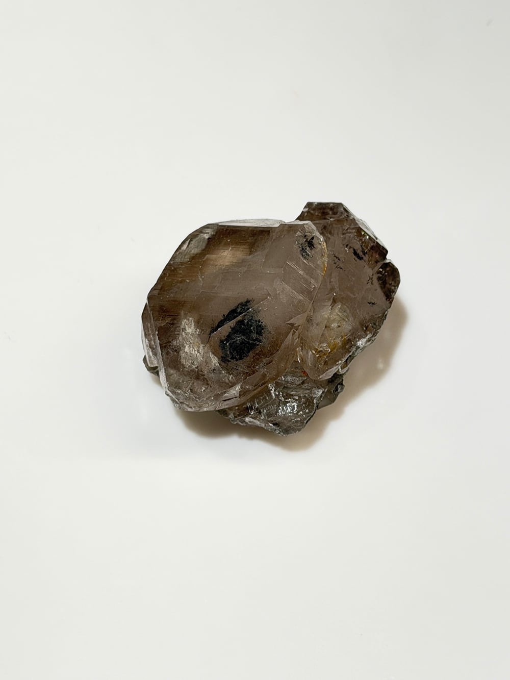 少しクローライトを中に内包したスモーキークォーツ。手のひらサイズのボリュームに、照りも良い一点です。一番大きな結晶にグインデルクォーツ(Gwindel:ねじれ水晶)の特徴が見られますが、断定はできない程度の現れ方です。色も形もユニークなクォーツです。