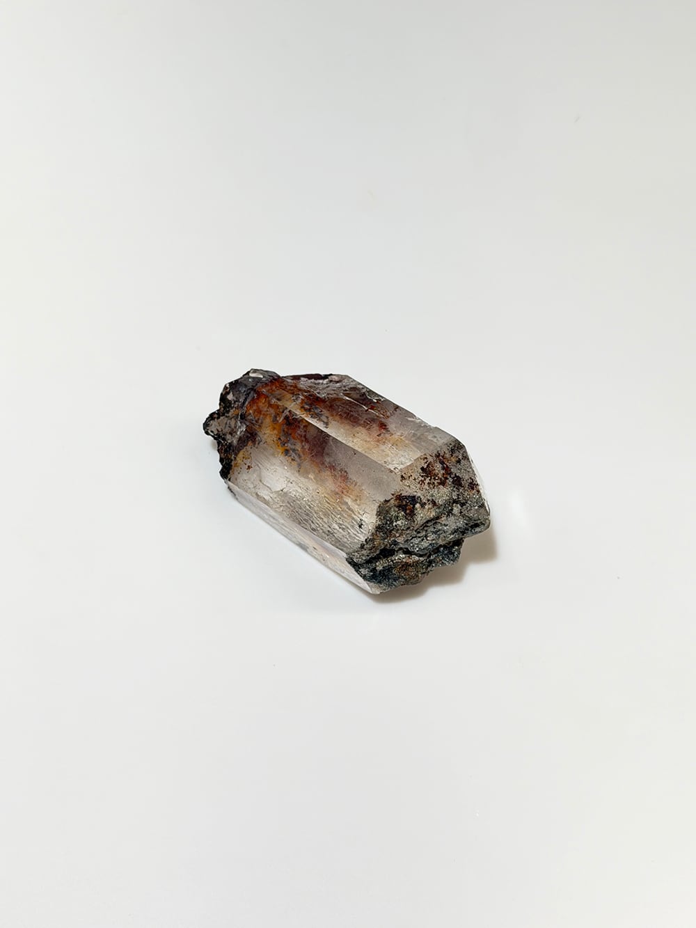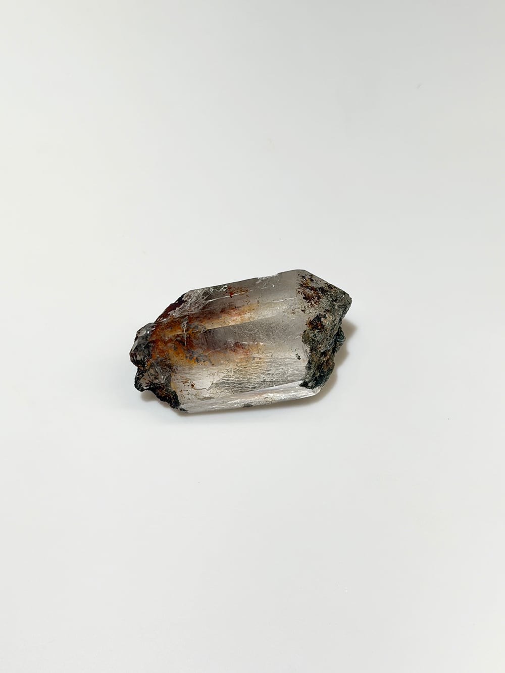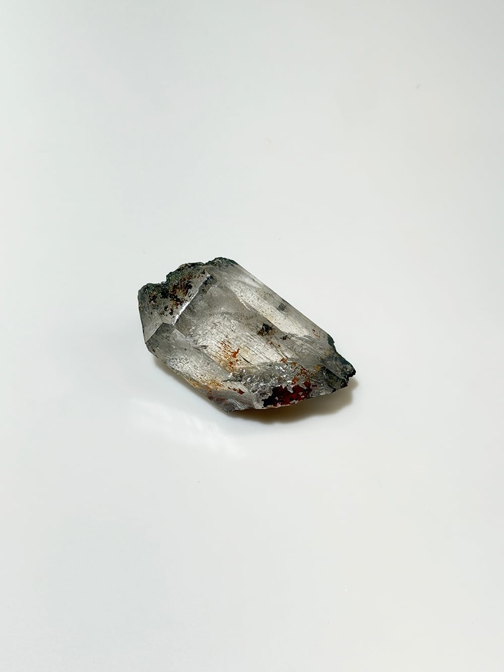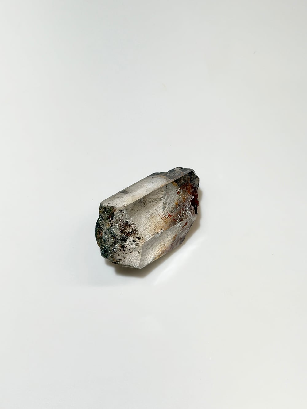 少し特徴的な色合いのインド産クォーツ。断定は出来ませんが、おそらくクローライトのダークグリーンと、ヘマタイトやサンドのブラウンが混ざっています。クォーツの透明度が高く照りも美しいので、共生鉱物とのコントラストがとても個性的です。単結晶の中に一つの世界が出来上がっています。