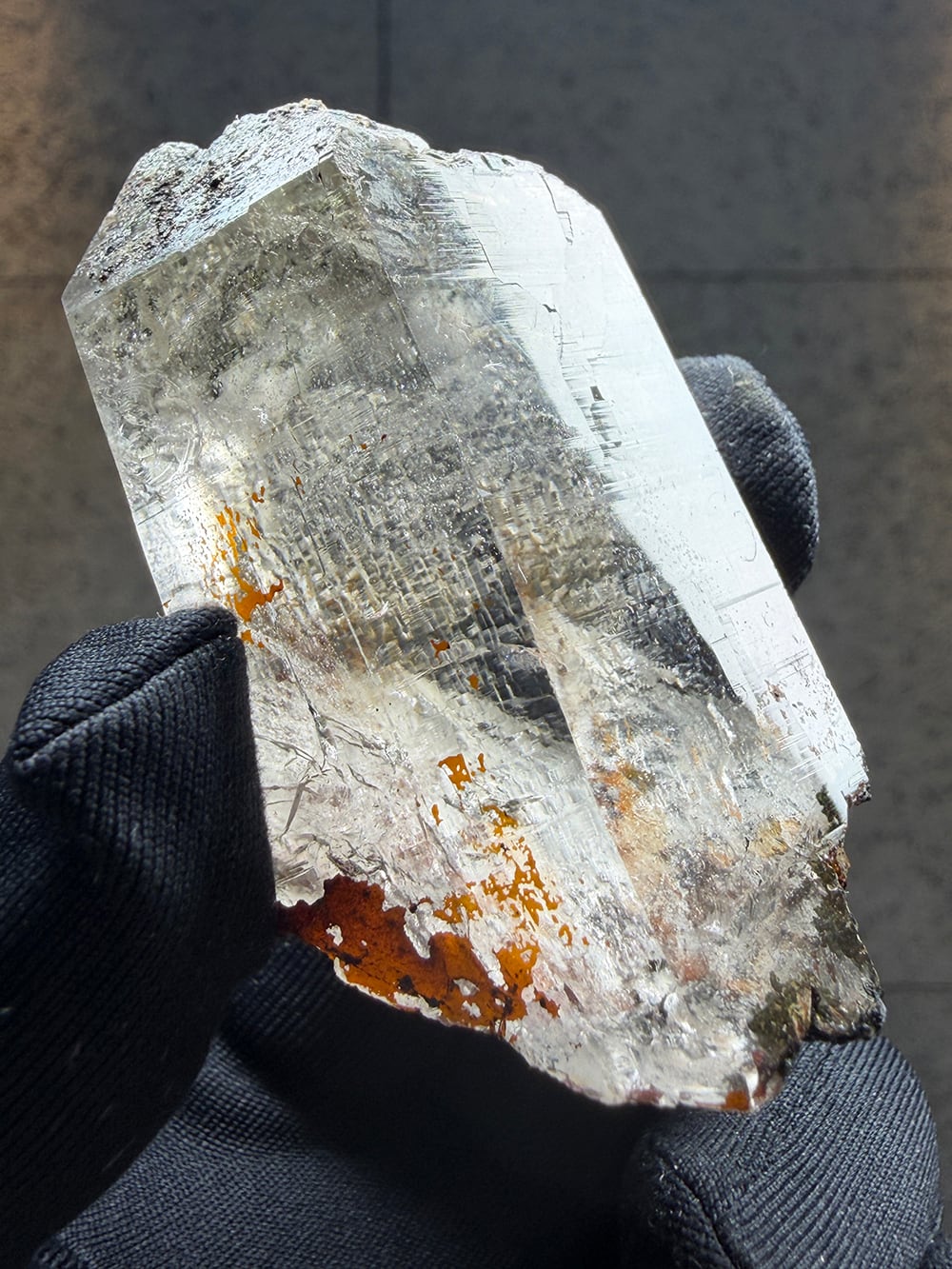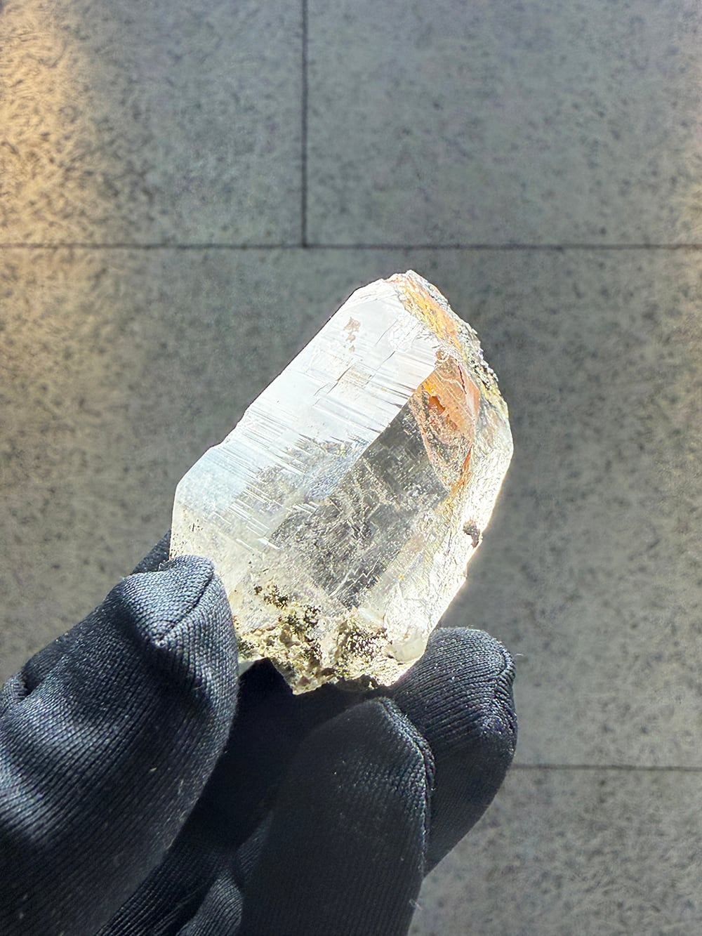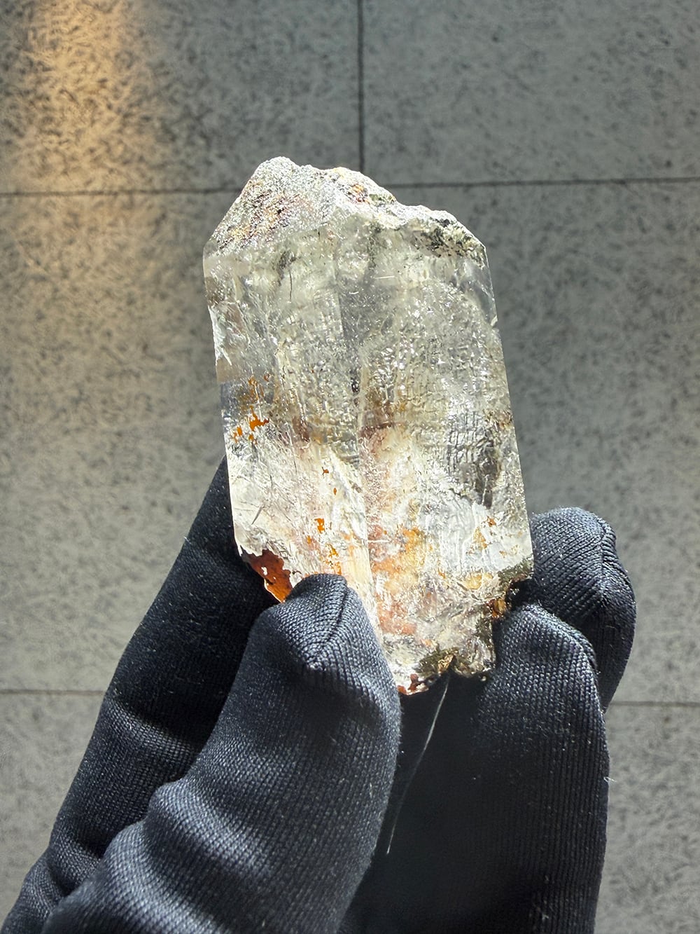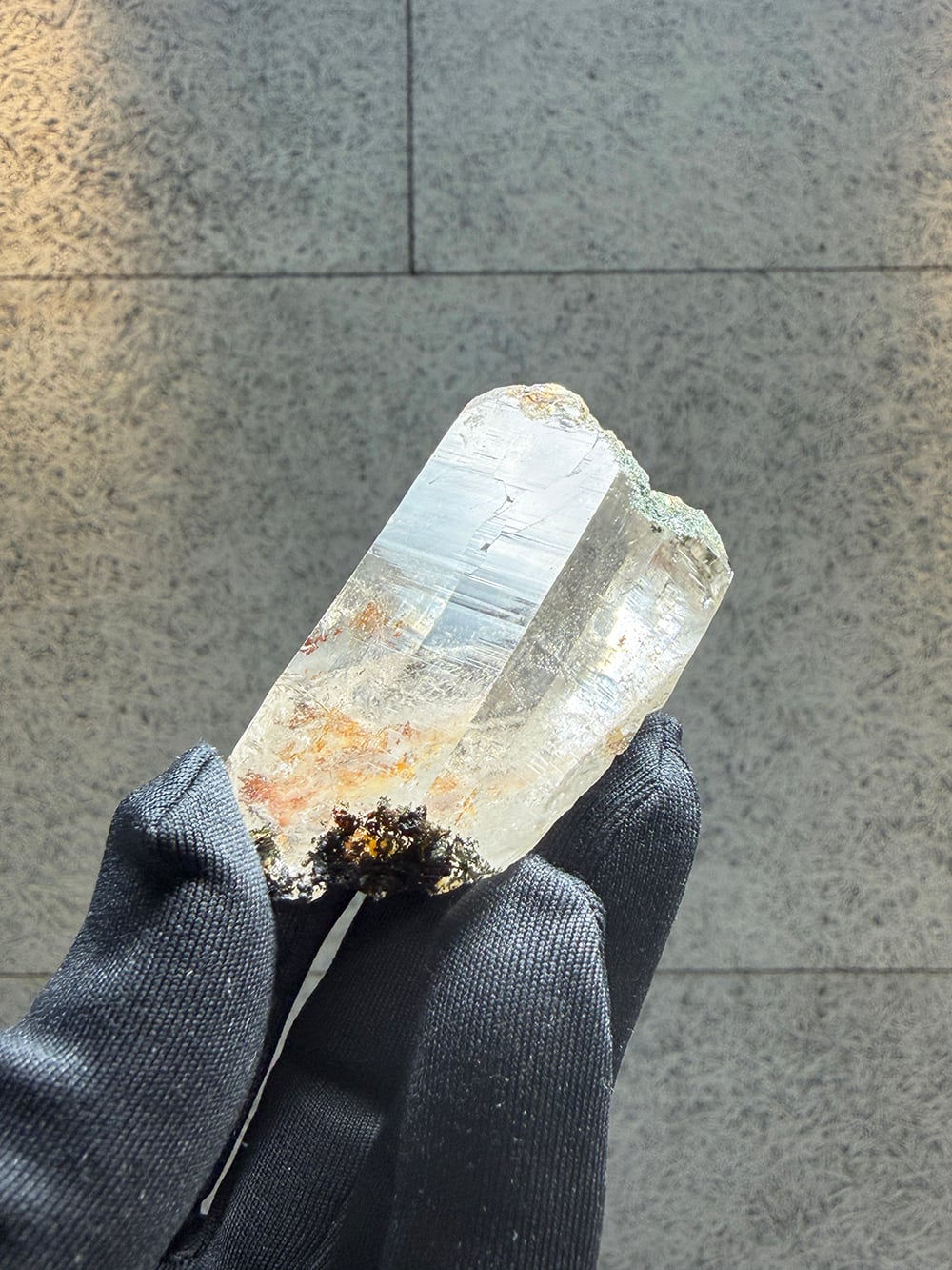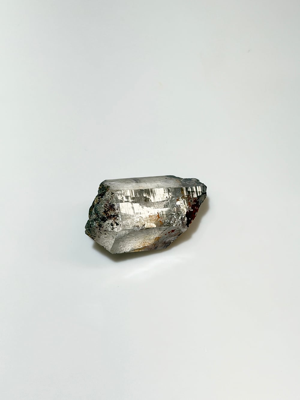 少し特徴的な色合いのインド産クォーツ。断定は出来ませんが、おそらくクローライトのダークグリーンと、ヘマタイトやサンドのブラウンが混ざっています。クォーツの透明度が高く照りも美しいので、共生鉱物とのコントラストがとても個性的です。単結晶の中に一つの世界が出来上がっています。