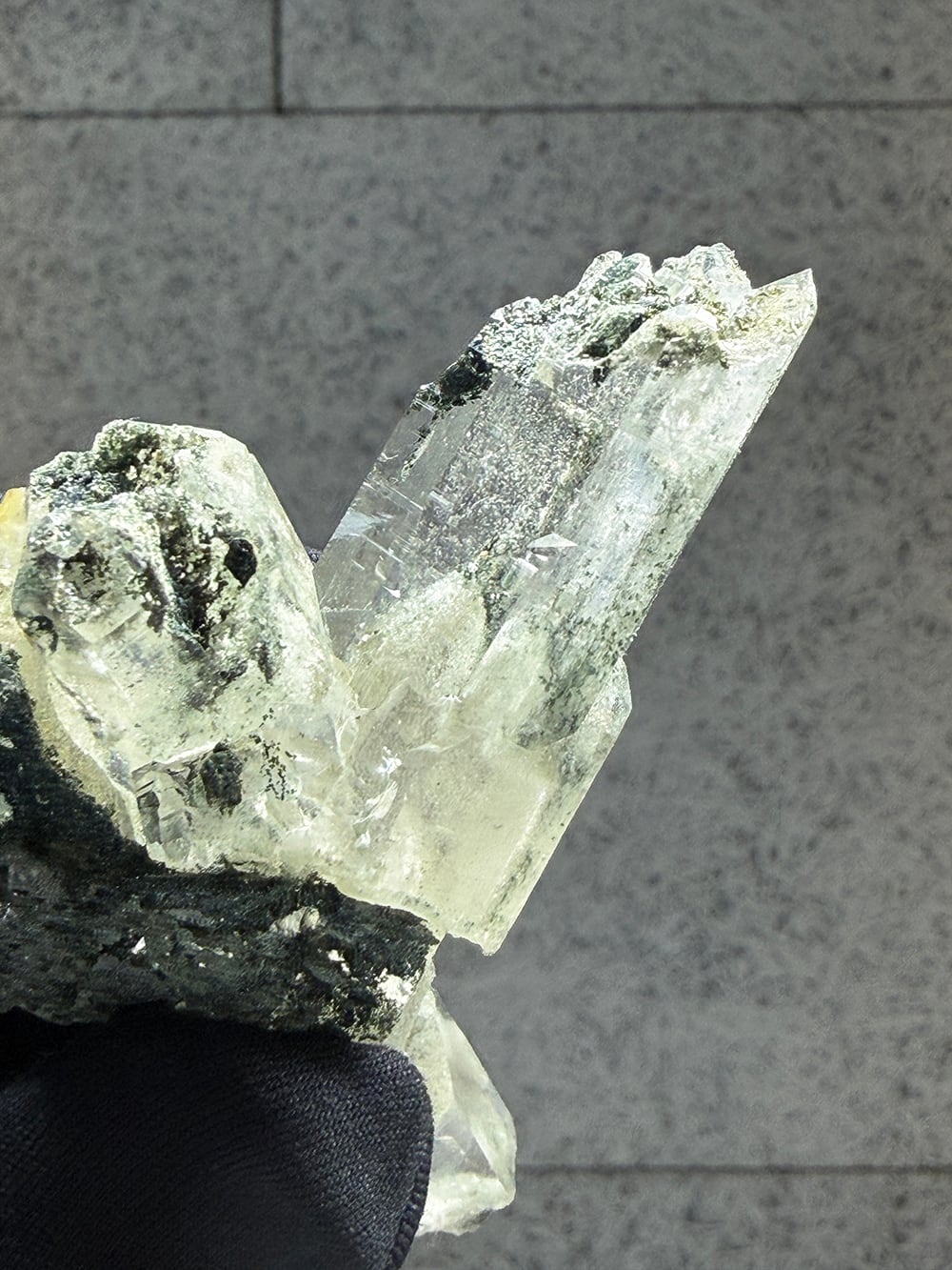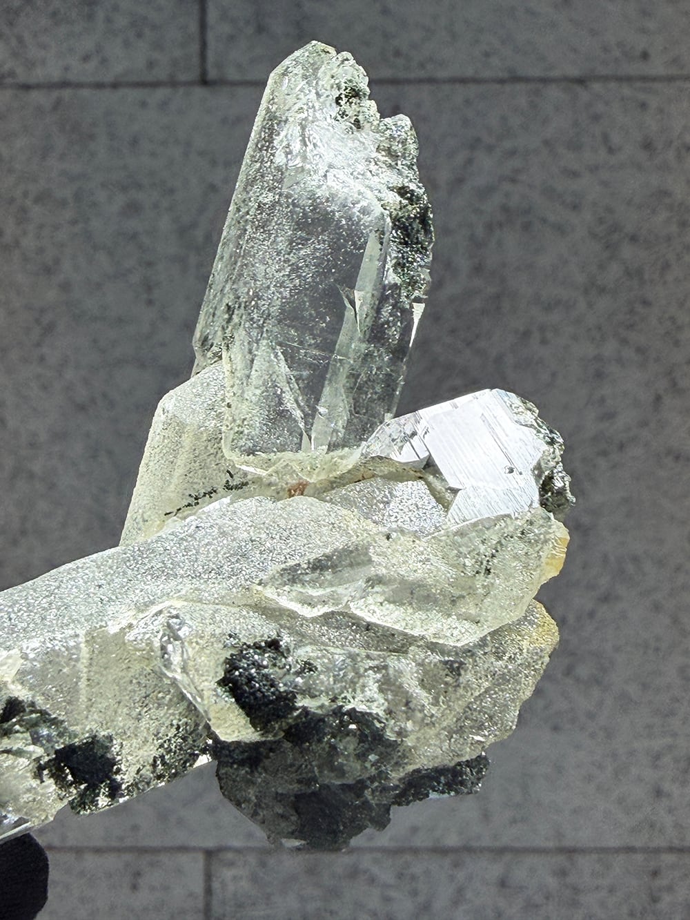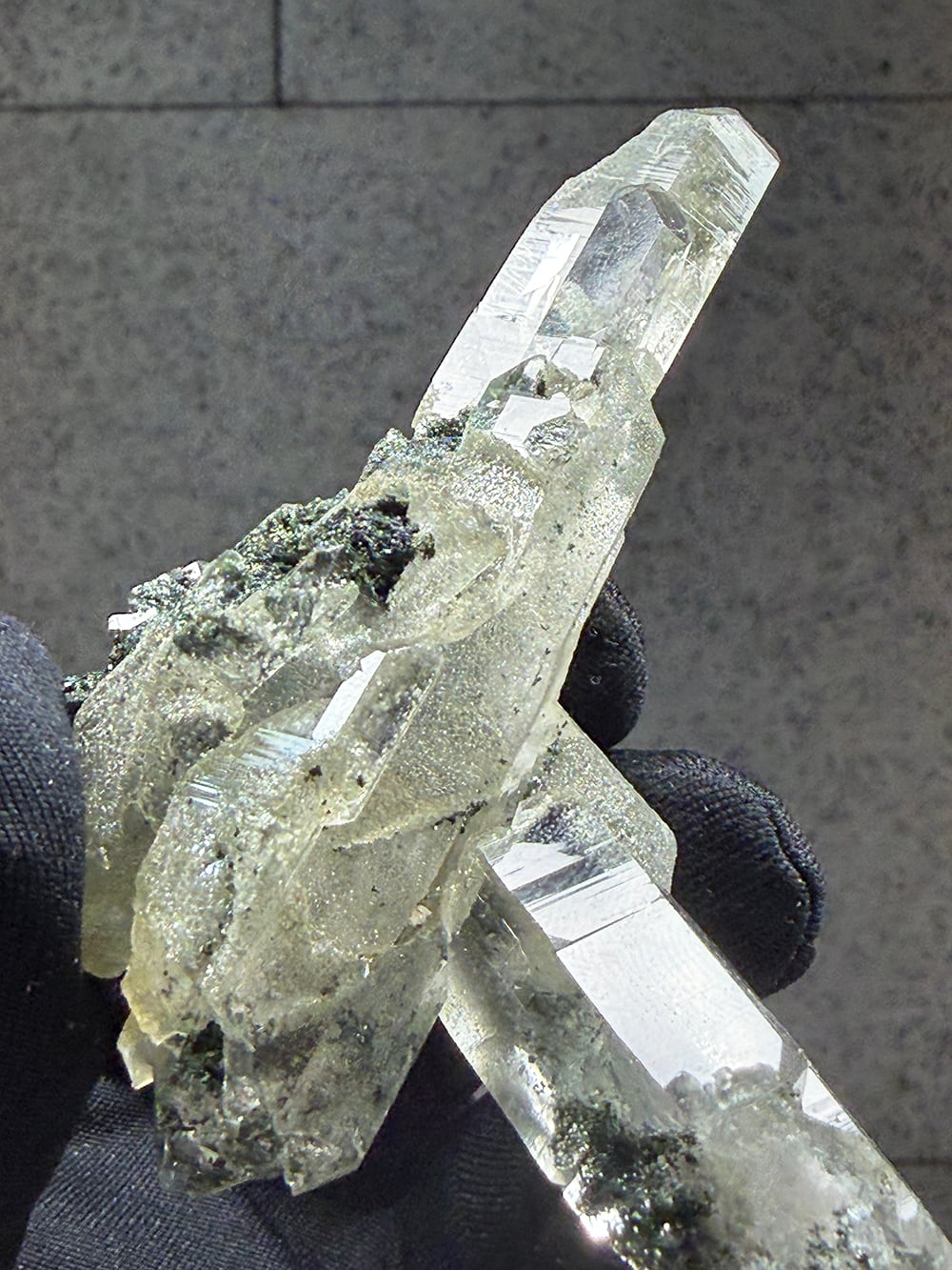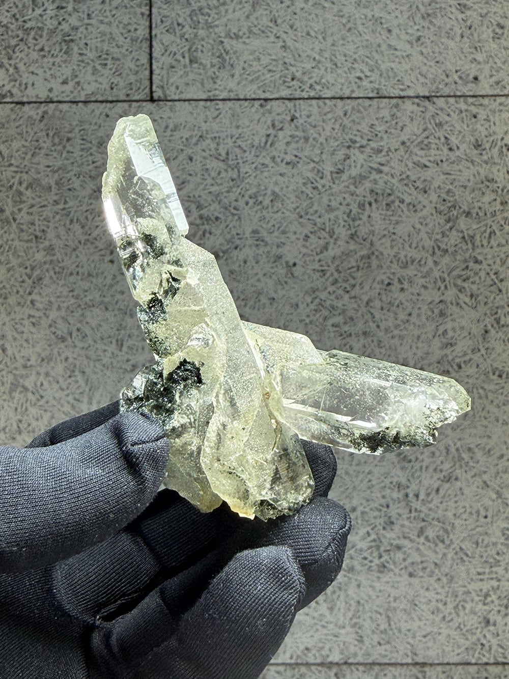 絶妙なバランスで生成されており、とても趣深いクラスター。【ML-0073】と同じ場所から採掘されたと思われますが、同じ特徴としてクローライトの付着で表面が梨地になっていて、面白い質感のコントラストが作られています。この2点を並べて飾るのがかなりオススメです。