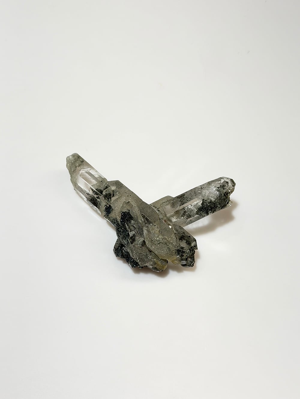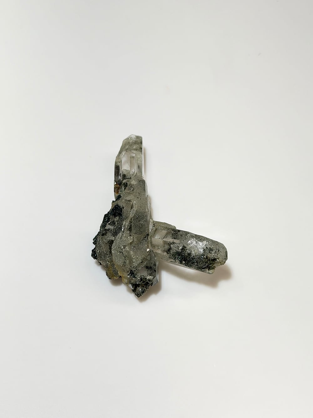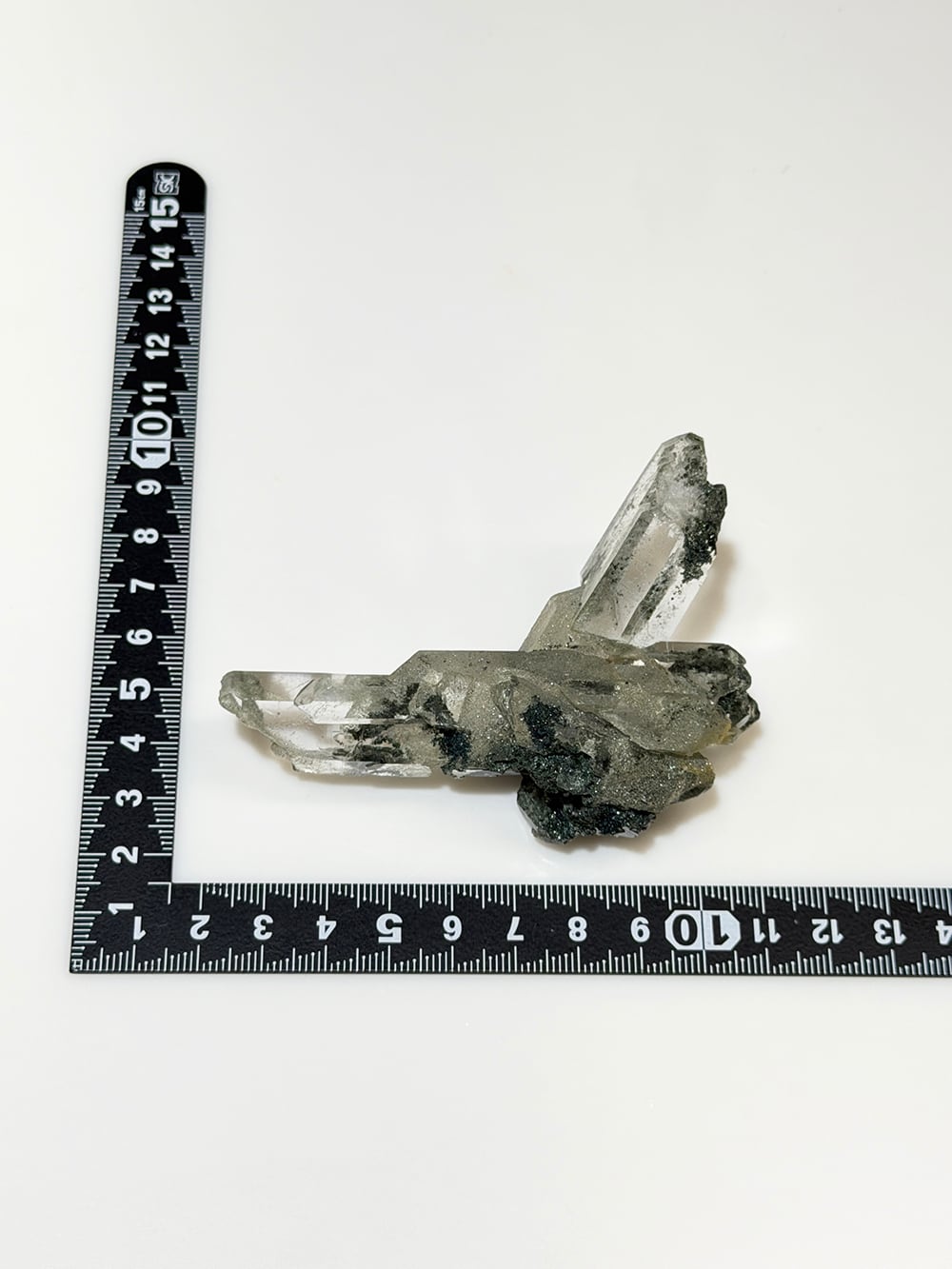 絶妙にクォーツが入り組んだクラスター。色の濃いグリーンのクローライトが表面を侵食し、水晶内部にも取り込まれガーデンクォーツになっています。