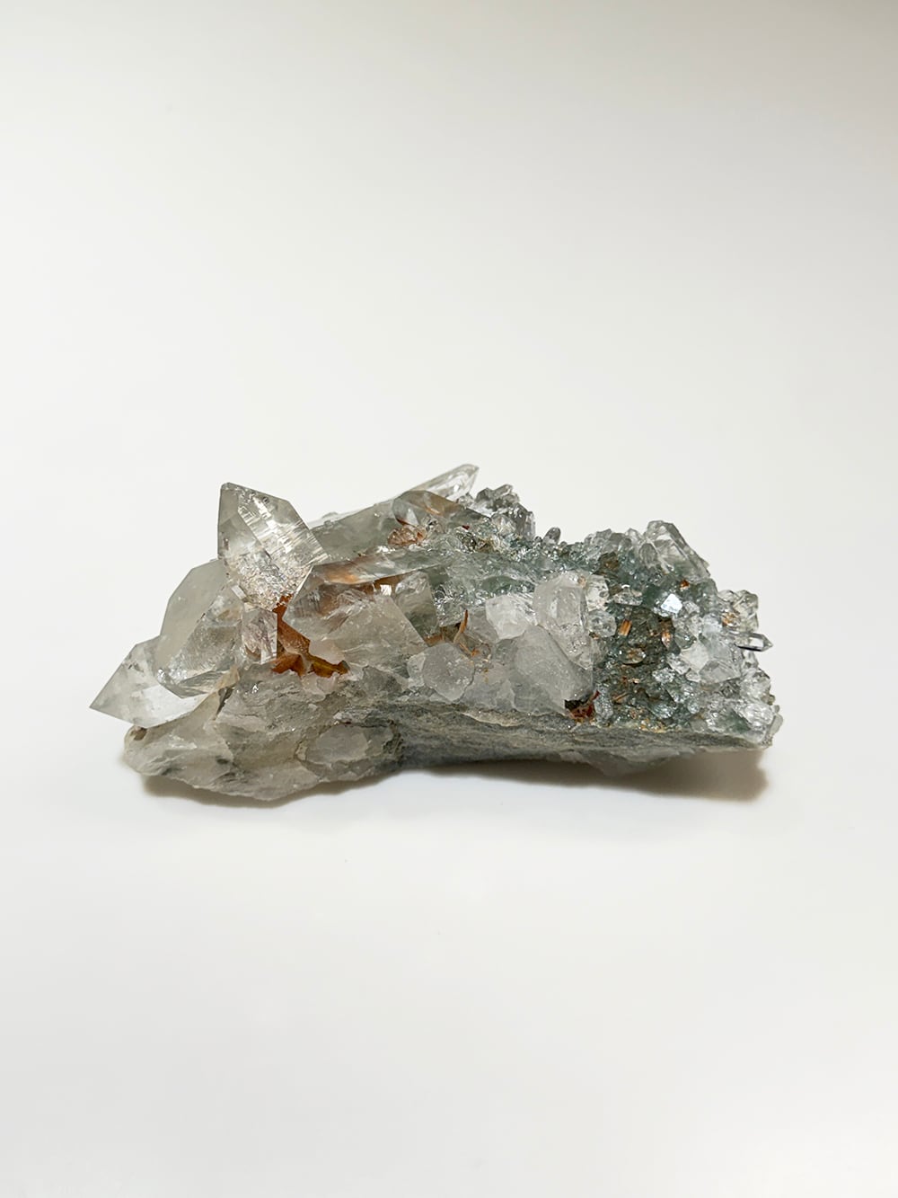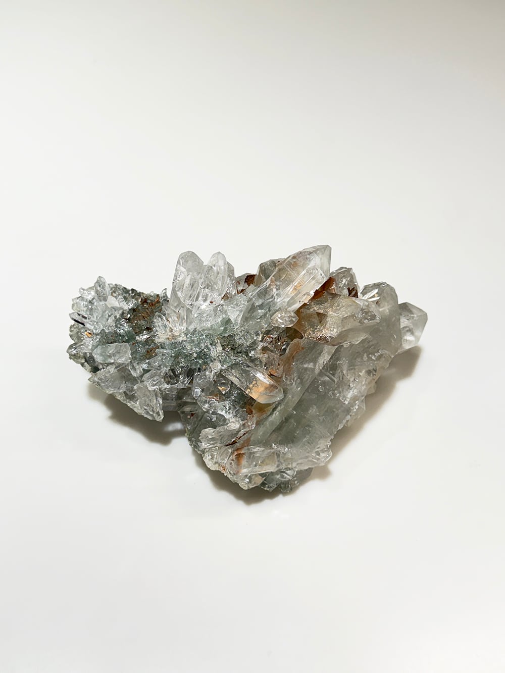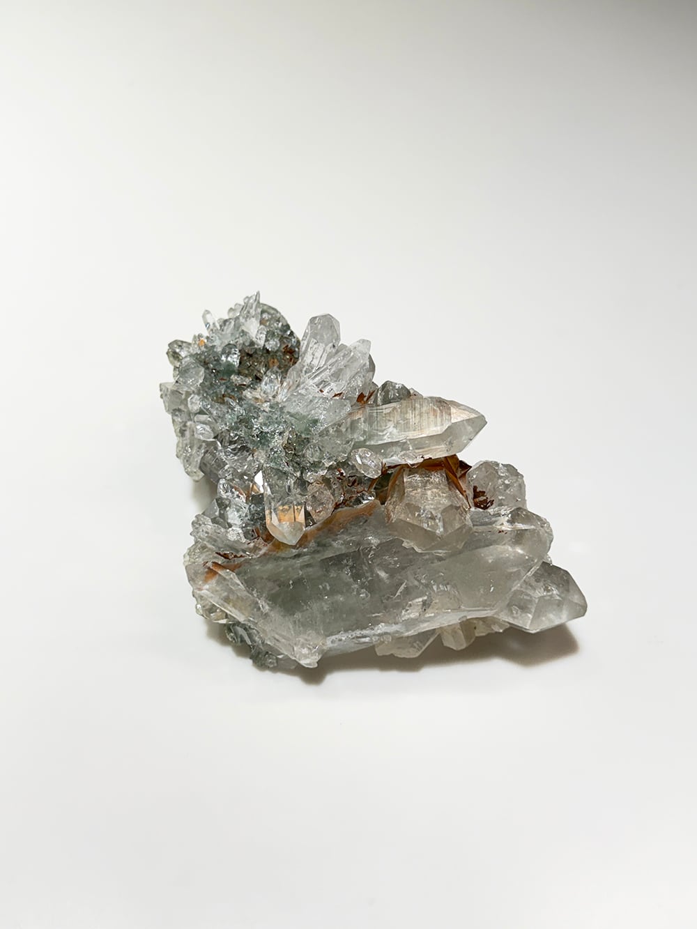 ボリュームのあるクォーツクラスター。様々なサイズのクォーツがあり、眺めていて飽きのこない一点です。透けて見えるクローライトも美しく、どの角度でも美しい景色が見えます。