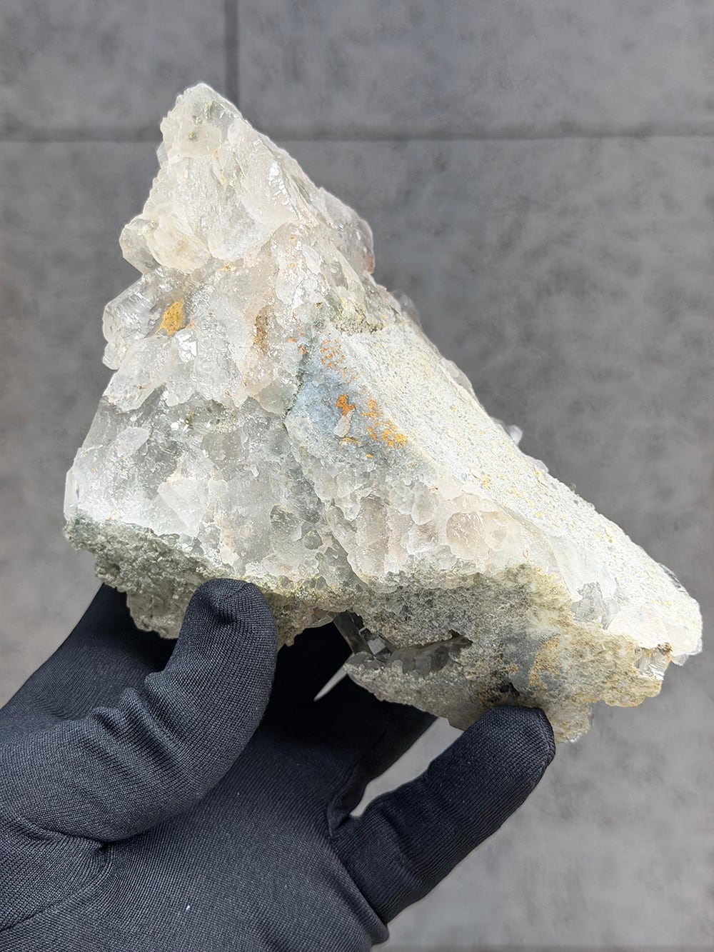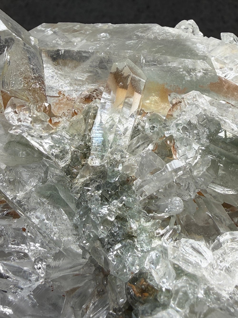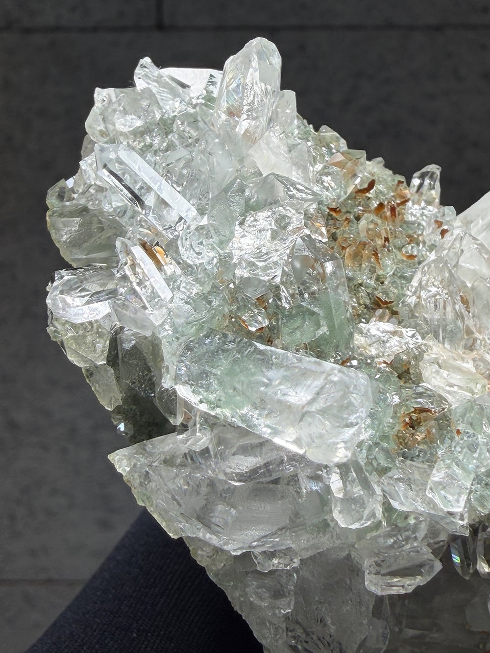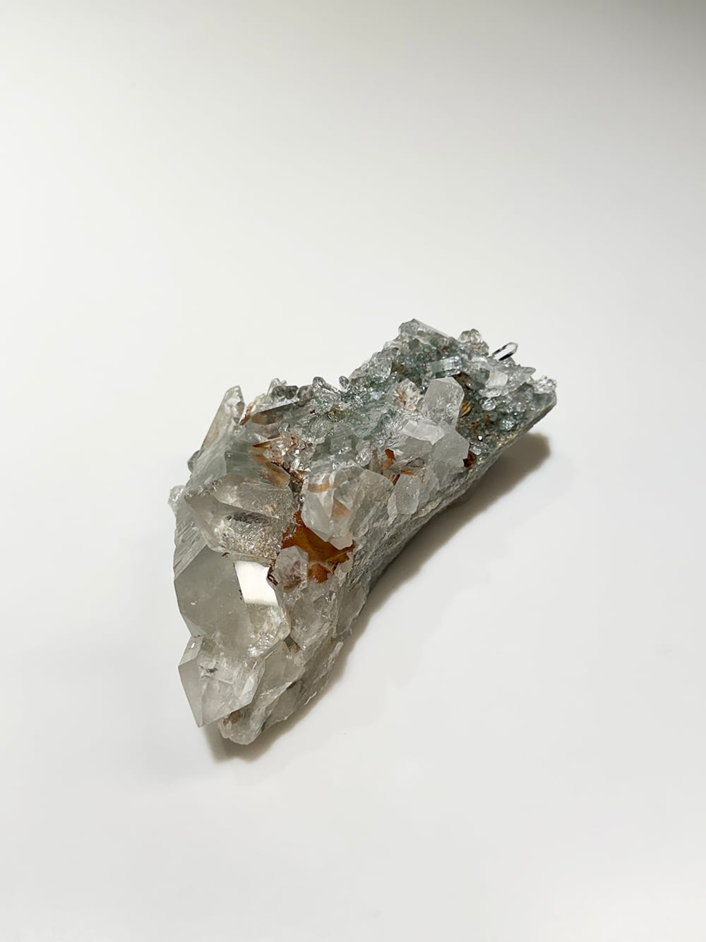 ボリュームのあるクォーツクラスター。様々なサイズのクォーツがあり、眺めていて飽きのこない一点です。透けて見えるクローライトも美しく、どの角度でも美しい景色が見えます。