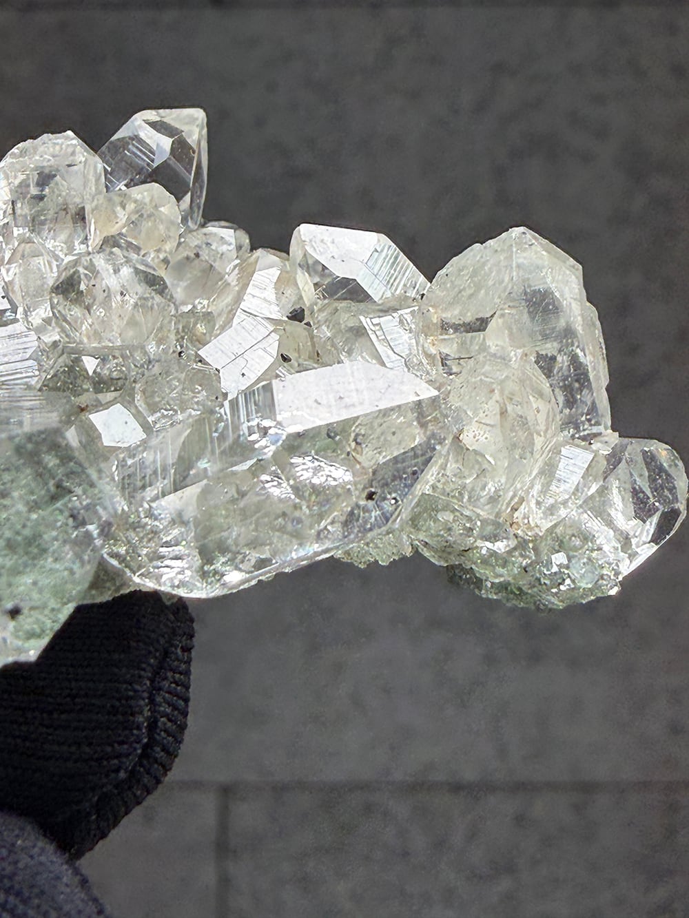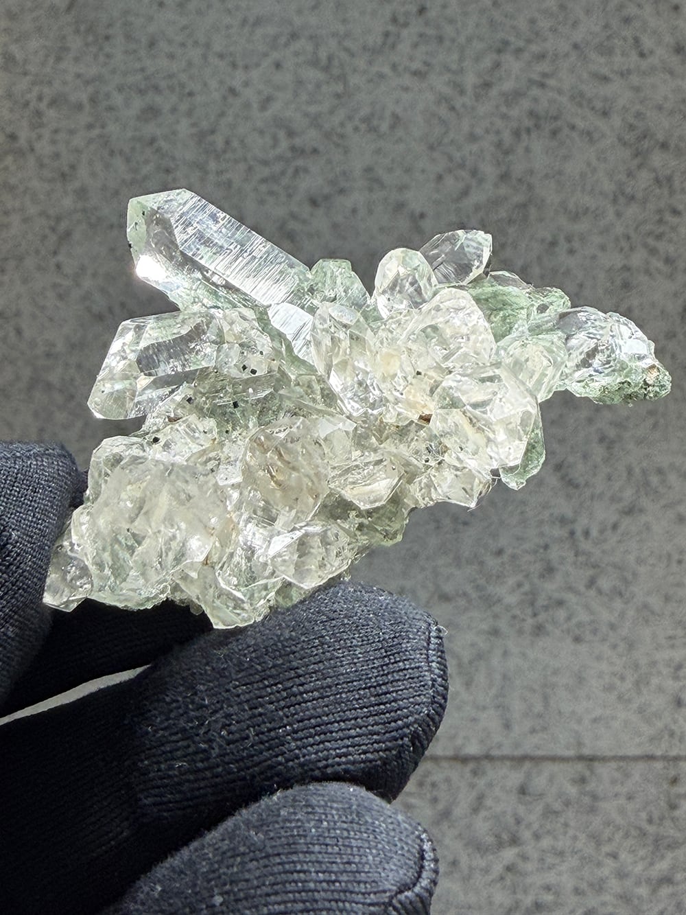 小さめのクォーツクラスターですが、アナテースとクローライトも共生しており、マニハールが凝縮されている一点。透明度も高く、オススメのクラスターです。