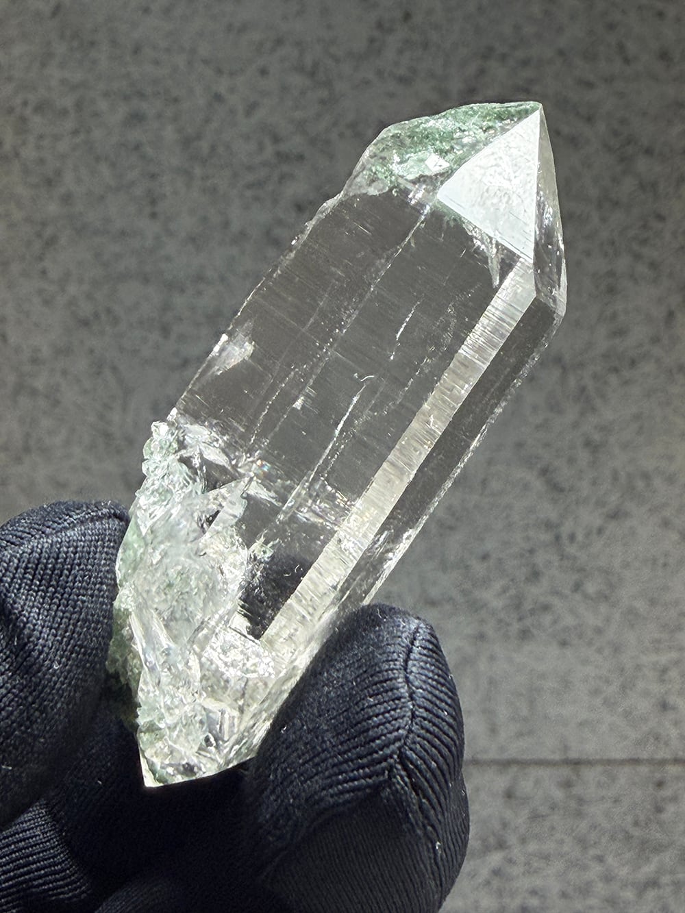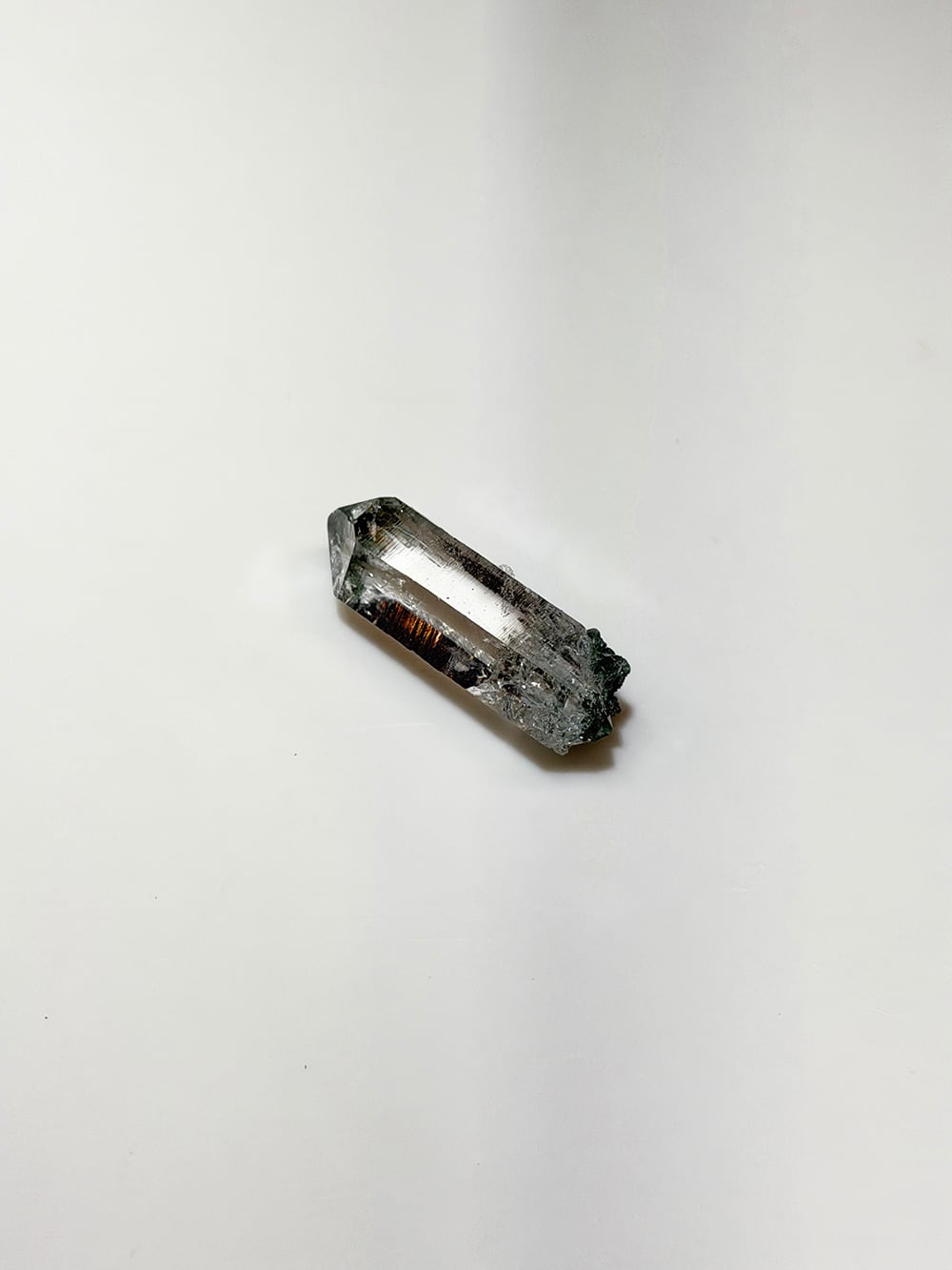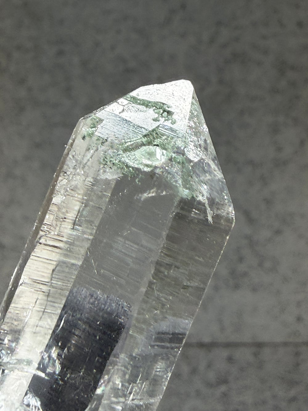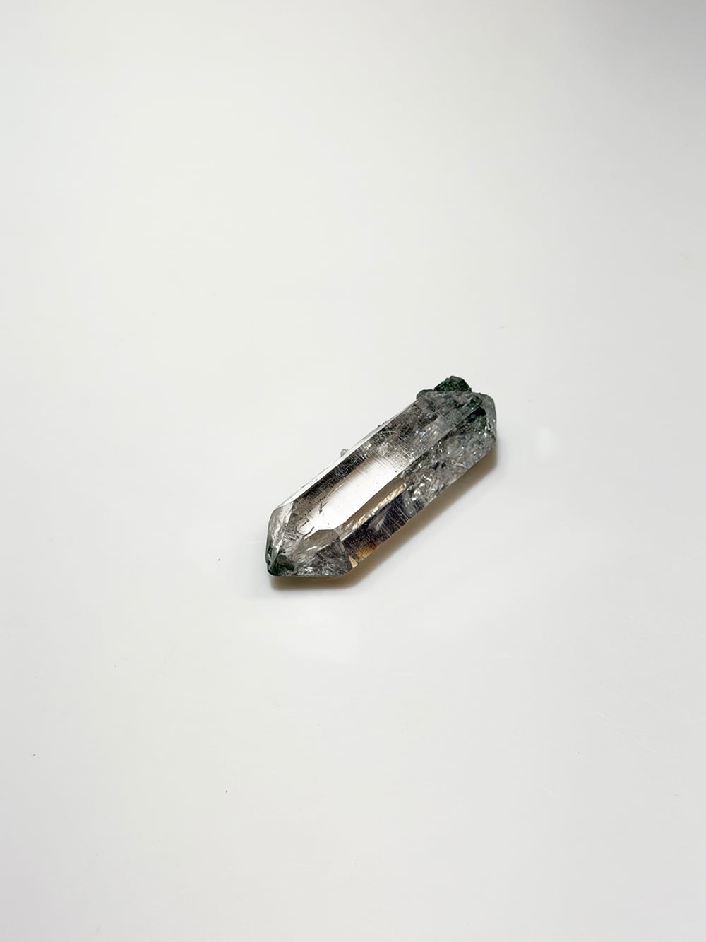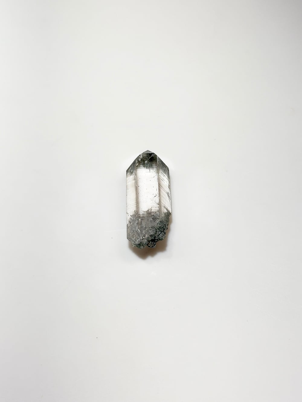 素晴らしい照りのポイントクォーツ。クローライトを内包した先端と、透明度の素晴らしさは絶品です。両剣になっているところも◎です。