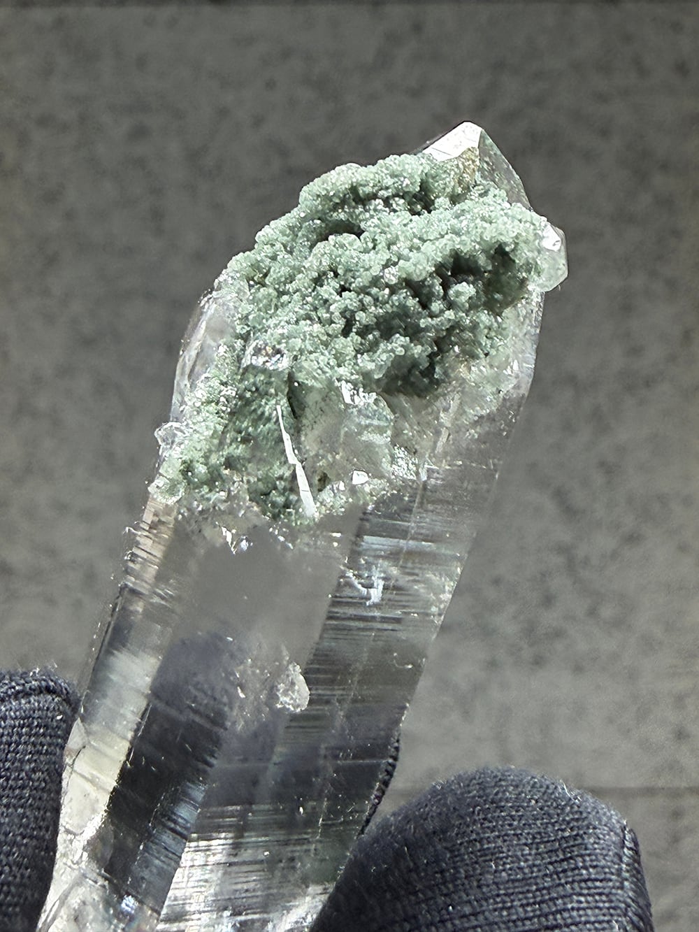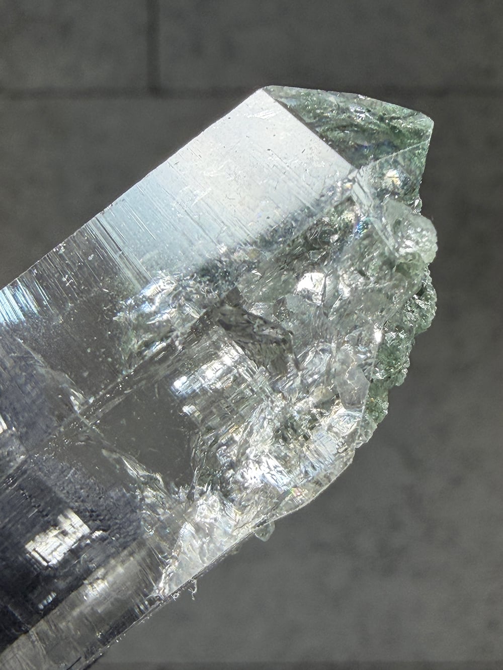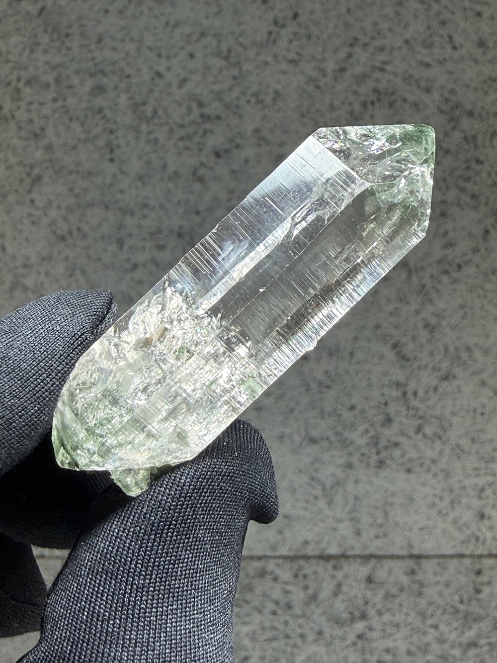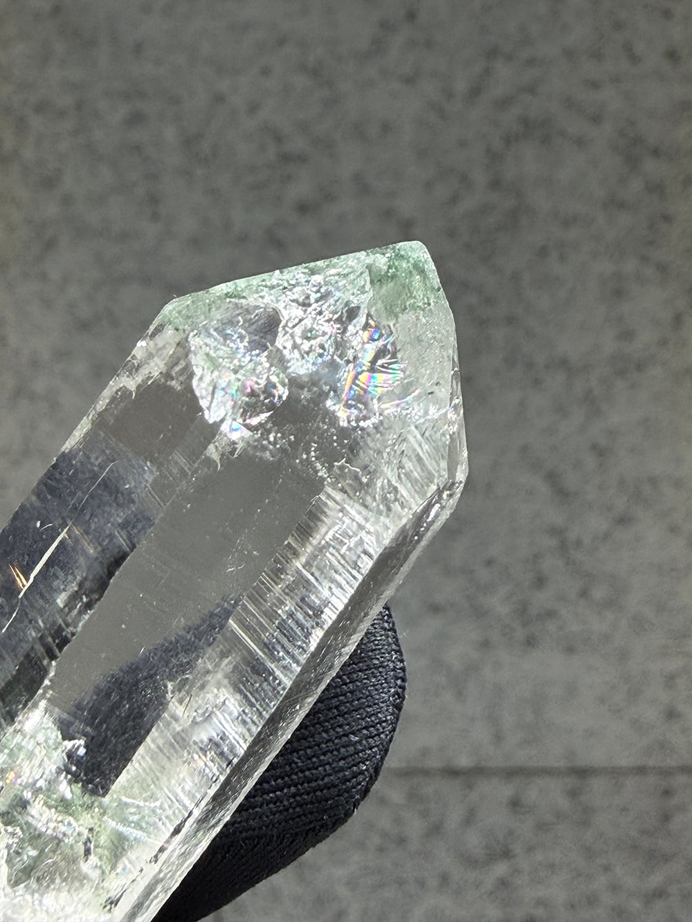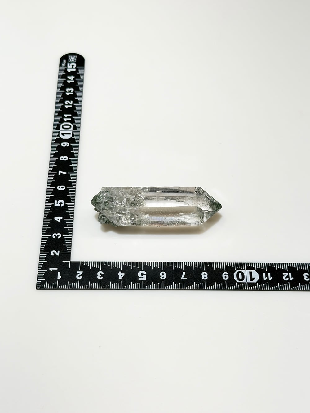 素晴らしい照りのポイントクォーツ。クローライトを内包した先端と、透明度の素晴らしさは絶品です。両剣になっているところも◎です。