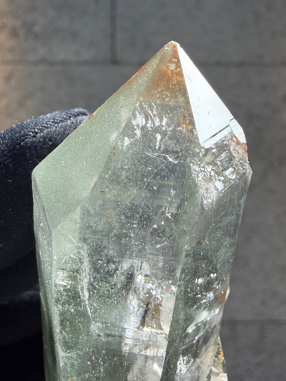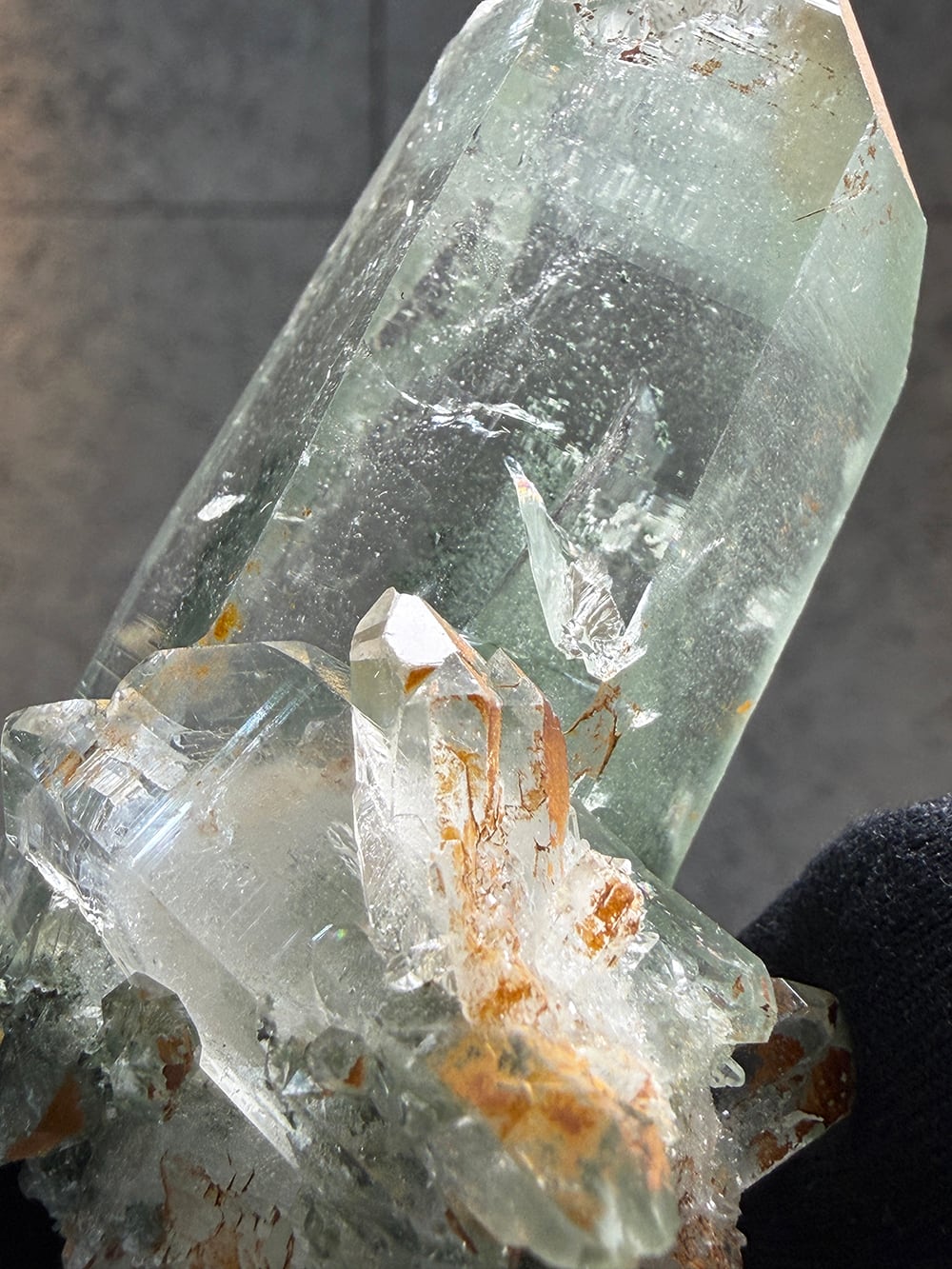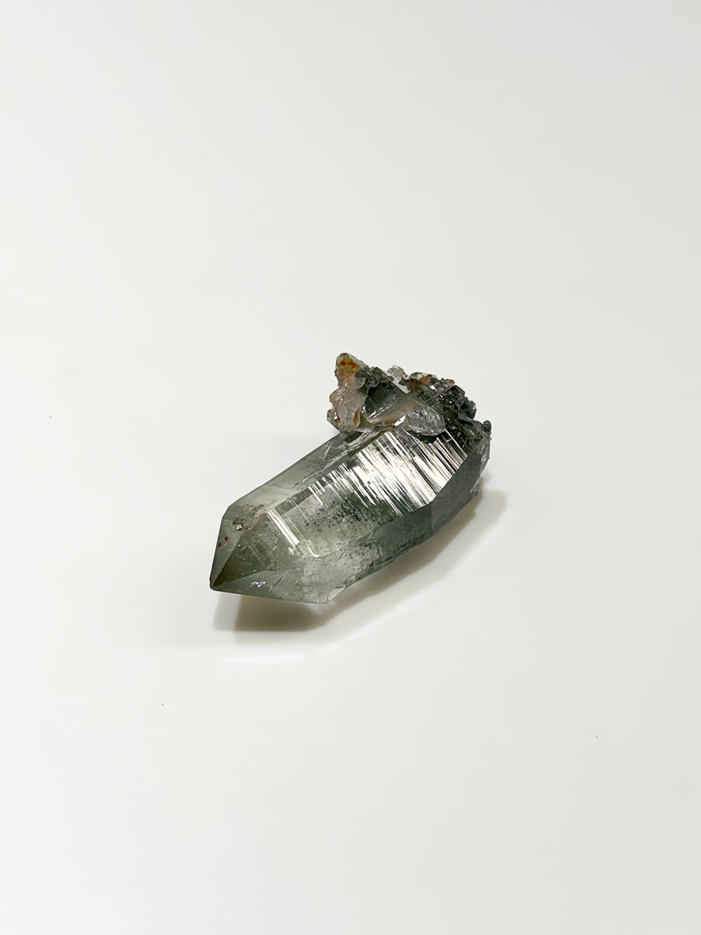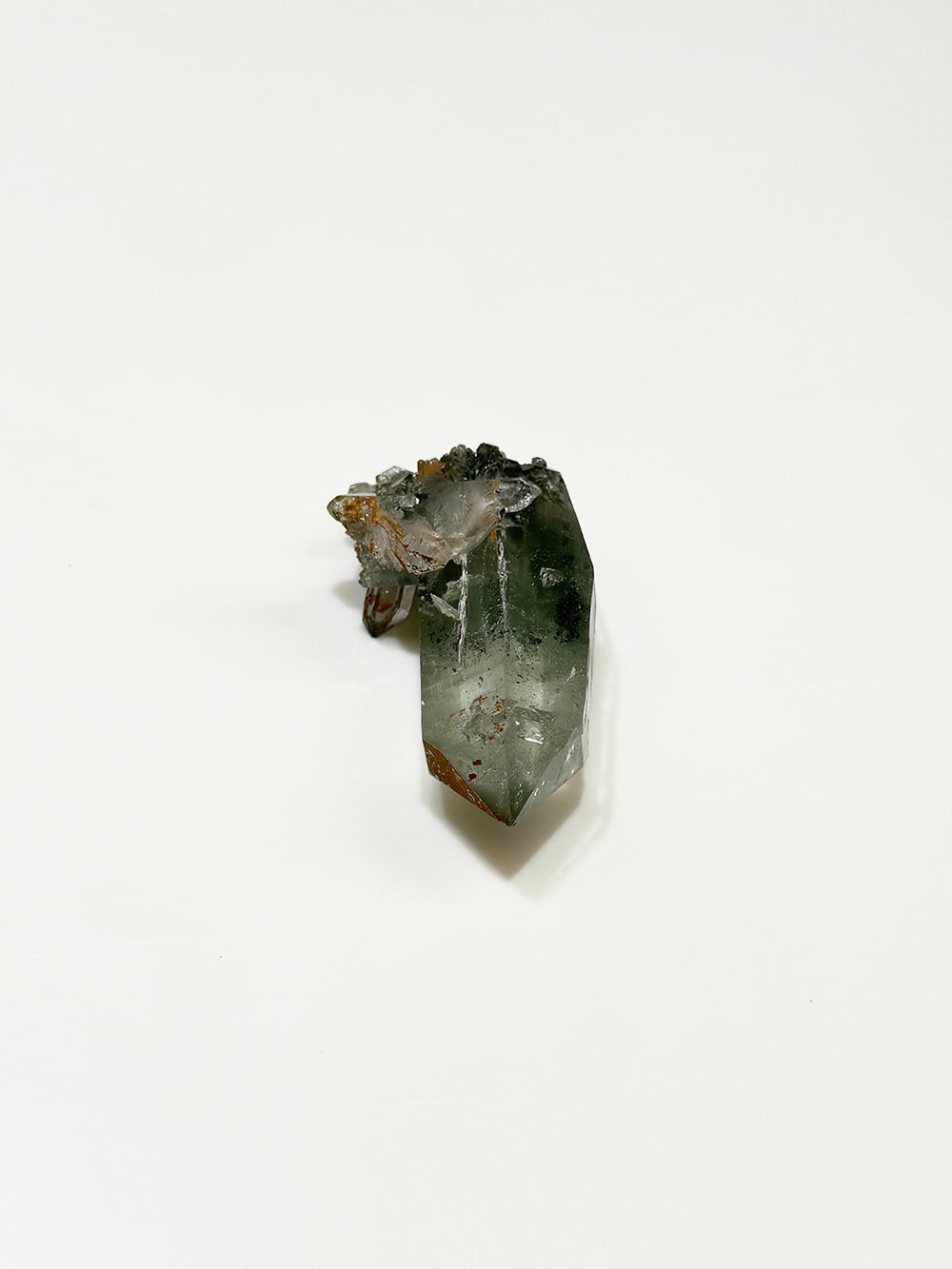 見た瞬間に声が溢れるほど照りの美しいクォーツ。その美しさは表面だけでなく、中にファントム、そして虹まで見ることができます。クローライトと小さいクラスターの部分もとても美しく、色々な角度で楽しんで頂きたい一点。かなりオススメのクォーツです。