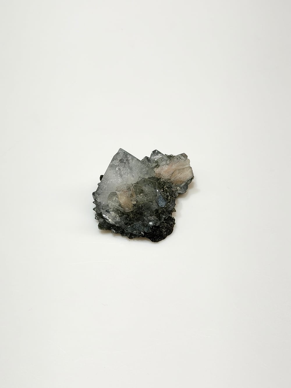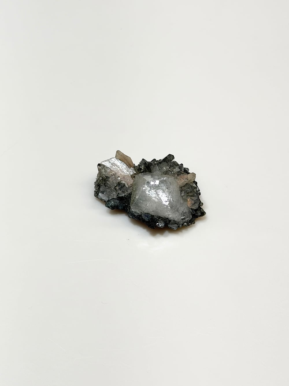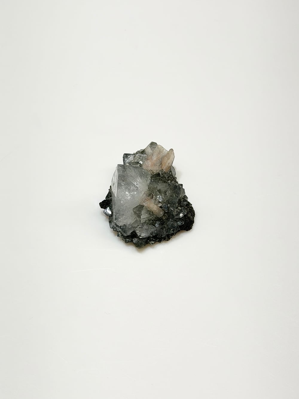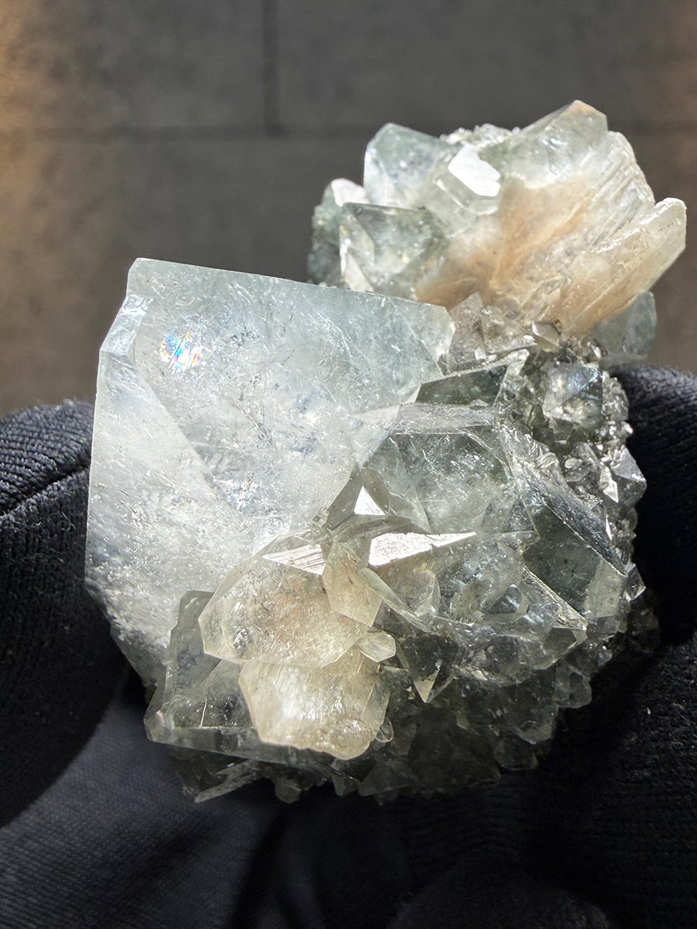 アポフィライト(魚眼石)は照りや透明感も美しく、層のように重なって見える部分は特に趣深い神秘的な魅力のある鉱物です。形状は四角形やピラミッド型をしています。共生しているスティルバイトは、シルクのような独特の光沢が美しく、とても景色の良い一点です。