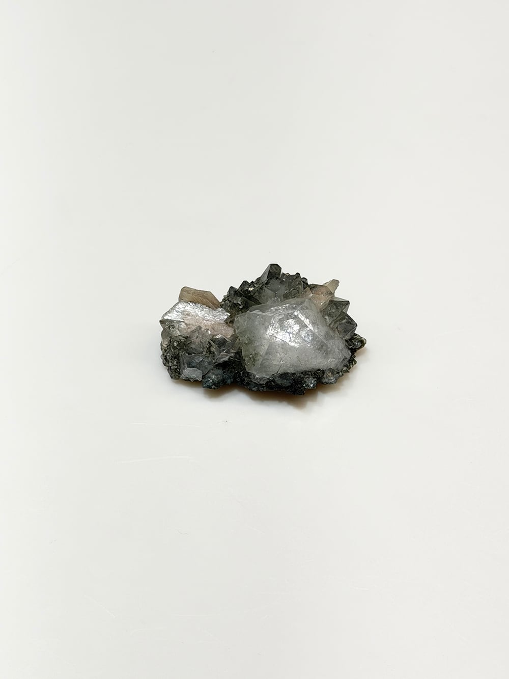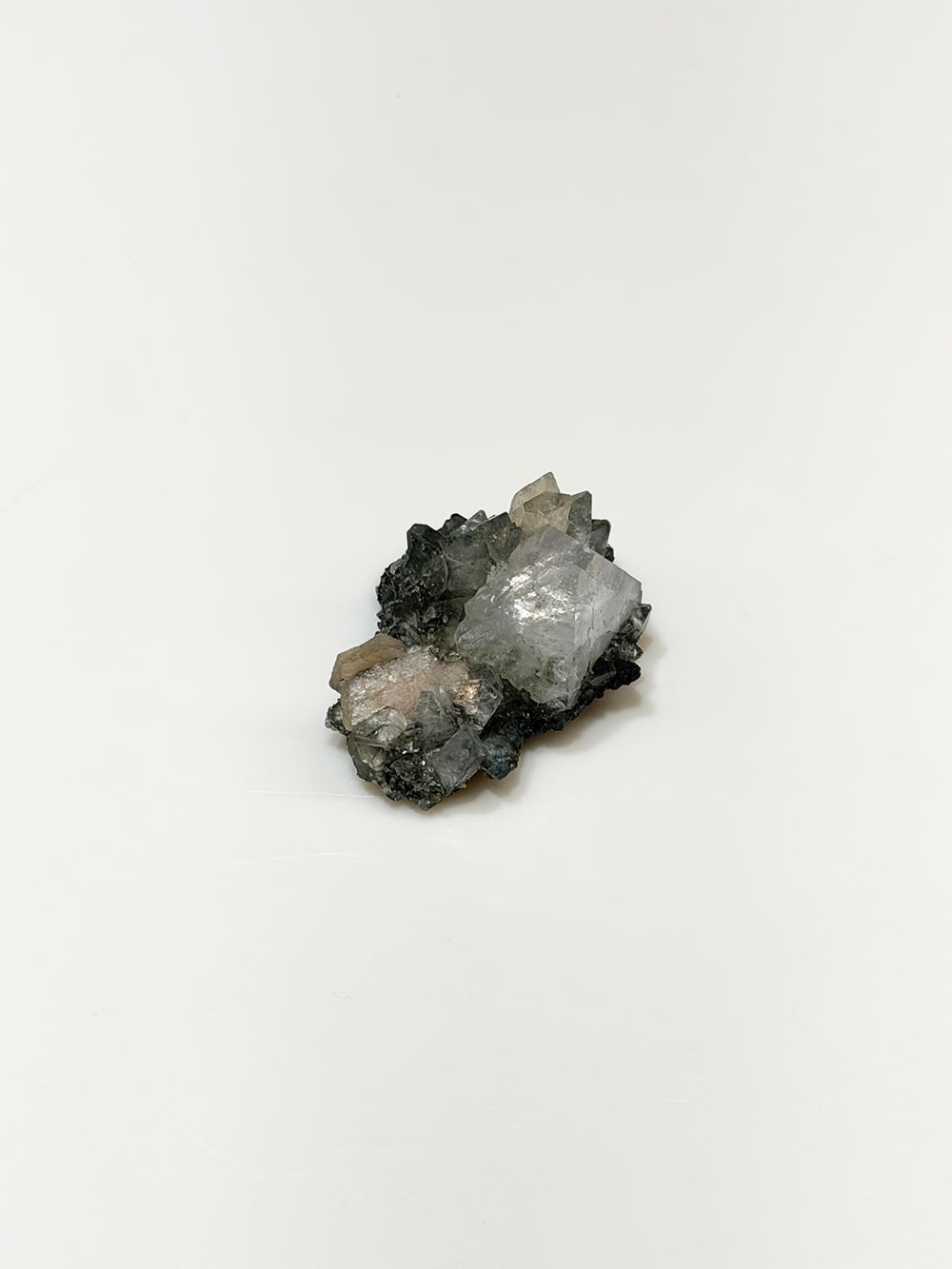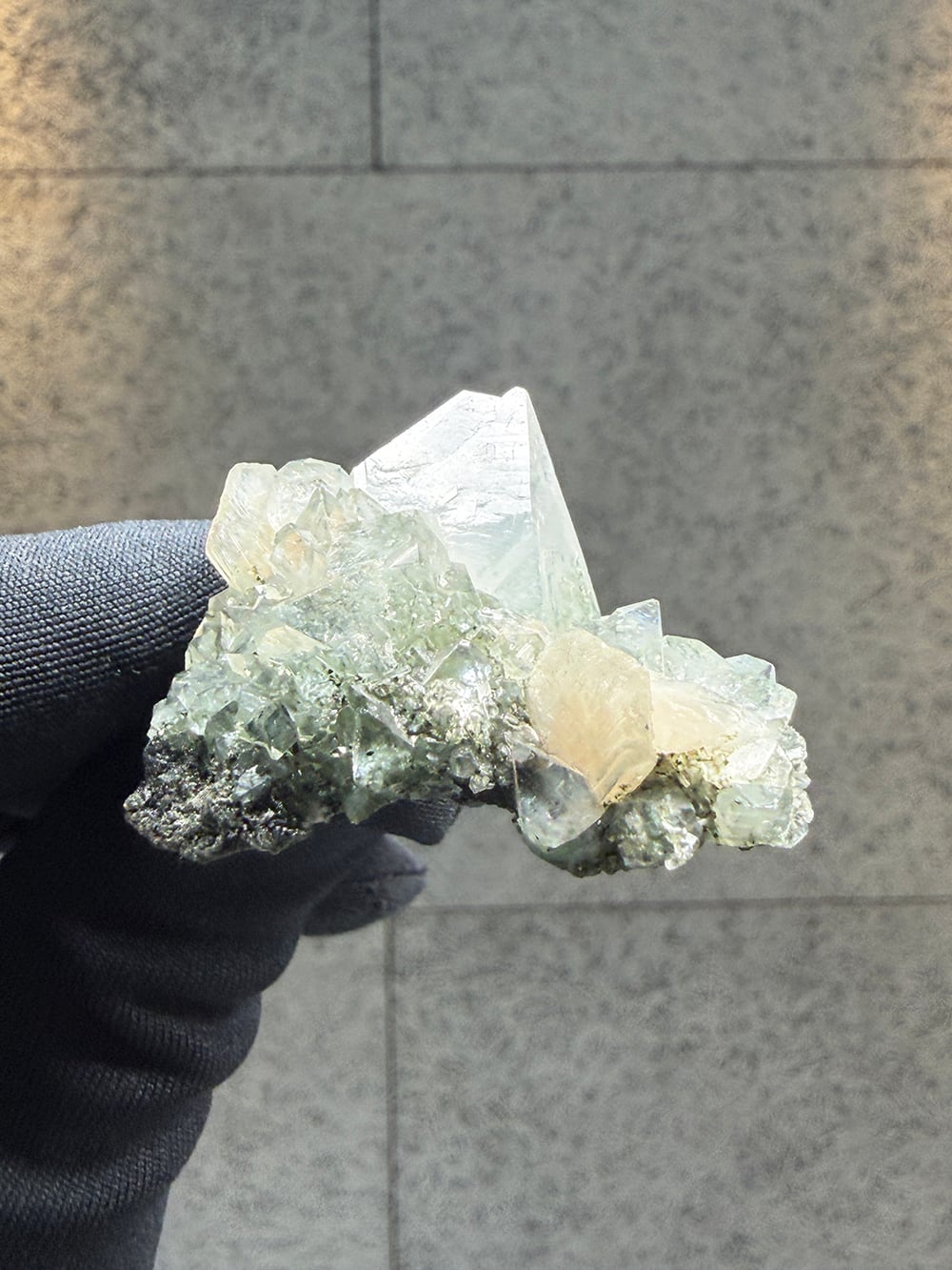 アポフィライト(魚眼石)は照りや透明感も美しく、層のように重なって見える部分は特に趣深い神秘的な魅力のある鉱物です。形状は四角形やピラミッド型をしています。共生しているスティルバイトは、シルクのような独特の光沢が美しく、とても景色の良い一点です。