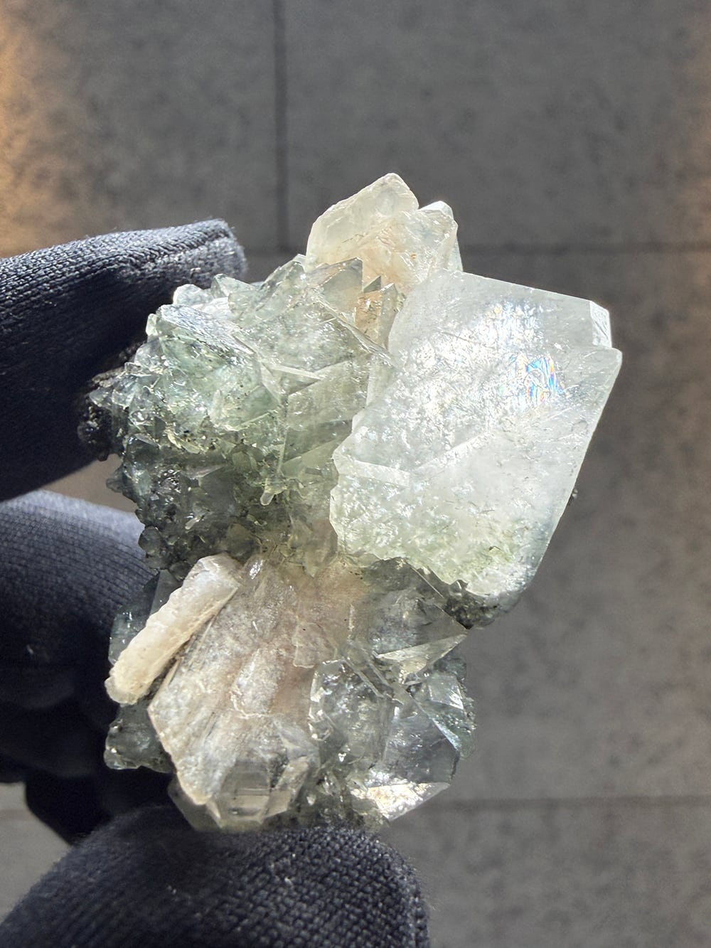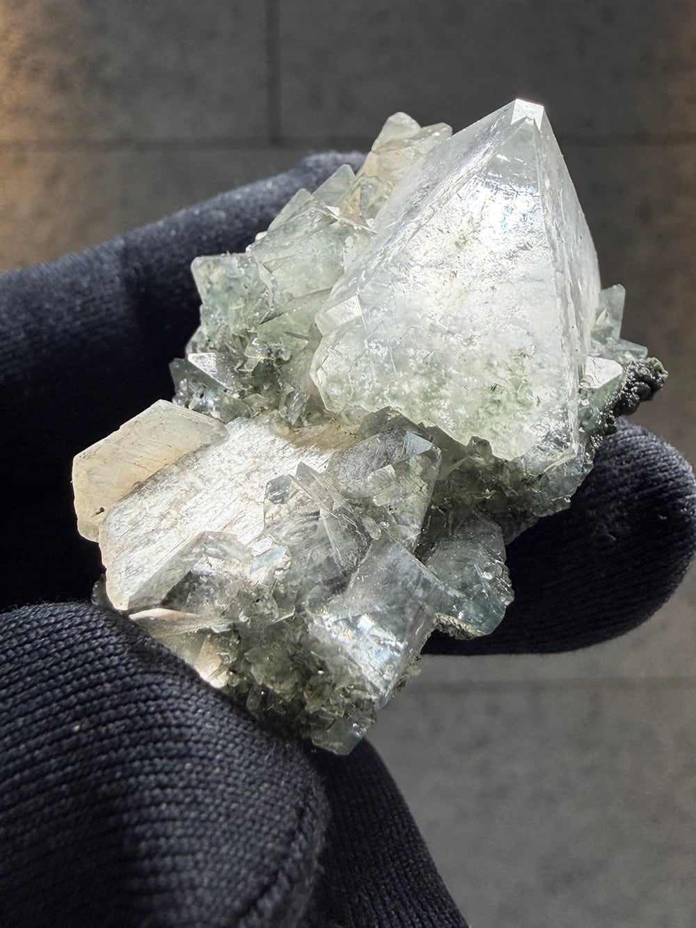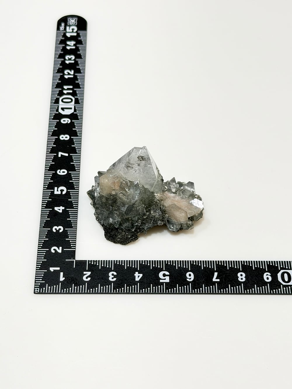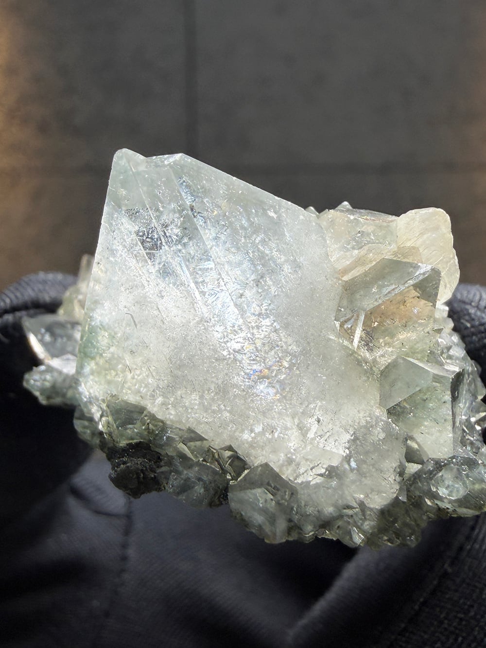アポフィライト(魚眼石)は照りや透明感も美しく、層のように重なって見える部分は特に趣深い神秘的な魅力のある鉱物です。形状は四角形やピラミッド型をしています。共生しているスティルバイトは、シルクのような独特の光沢が美しく、とても景色の良い一点です。