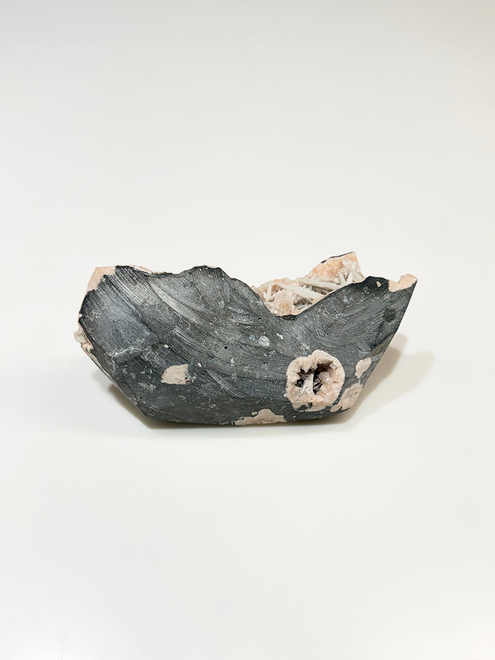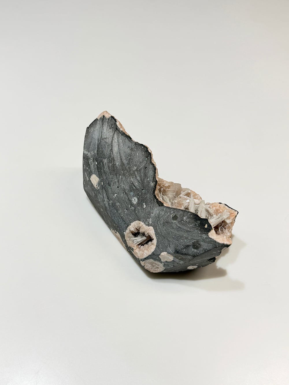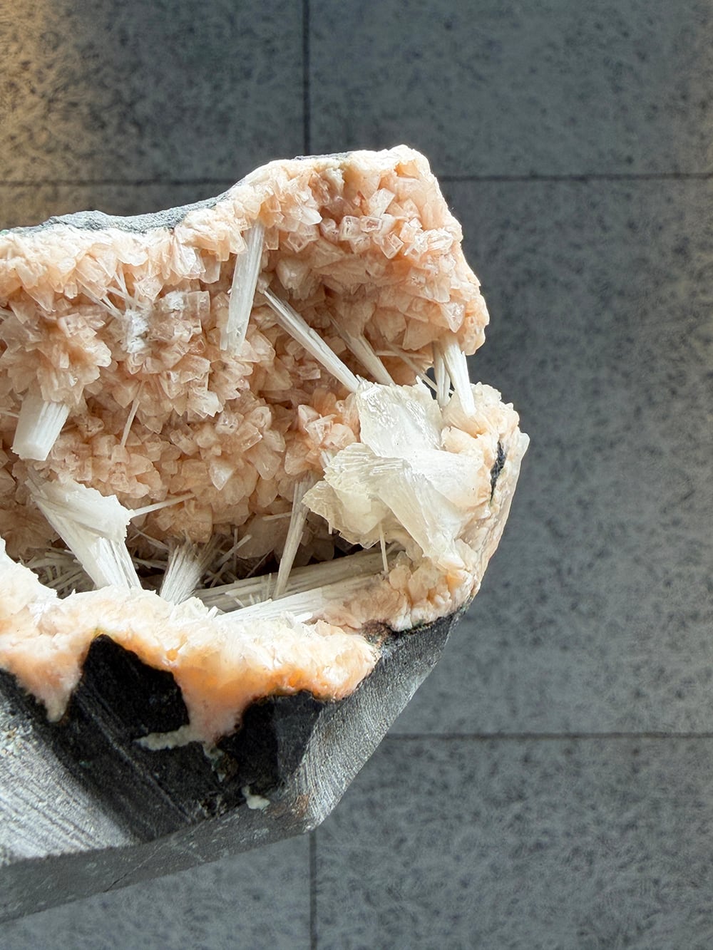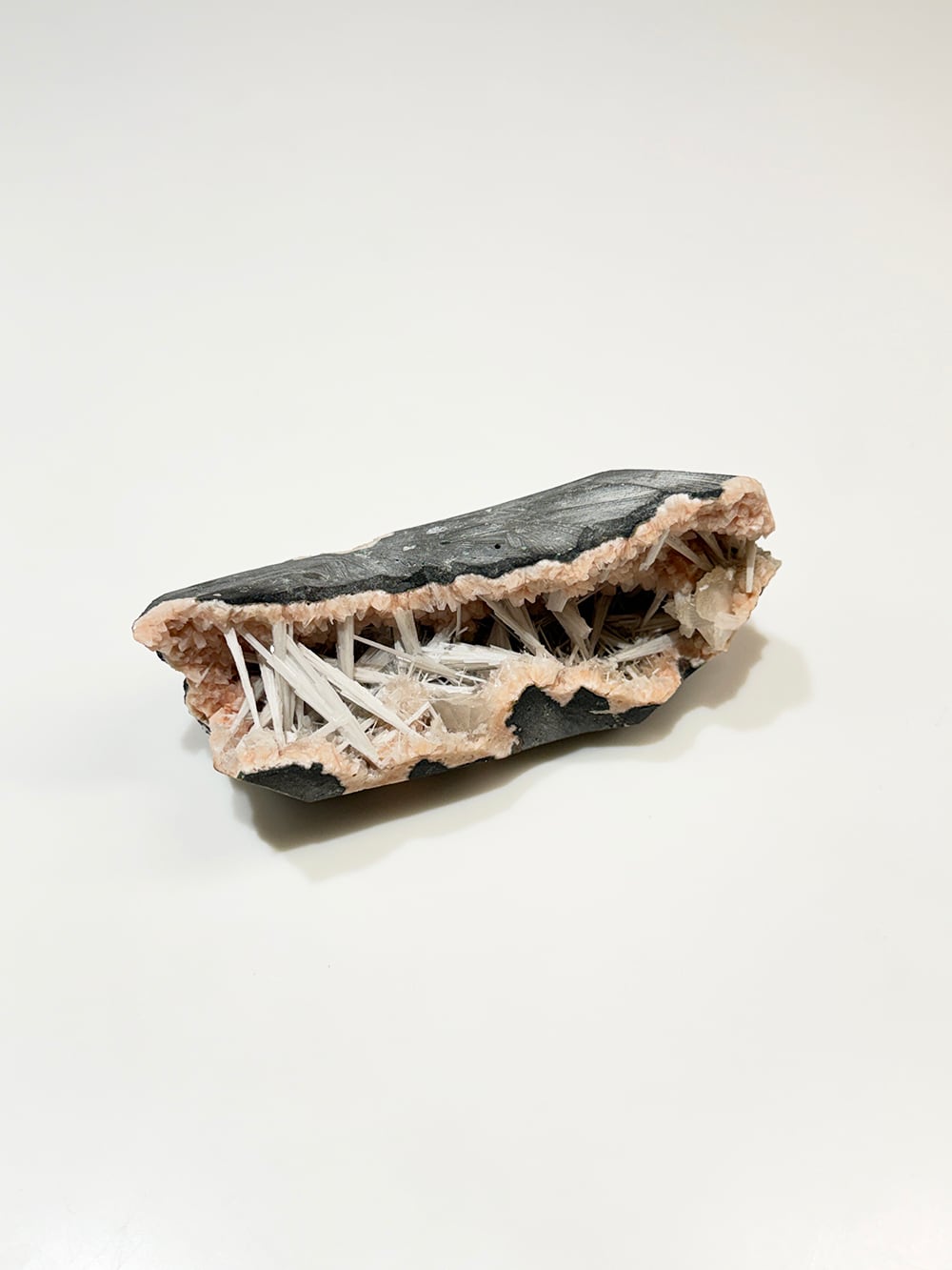 まさに自然のアートミネラルと呼ぶにふさわしい一点。スコレサイトのスプレーとヒューランダイトの淡いオレンジが美しいジオードを作り上げています。希少性もとても高いミネラルです。