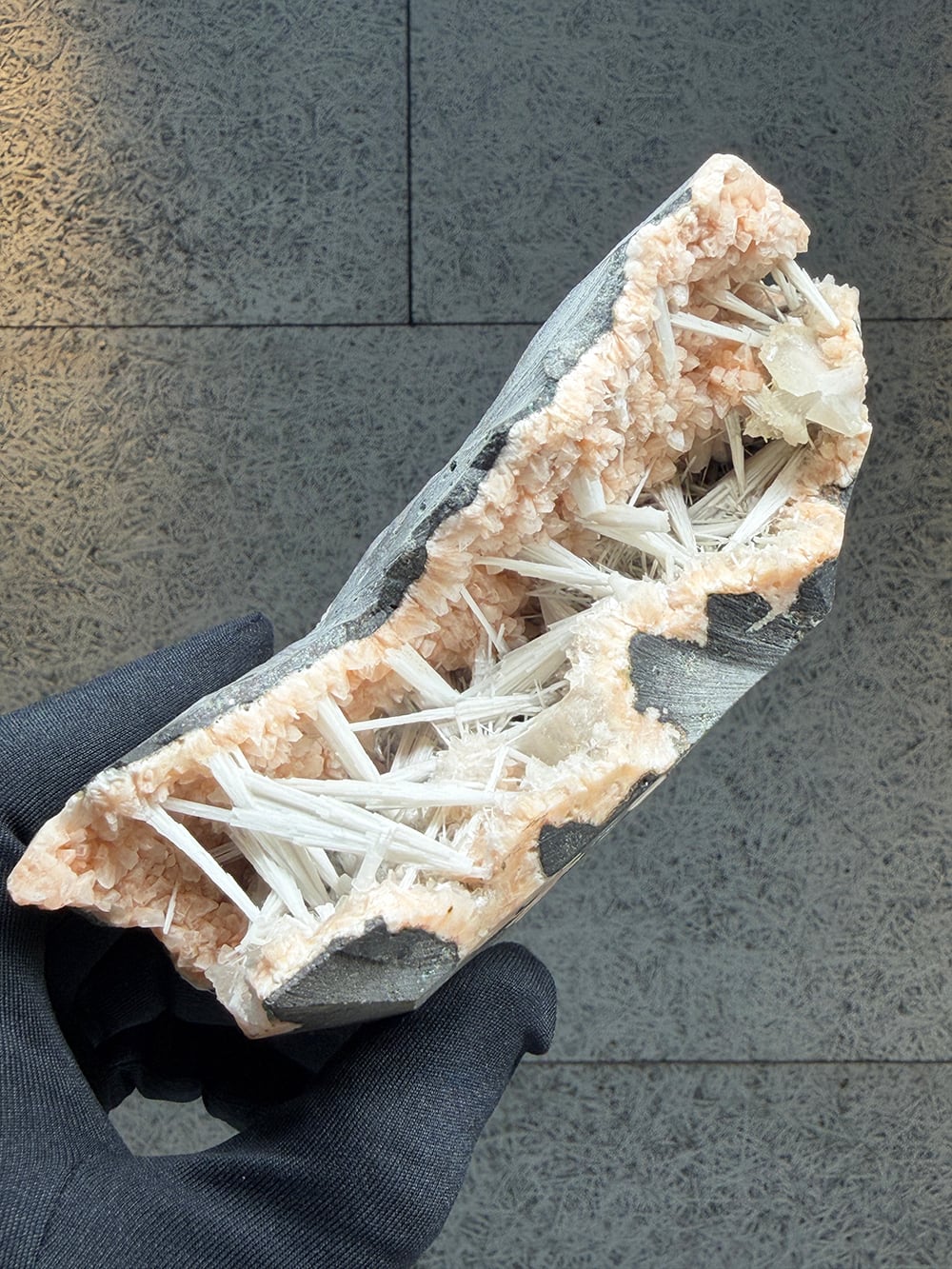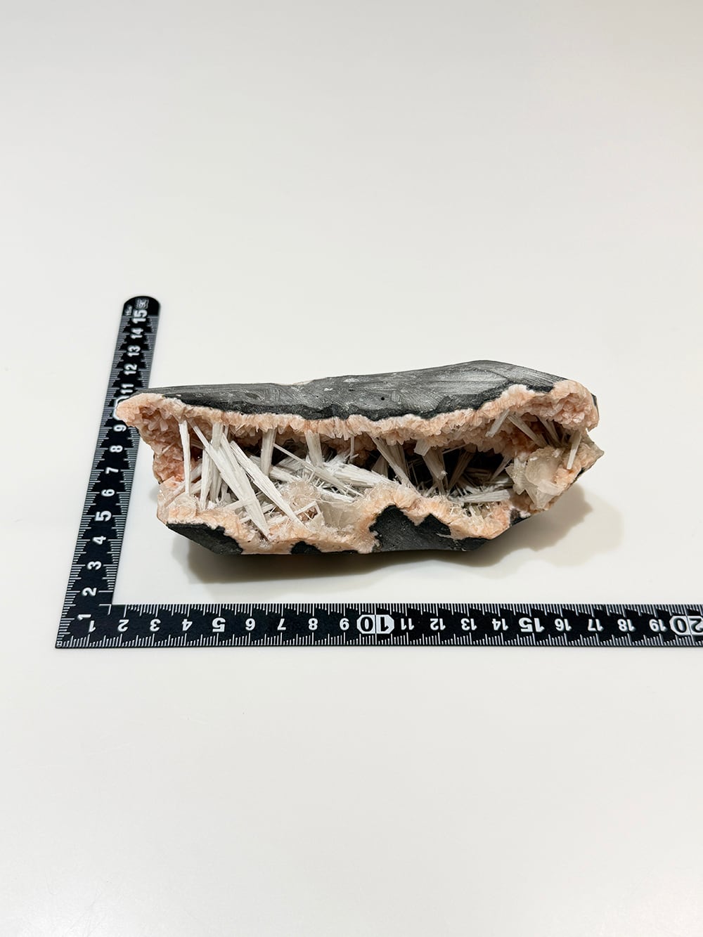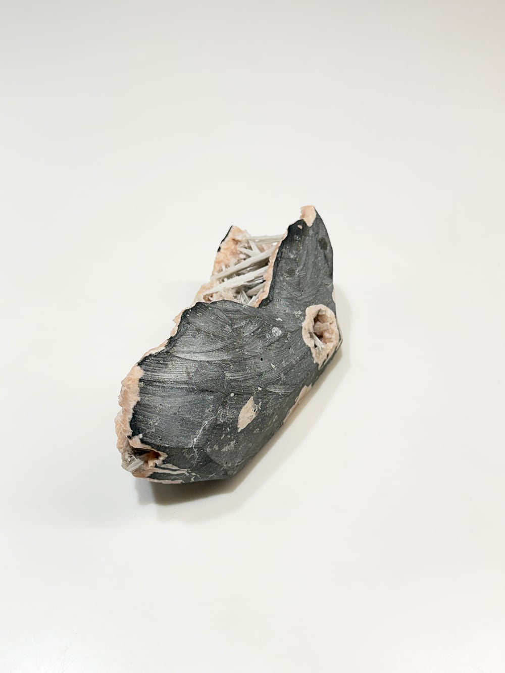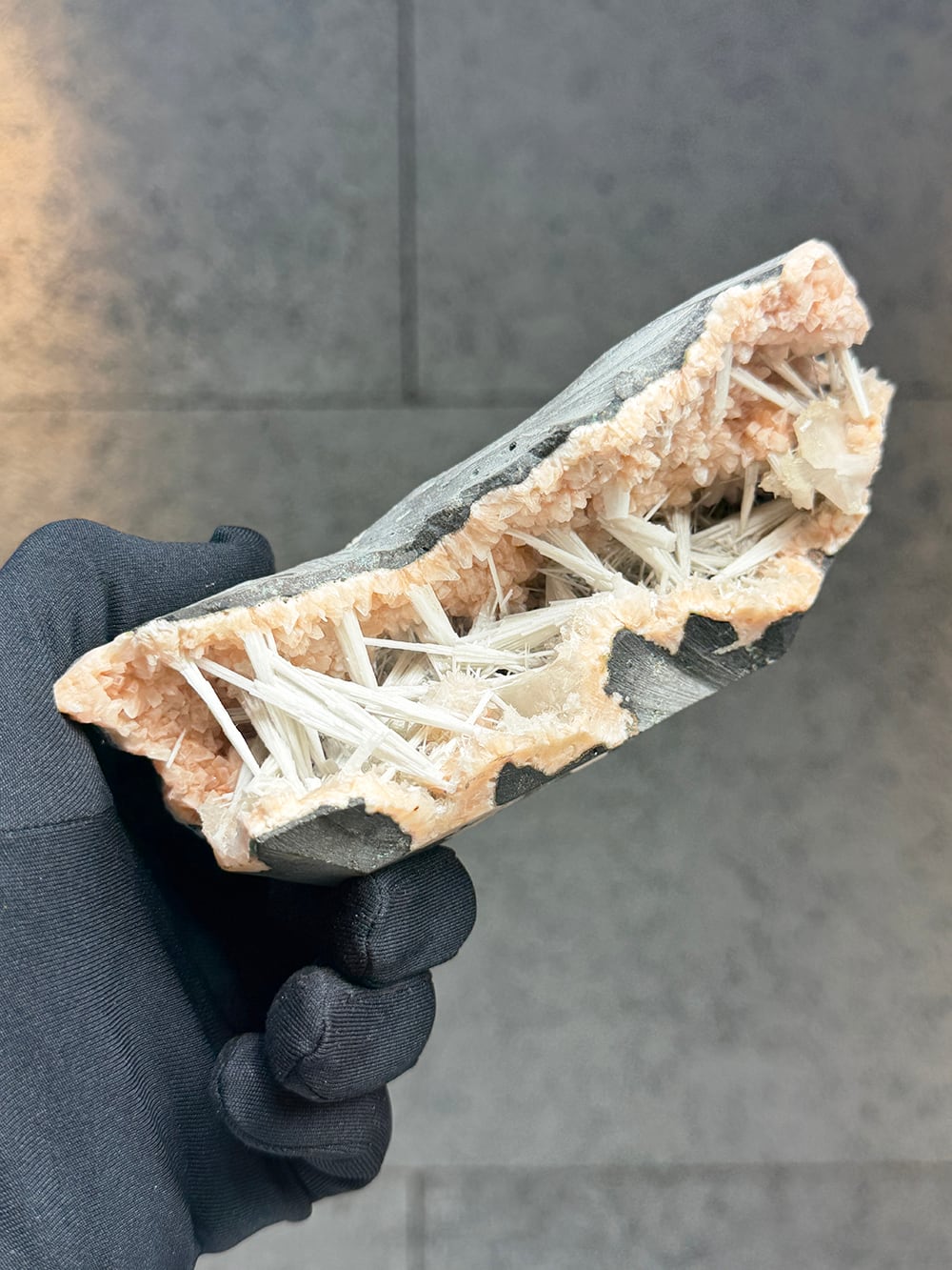まさに自然のアートミネラルと呼ぶにふさわしい一点。スコレサイトのスプレーとヒューランダイトの淡いオレンジが美しいジオードを作り上げています。希少性もとても高いミネラルです。