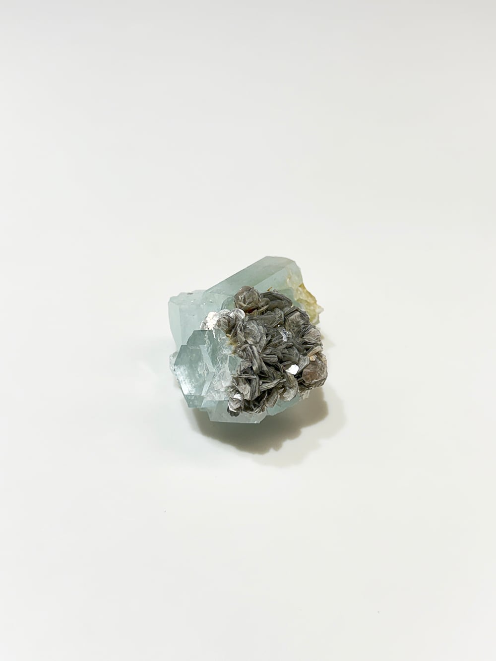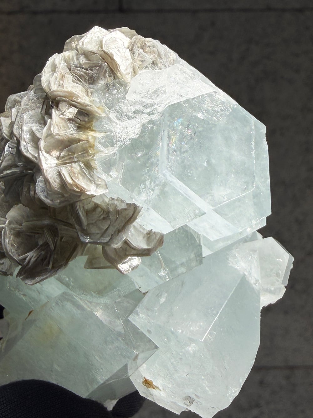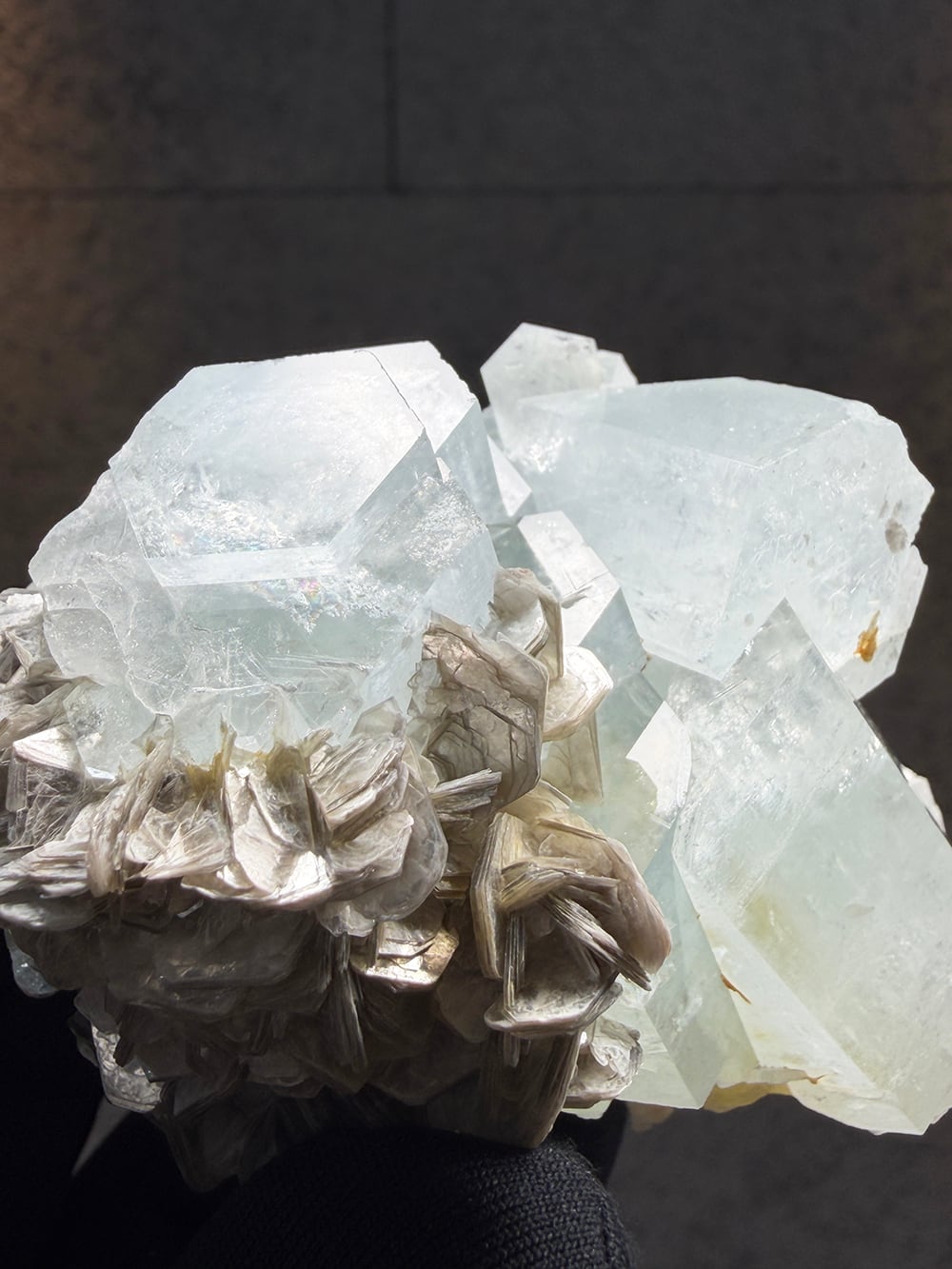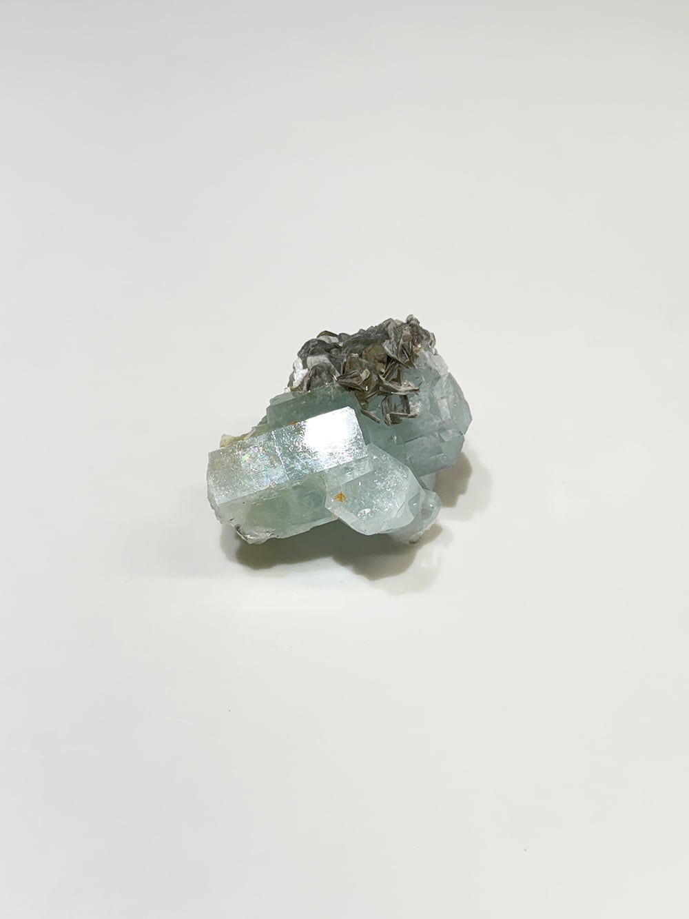 とてもボリュームのあるアクアマリンの原石。いくつも結晶が幾何学的に連なって生成されており、美しいアクアマリンブルーとマイカのシルバーがアクセントになって、照りも良く素晴らしい景色を作り出しています。結晶内にいくつか虹も見ることができ、とても鑑賞価値の高い一点です。