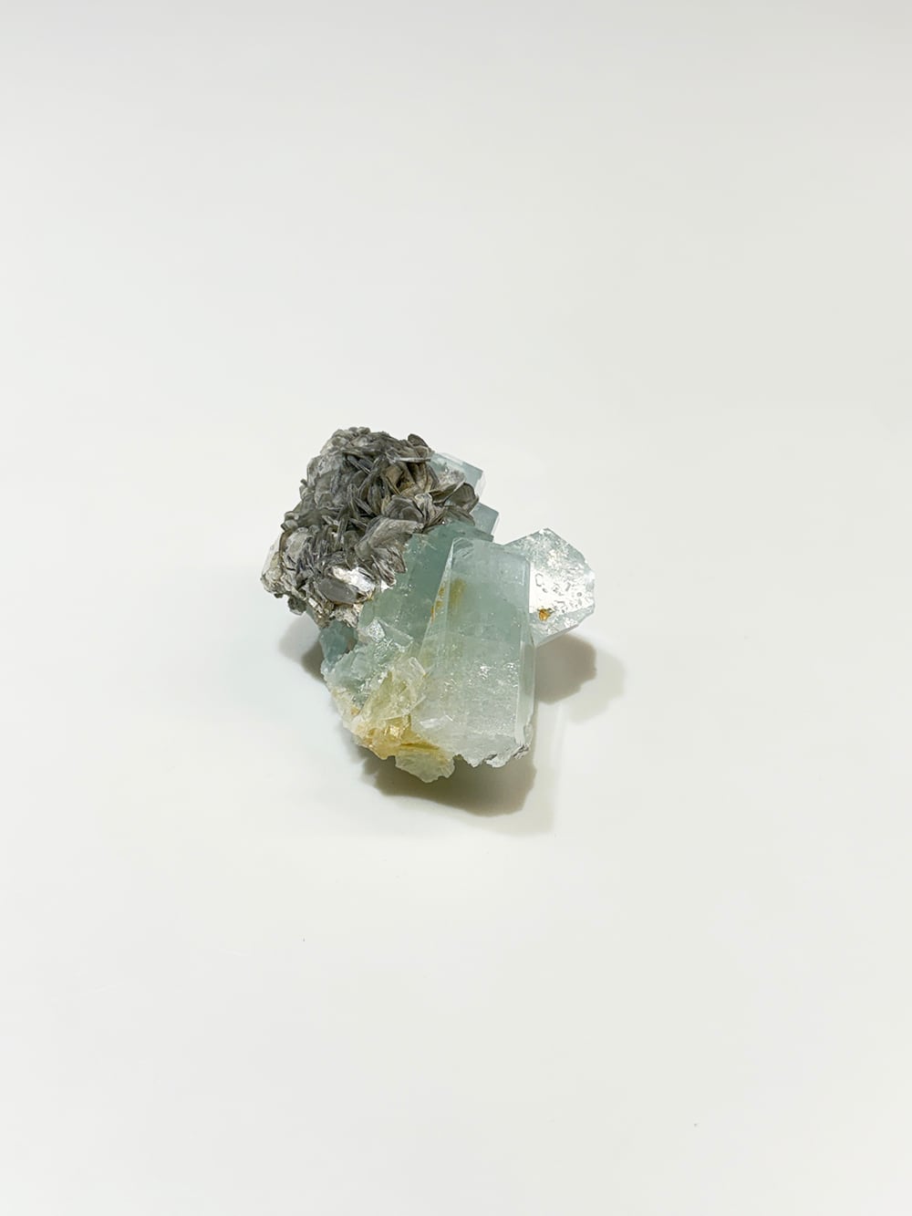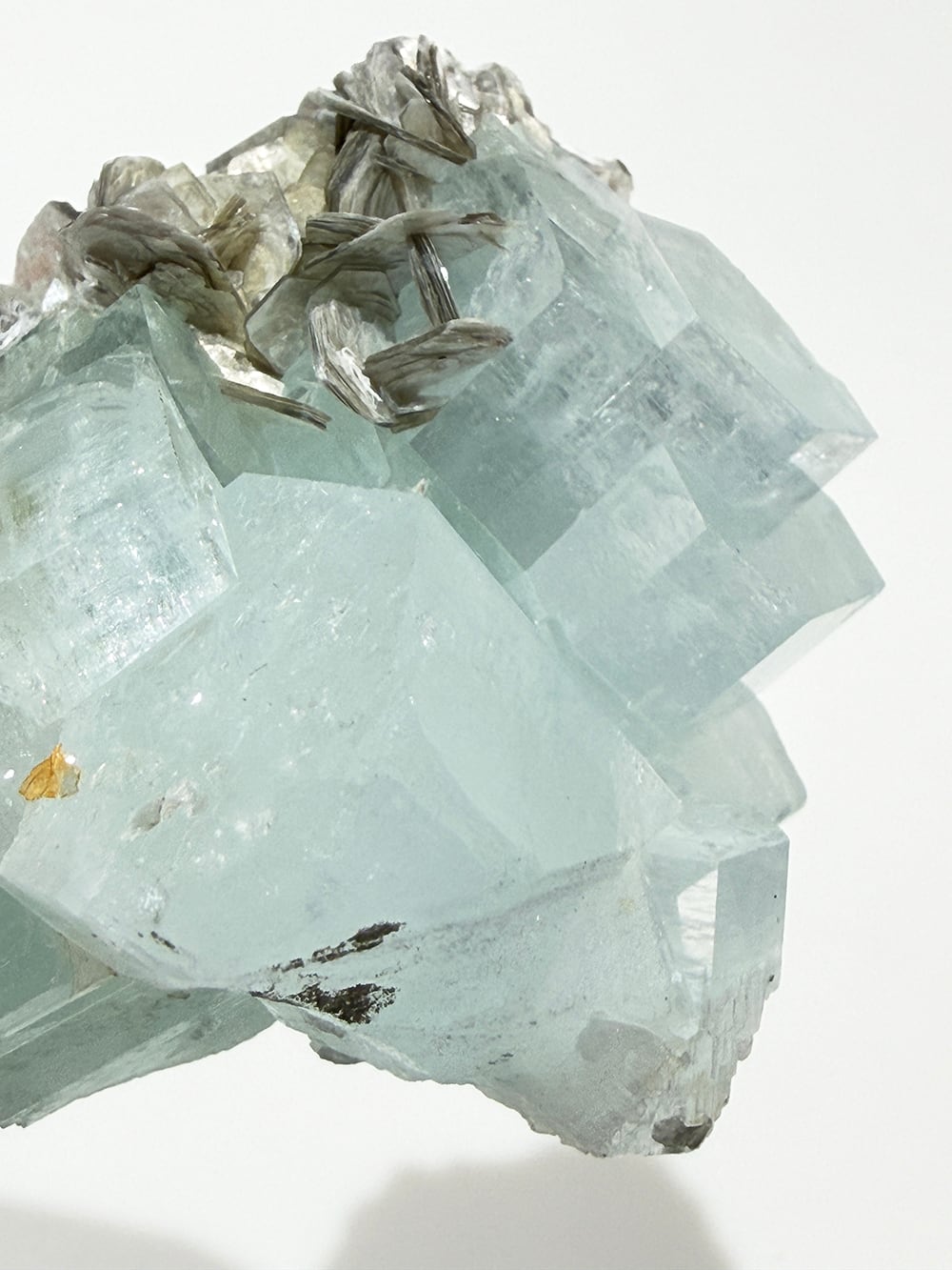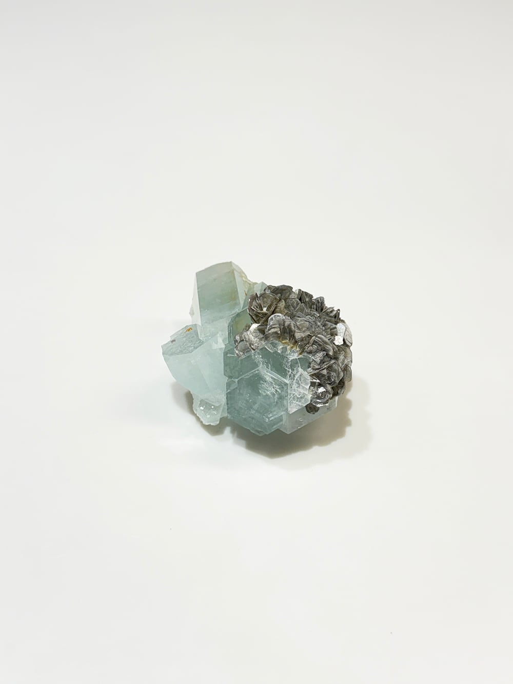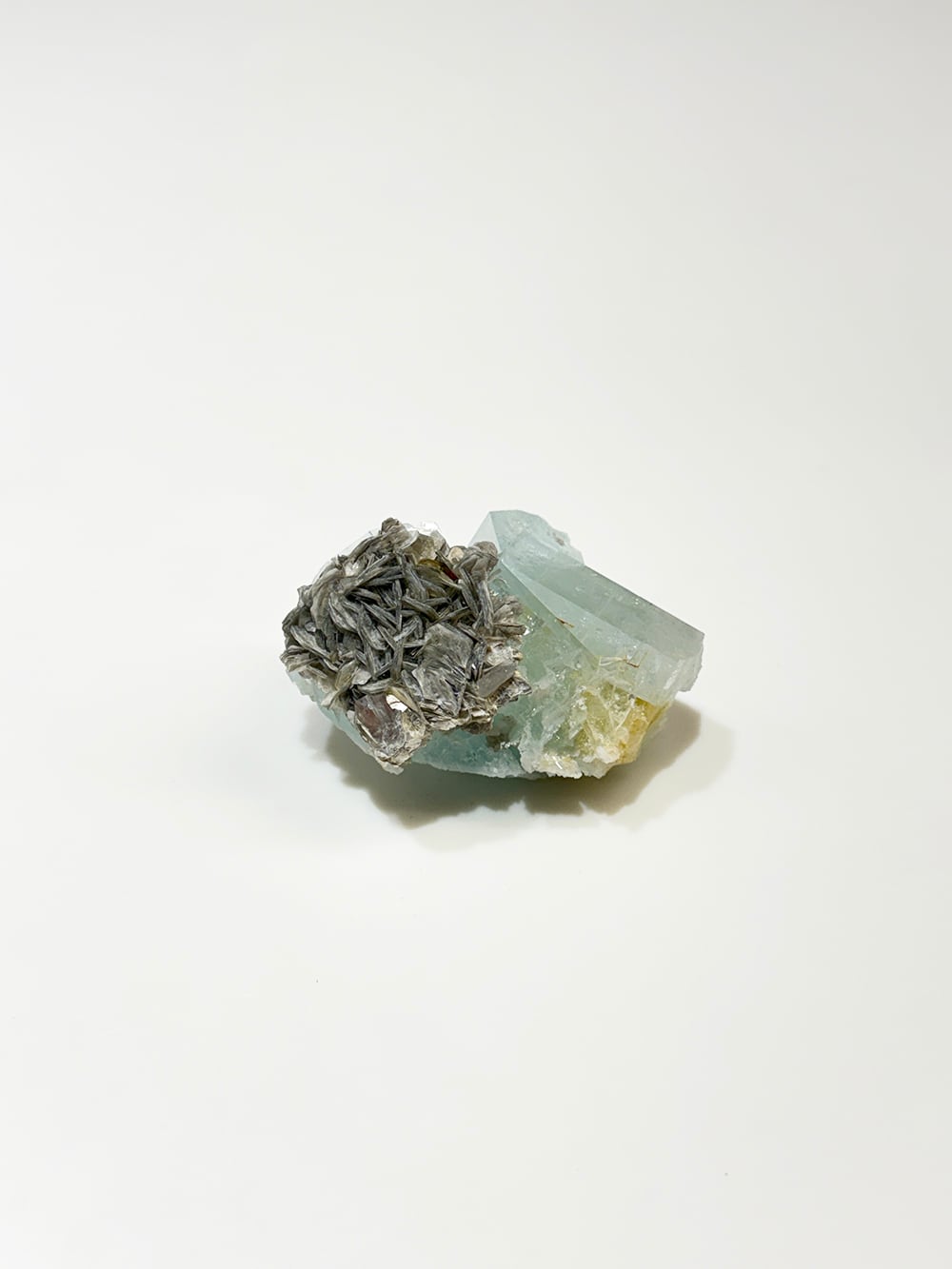 とてもボリュームのあるアクアマリンの原石。いくつも結晶が幾何学的に連なって生成されており、美しいアクアマリンブルーとマイカのシルバーがアクセントになって、照りも良く素晴らしい景色を作り出しています。結晶内にいくつか虹も見ることができ、とても鑑賞価値の高い一点です。