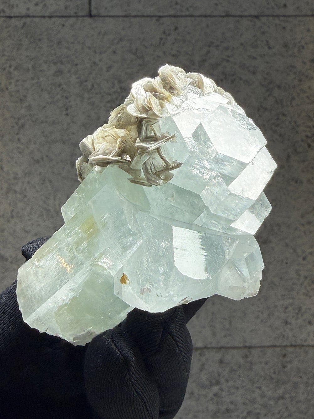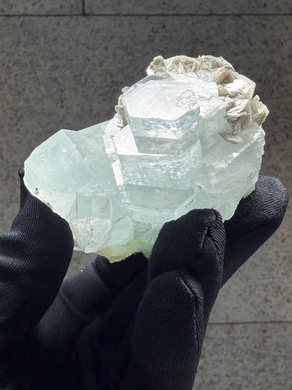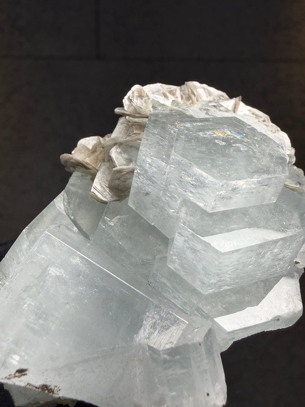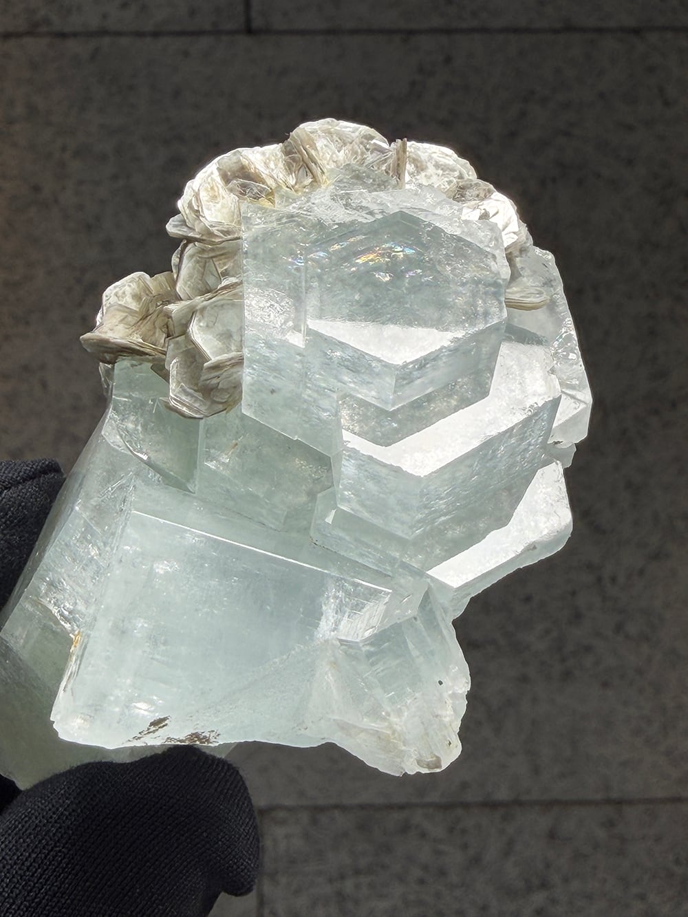 とてもボリュームのあるアクアマリンの原石。いくつも結晶が幾何学的に連なって生成されており、美しいアクアマリンブルーとマイカのシルバーがアクセントになって、照りも良く素晴らしい景色を作り出しています。結晶内にいくつか虹も見ることができ、とても鑑賞価値の高い一点です。