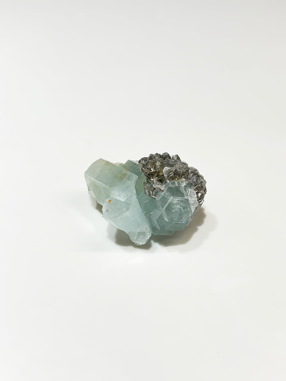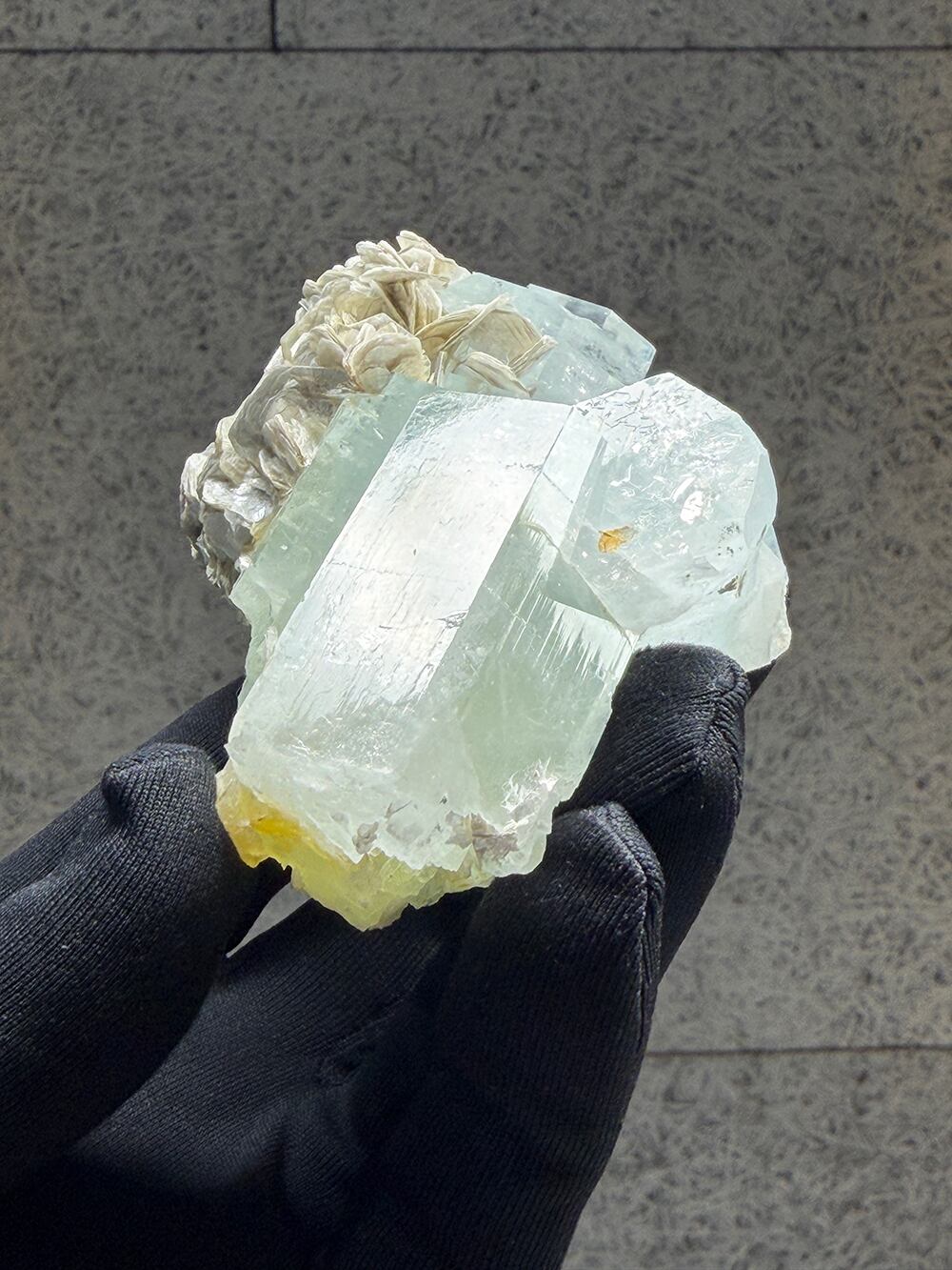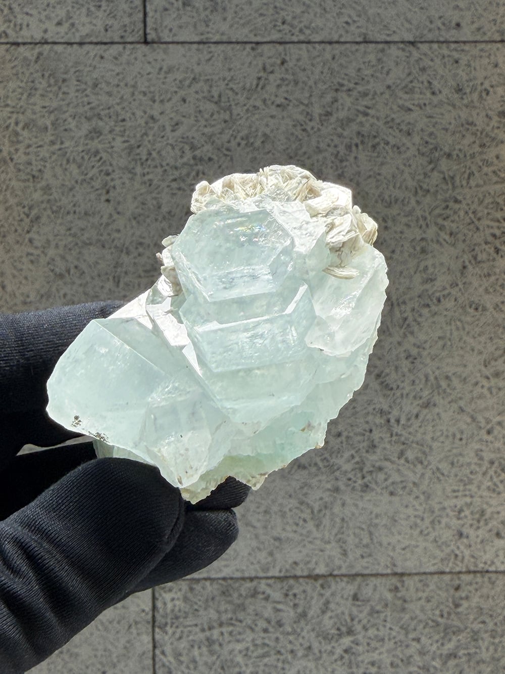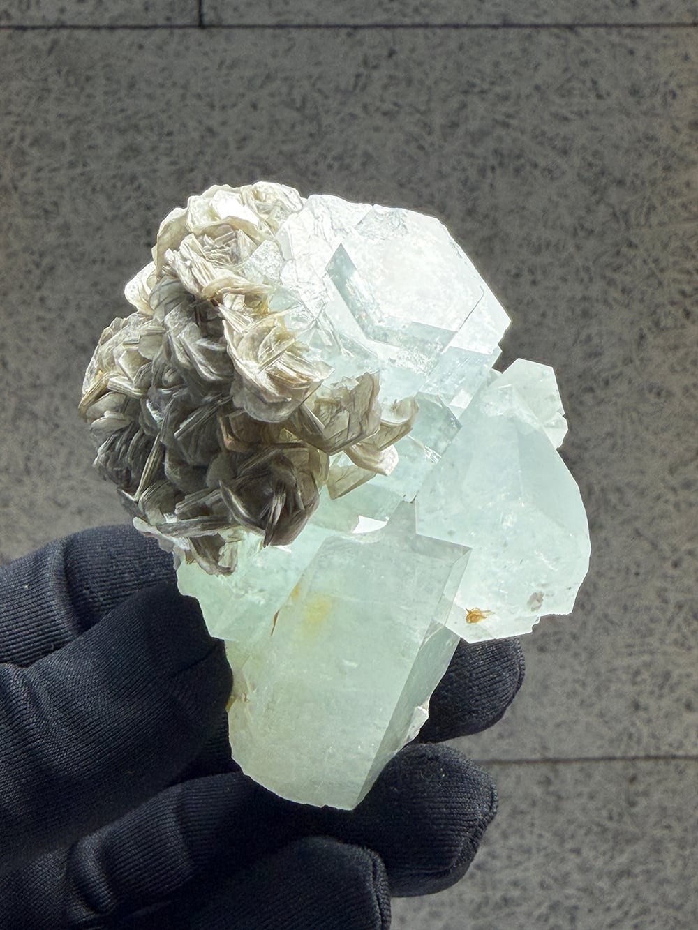 とてもボリュームのあるアクアマリンの原石。いくつも結晶が幾何学的に連なって生成されており、美しいアクアマリンブルーとマイカのシルバーがアクセントになって、照りも良く素晴らしい景色を作り出しています。結晶内にいくつか虹も見ることができ、とても鑑賞価値の高い一点です。