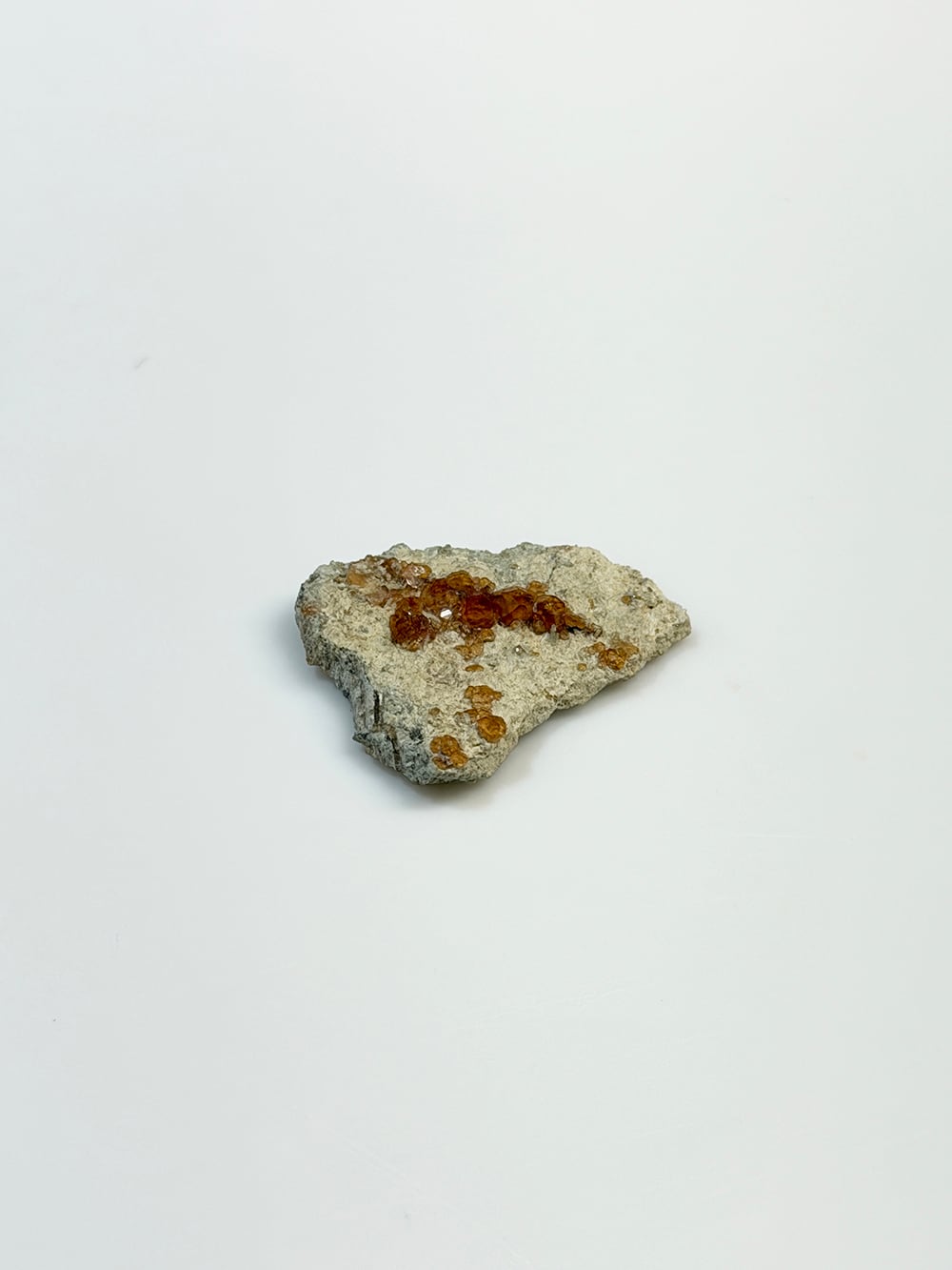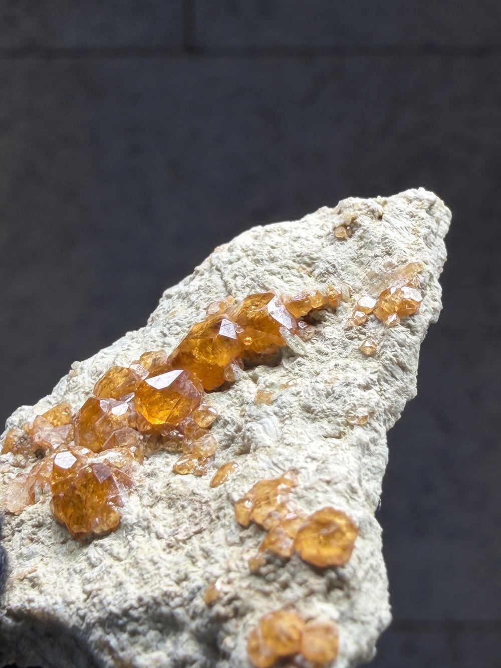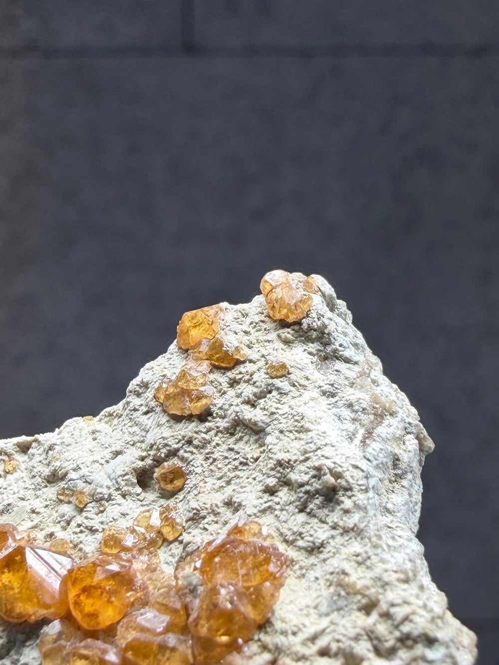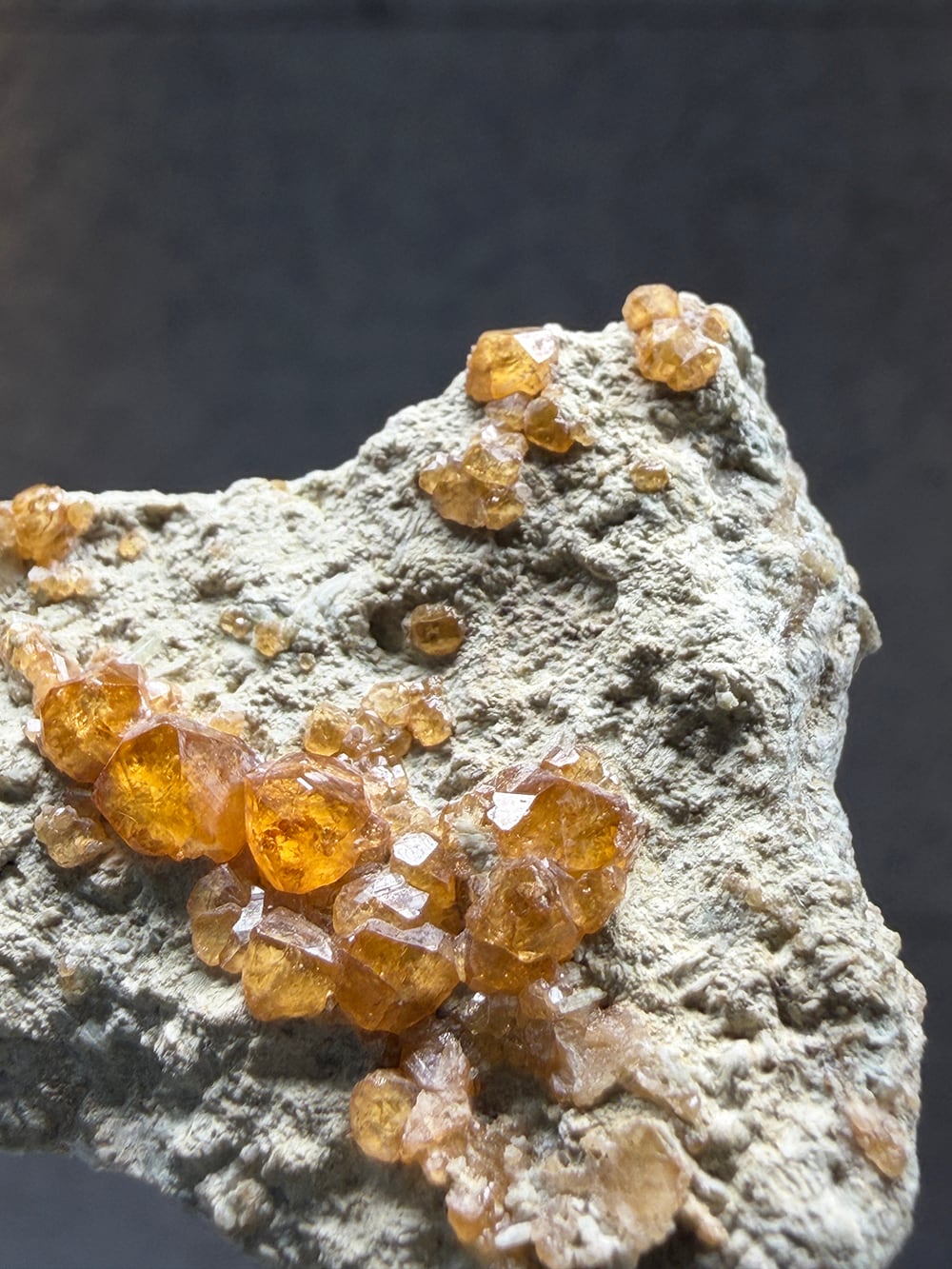 美しいオレンジカラーの宝石、ヘソナイトガーネット。連なって母岩に生成されている姿はとても趣深い景色です。マットな母岩との色と艶のコントラストも美しく、とても美しい一点。オレンジガーネットとも呼ばれるその色もとても魅力的です。