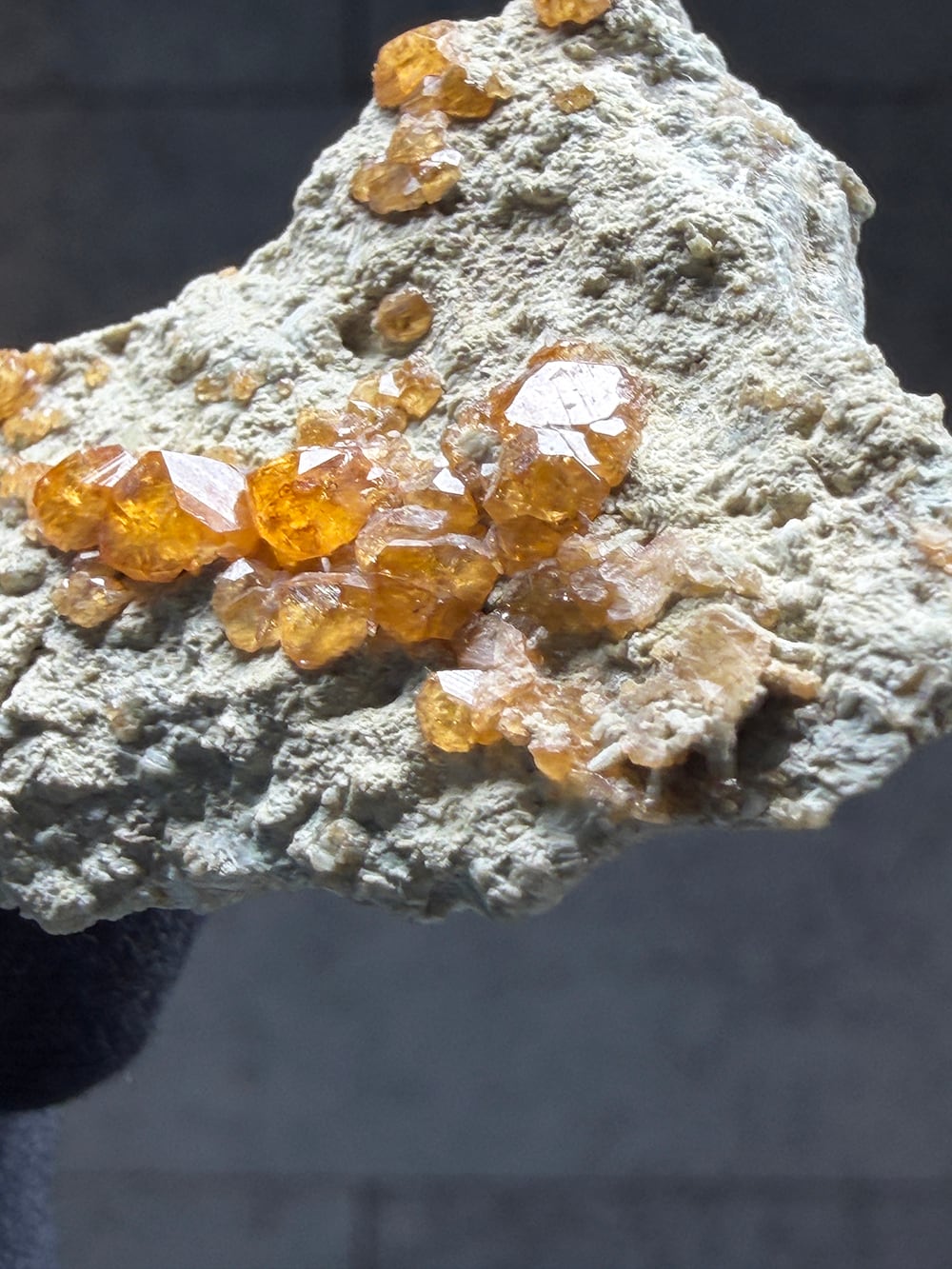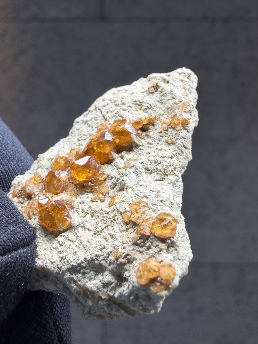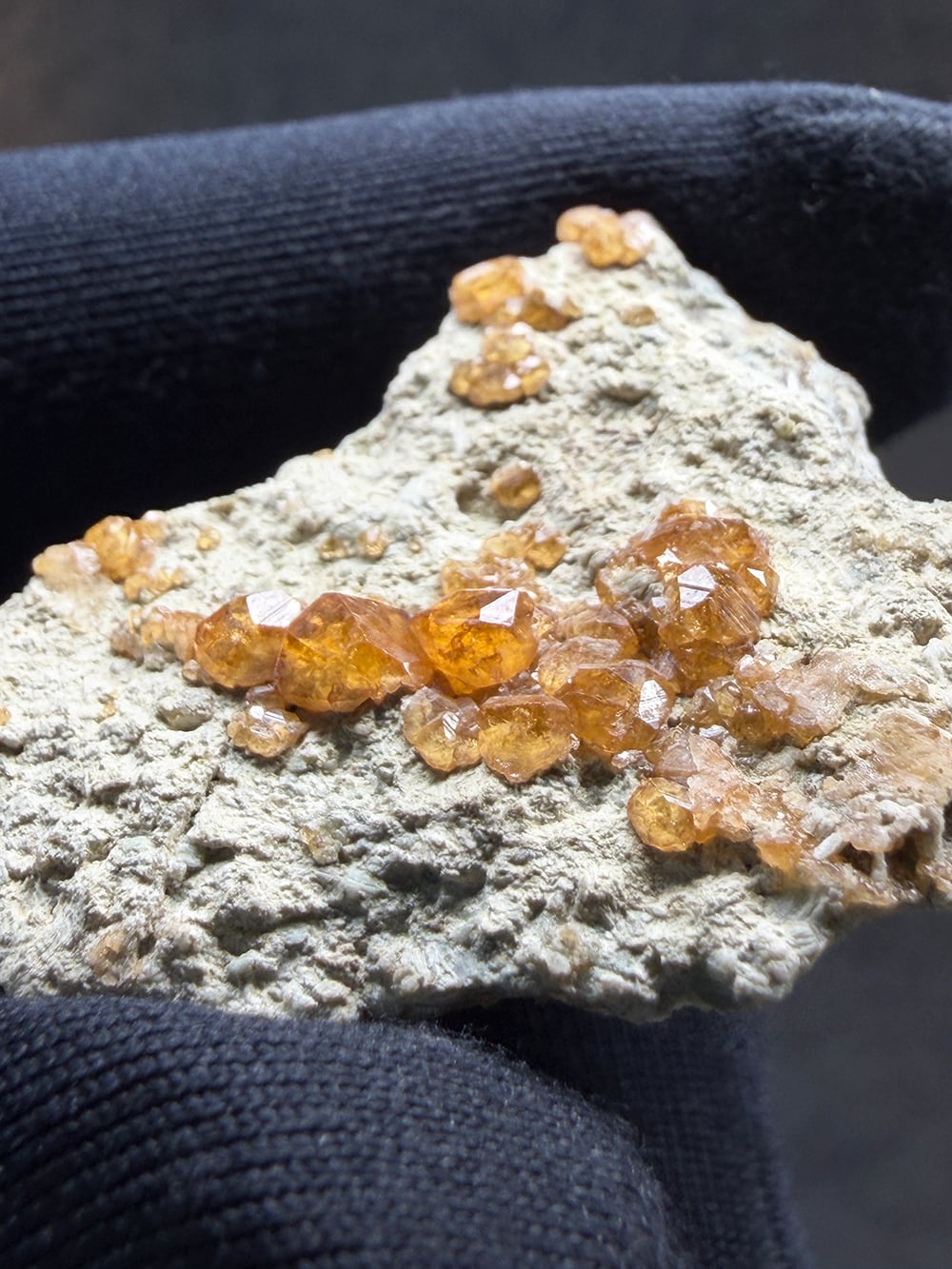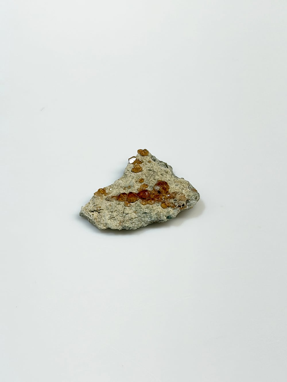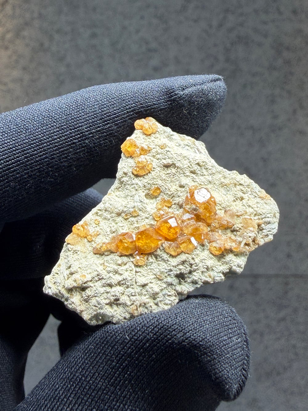 美しいオレンジカラーの宝石、ヘソナイトガーネット。連なって母岩に生成されている姿はとても趣深い景色です。マットな母岩との色と艶のコントラストも美しく、とても美しい一点。オレンジガーネットとも呼ばれるその色もとても魅力的です。