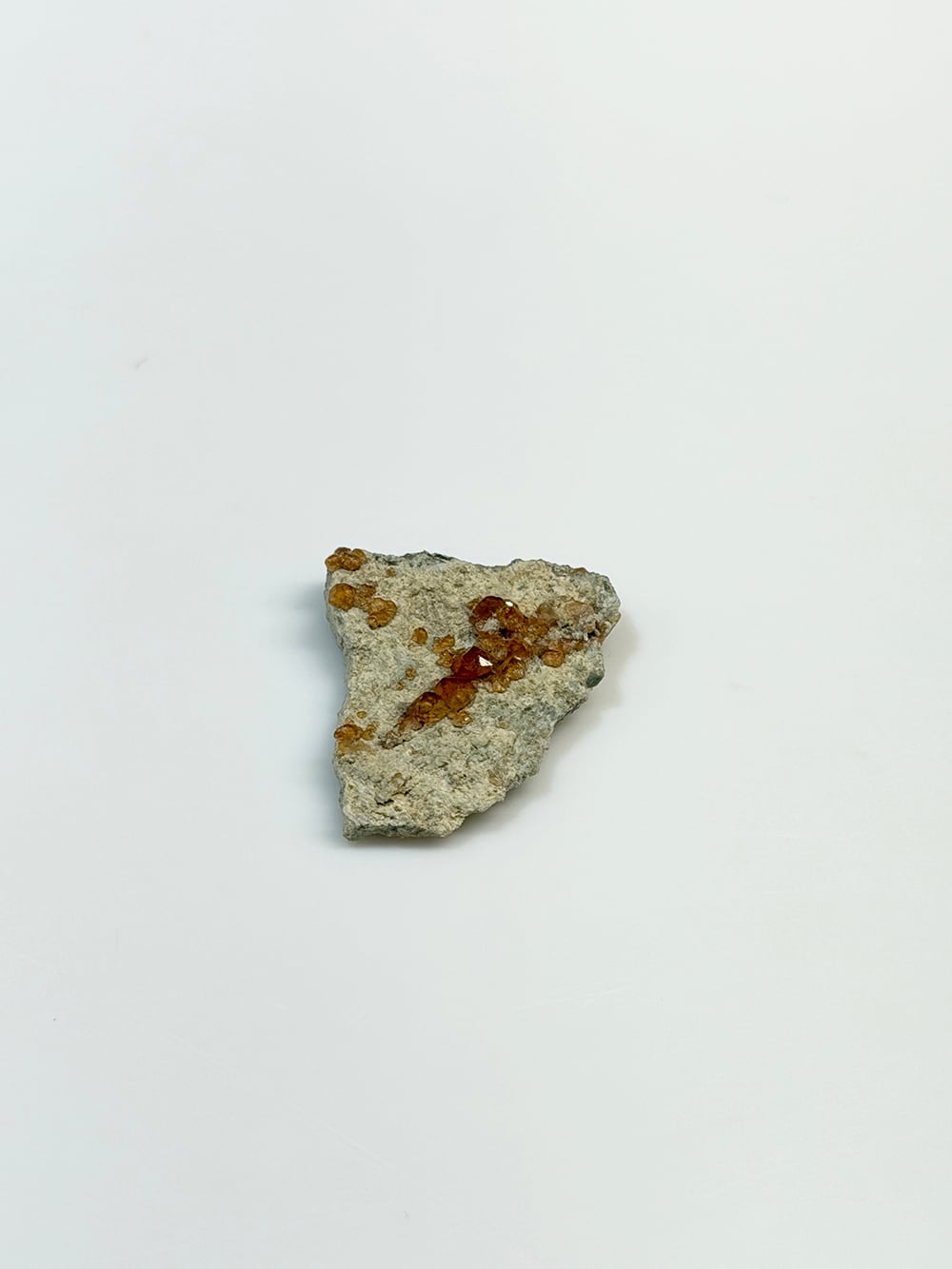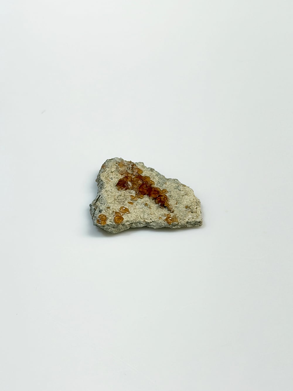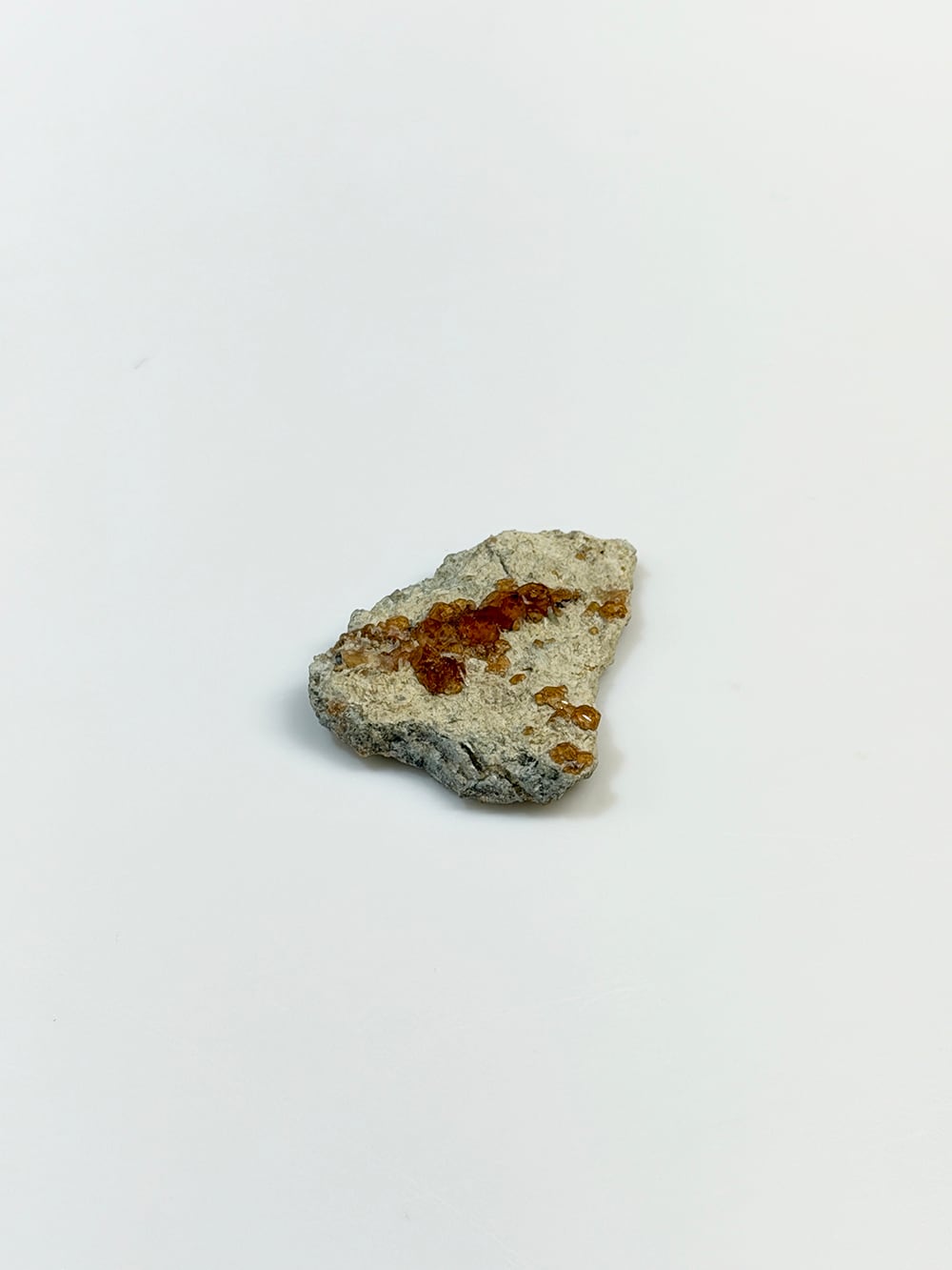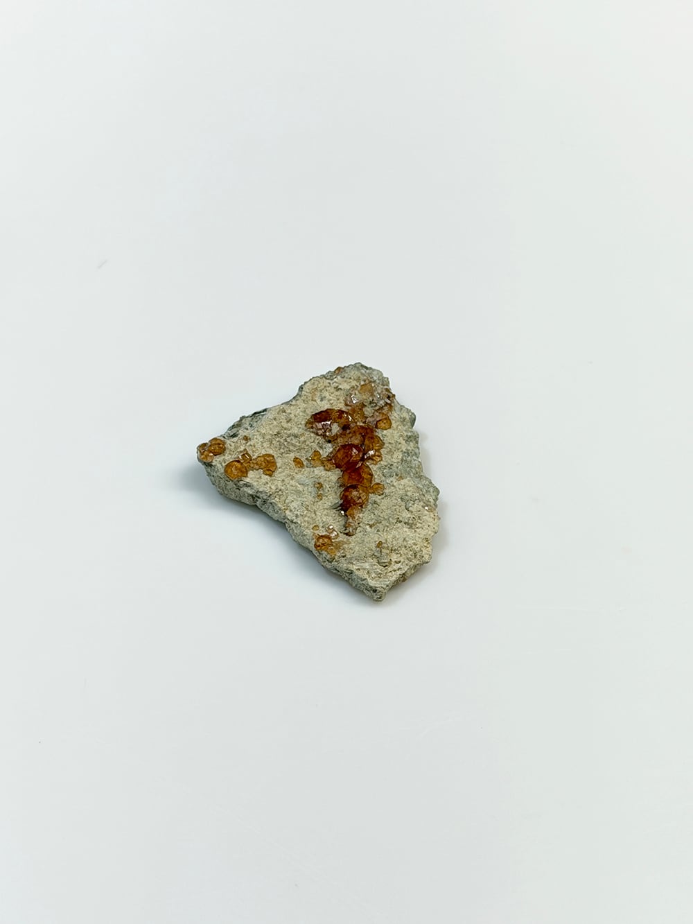 美しいオレンジカラーの宝石、ヘソナイトガーネット。連なって母岩に生成されている姿はとても趣深い景色です。マットな母岩との色と艶のコントラストも美しく、とても美しい一点。オレンジガーネットとも呼ばれるその色もとても魅力的です。