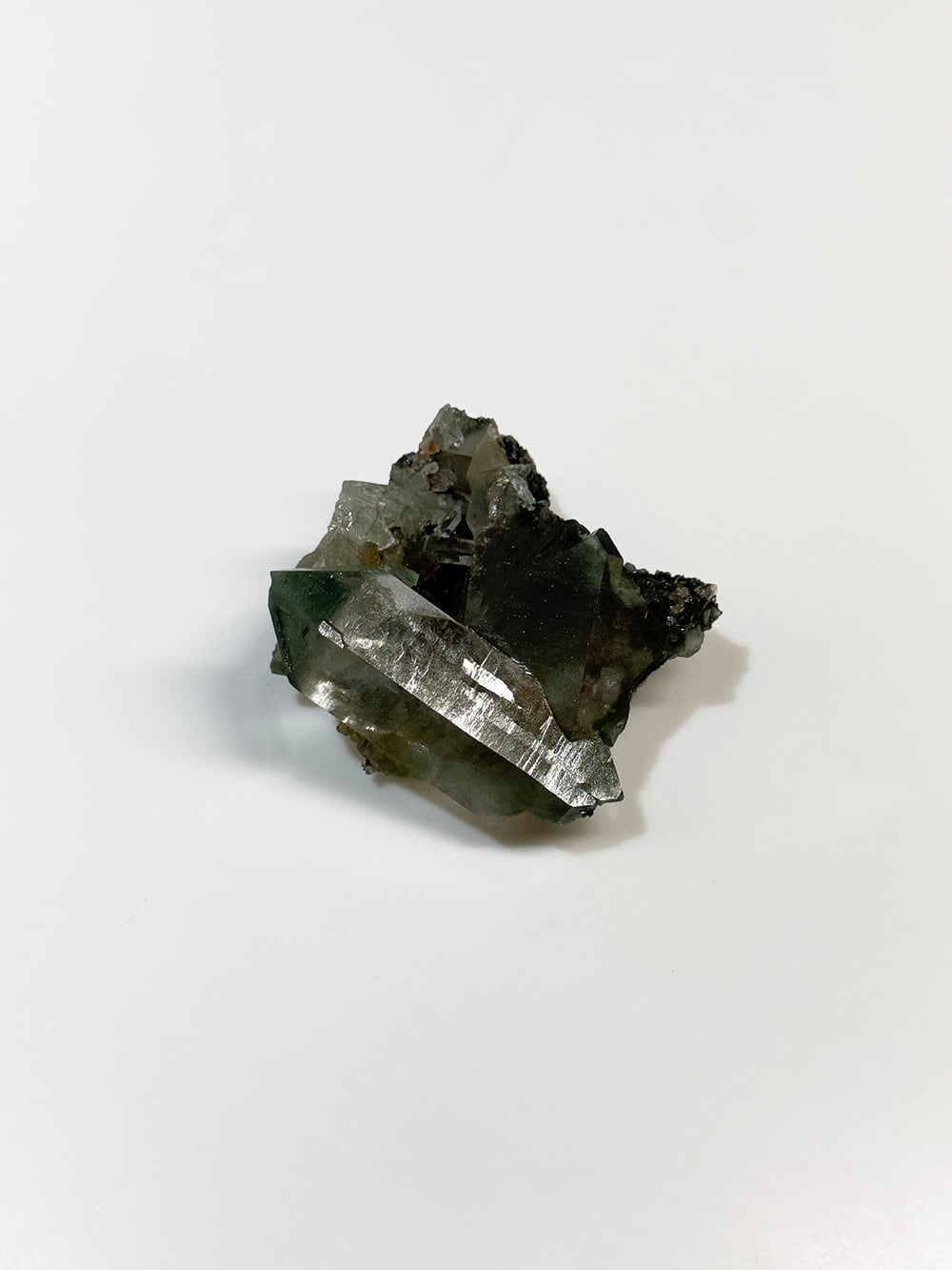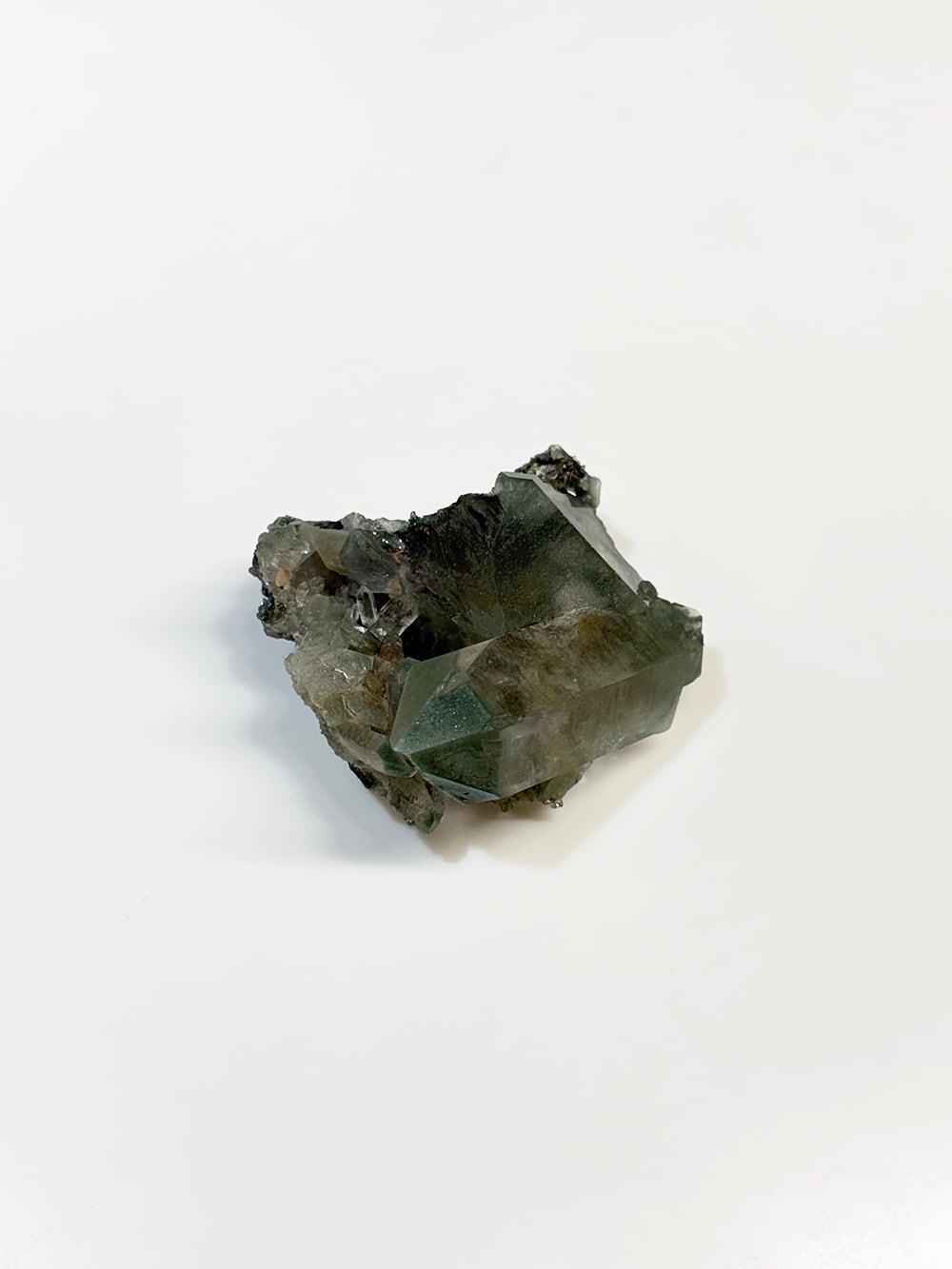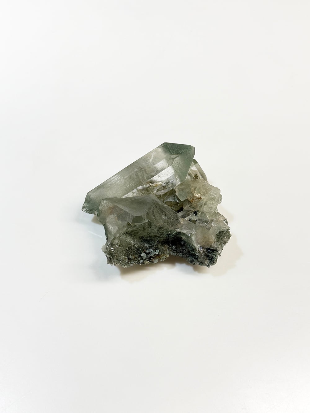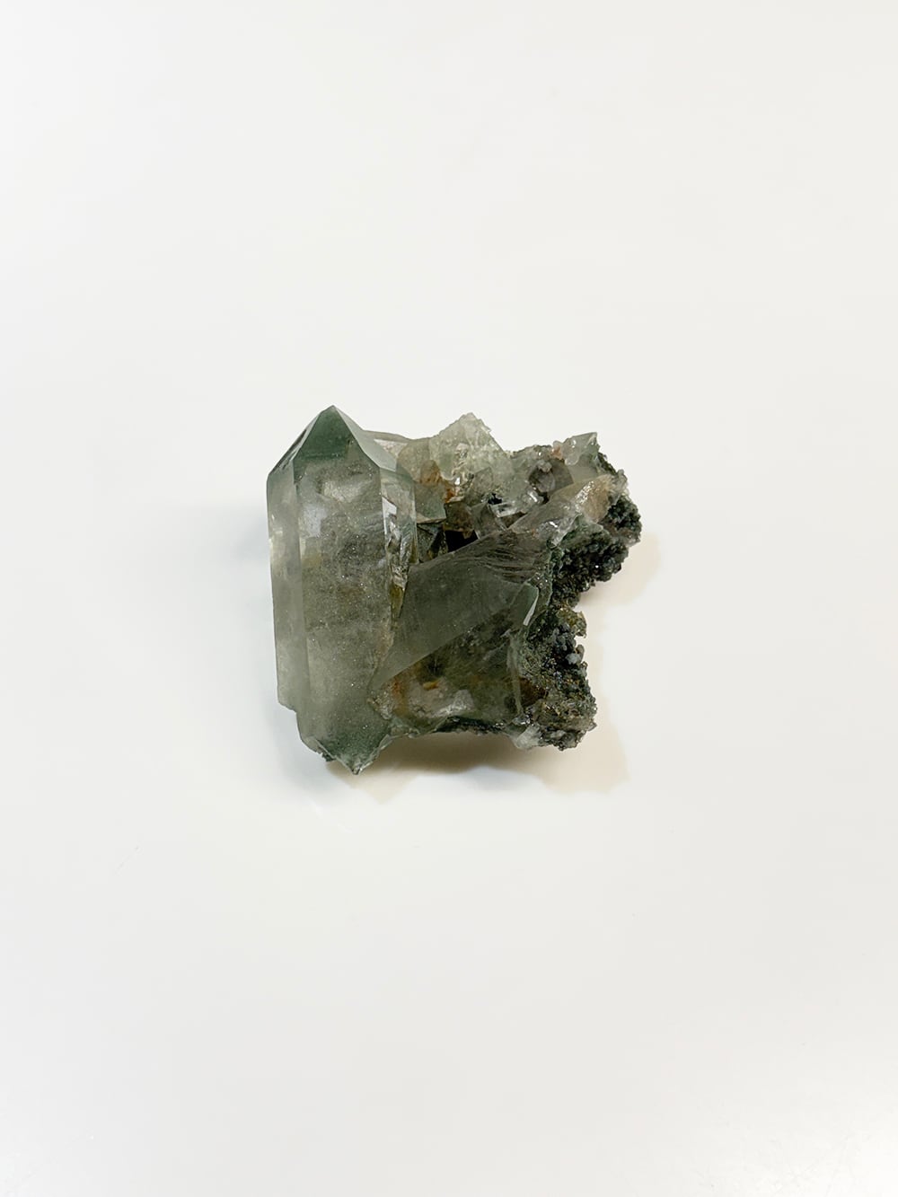 クォーツ、クローライト、そして少しルチルを見ることができるマニハールらしい鉱物。少し複雑に入り組んで生成されているクォーツも美しく、表面全体に薄く積もったようなクローライトも素晴らしい表情をしています。色々な角度からの景色を楽しめる一点です。