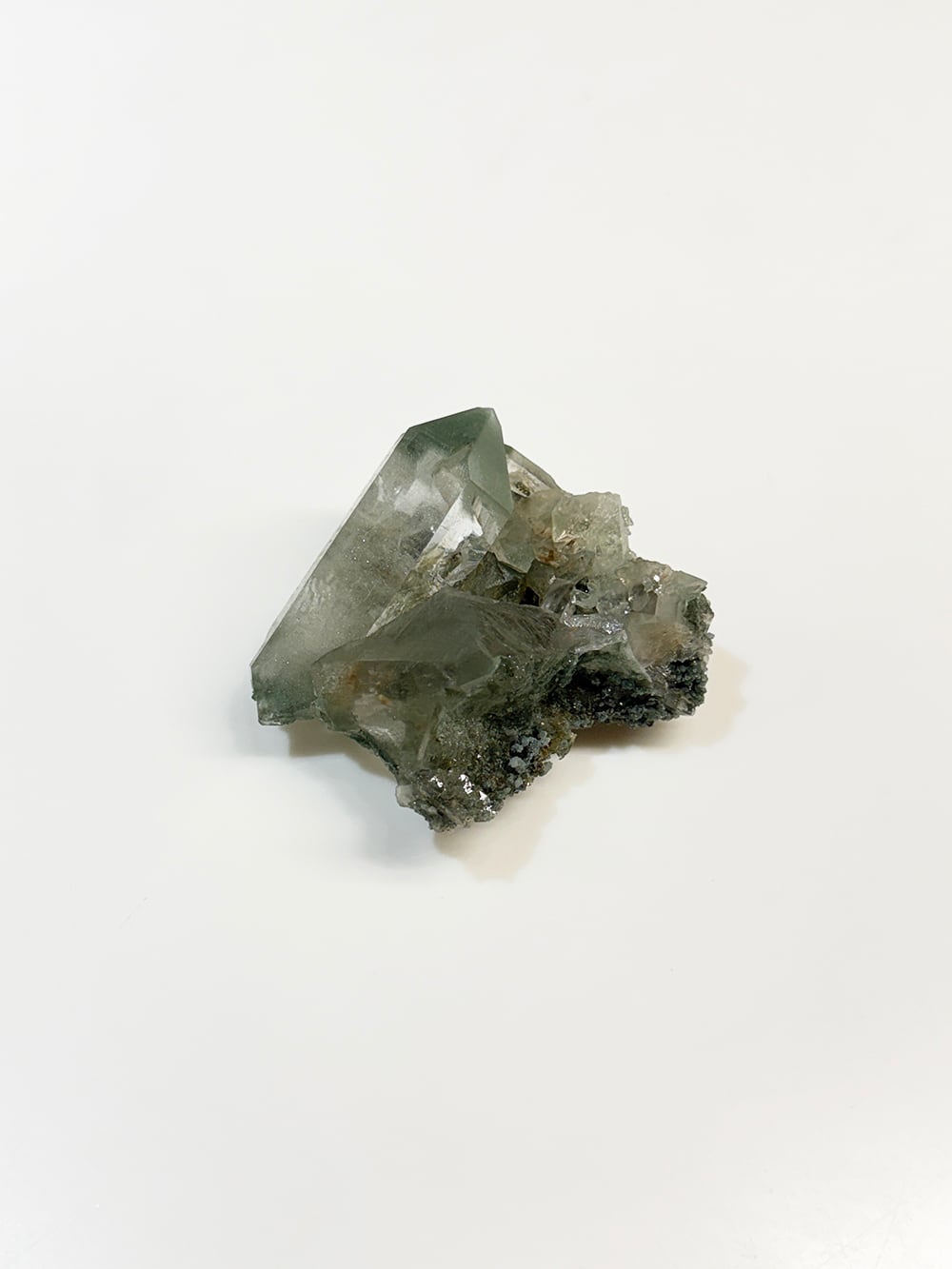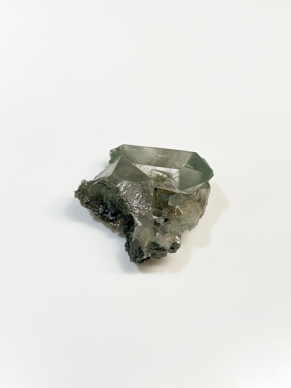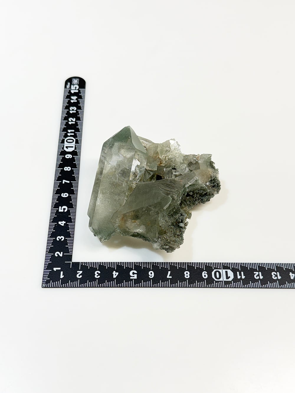 クォーツ、クローライト、そして少しルチルを見ることができるマニハールらしい鉱物。少し複雑に入り組んで生成されているクォーツも美しく、表面全体に薄く積もったようなクローライトも素晴らしい表情をしています。色々な角度からの景色を楽しめる一点です。