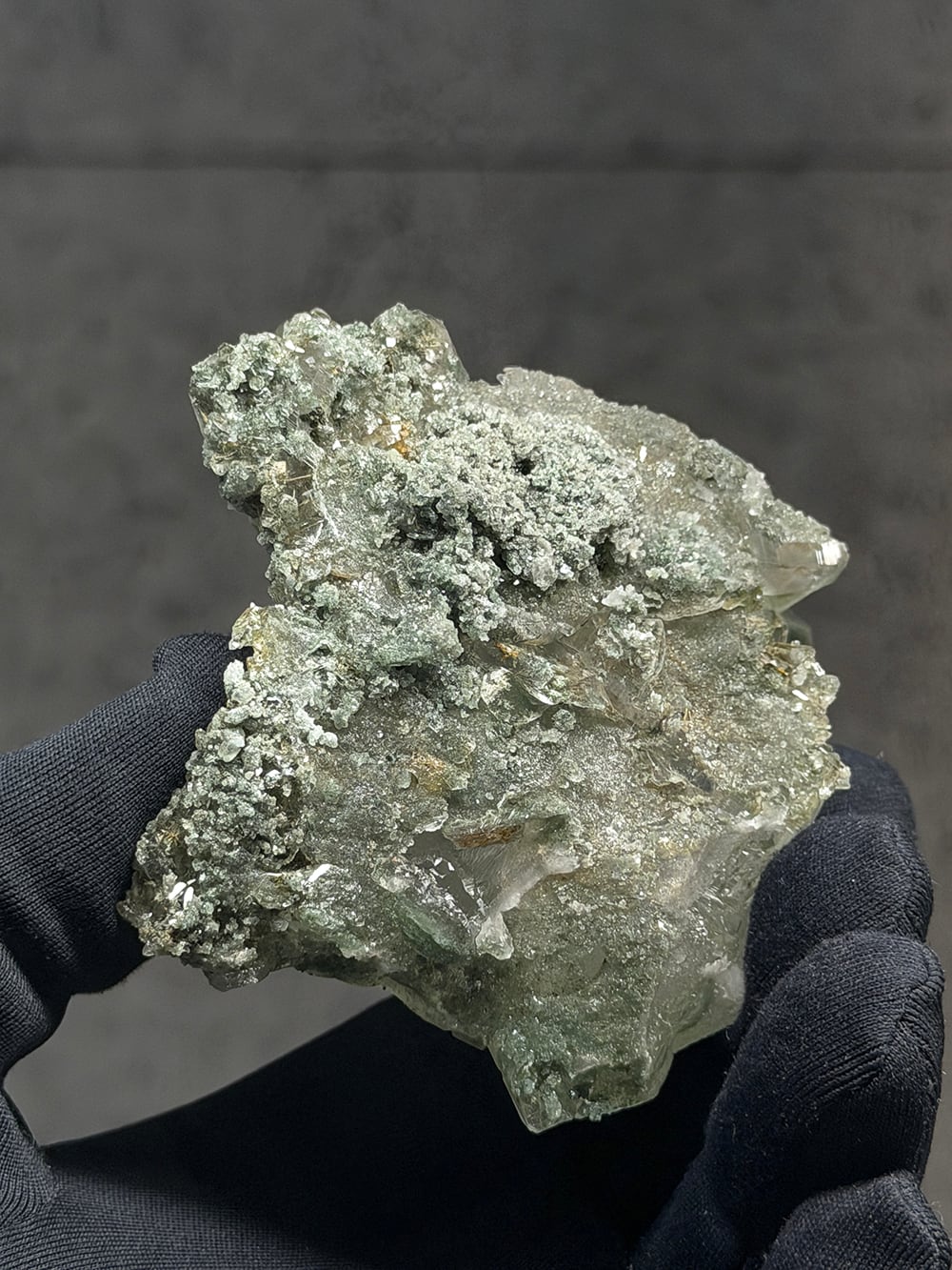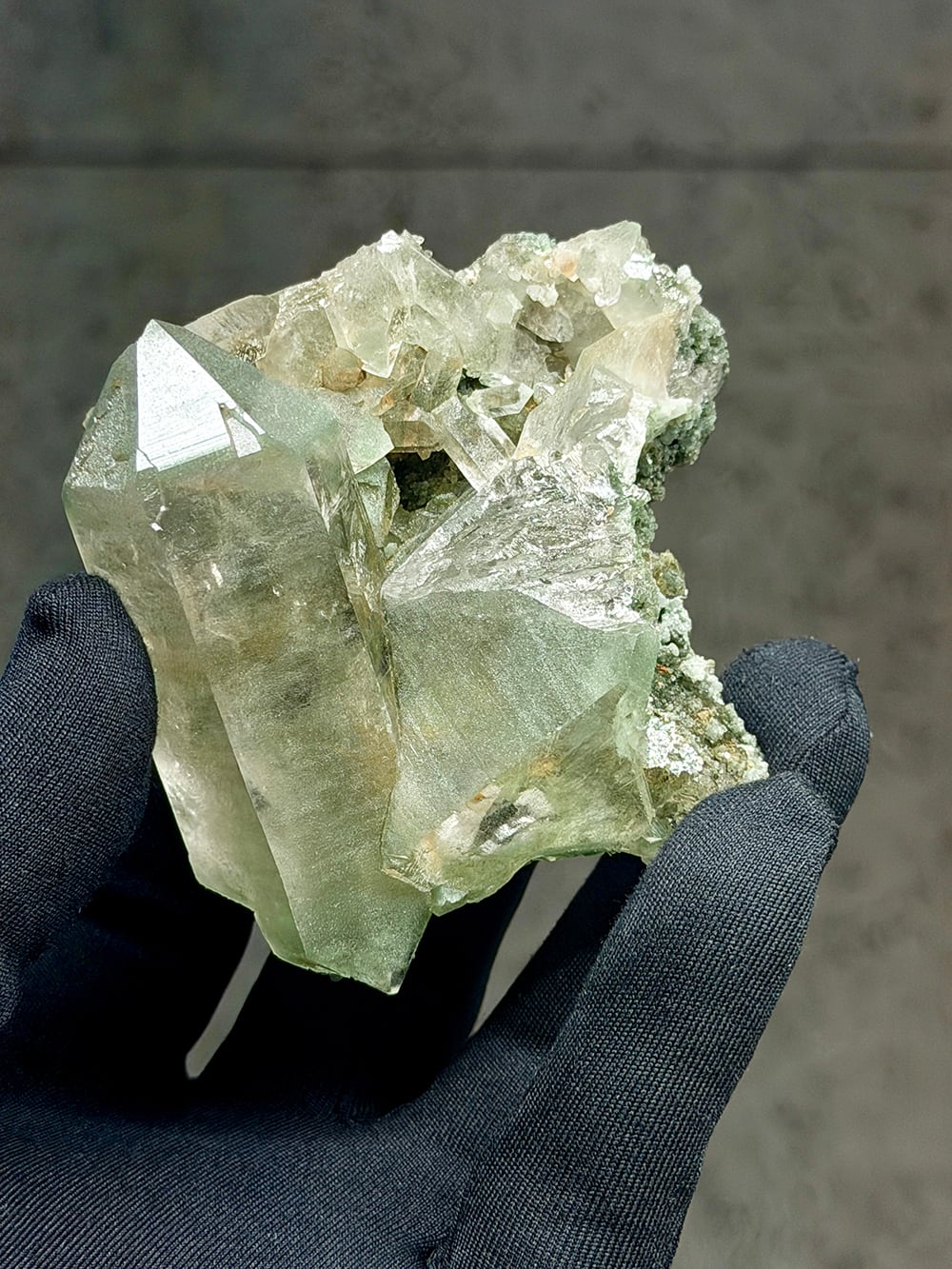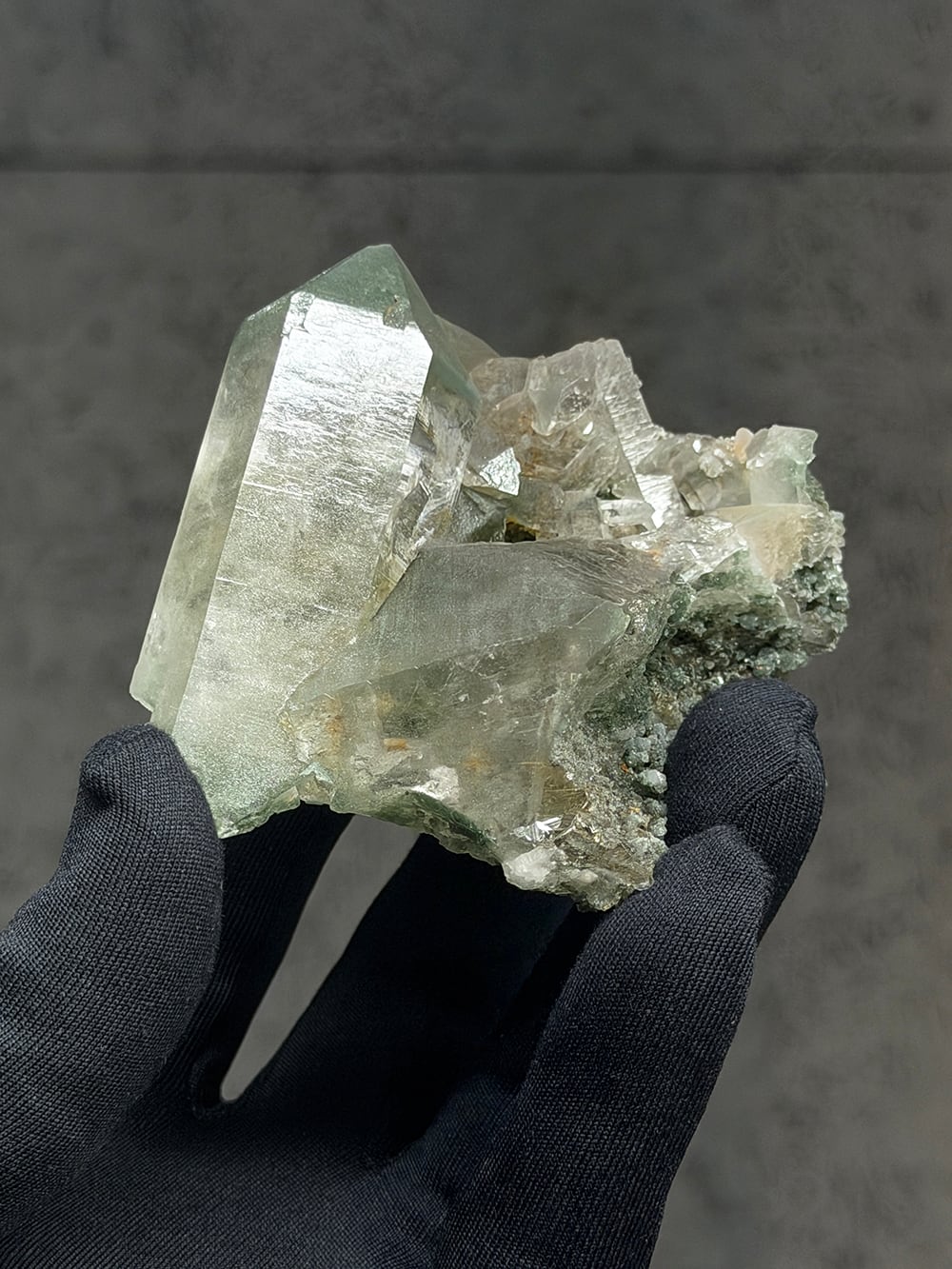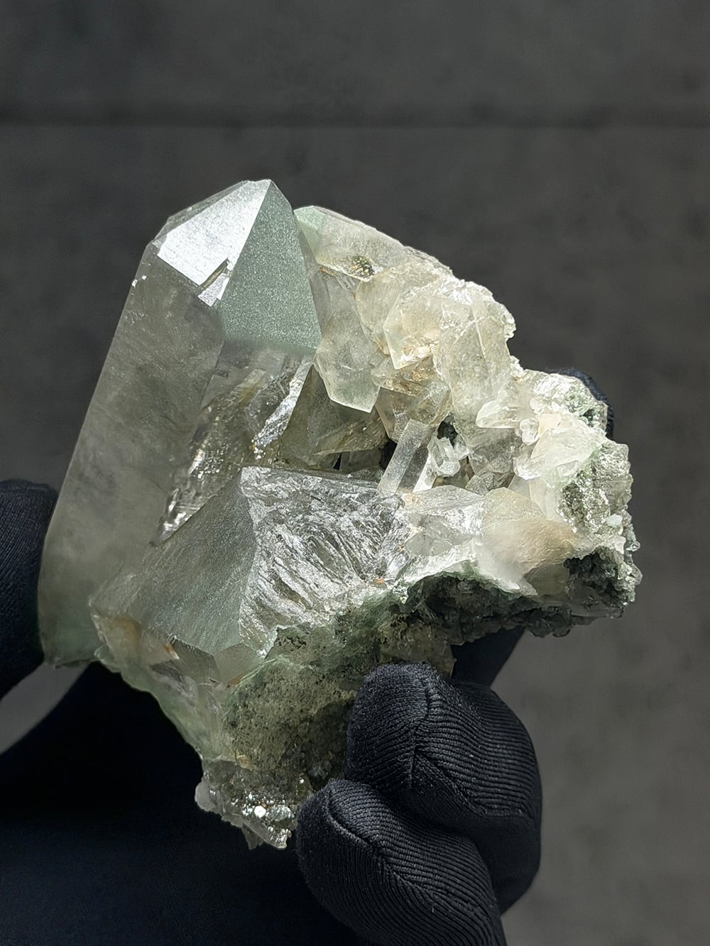クォーツ、クローライト、そして少しルチルを見ることができるマニハールらしい鉱物。少し複雑に入り組んで生成されているクォーツも美しく、表面全体に薄く積もったようなクローライトも素晴らしい表情をしています。色々な角度からの景色を楽しめる一点です。
