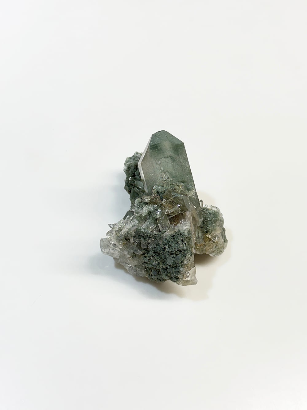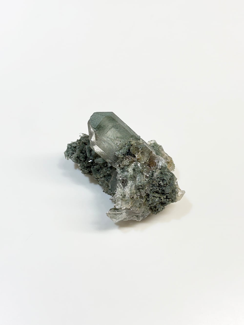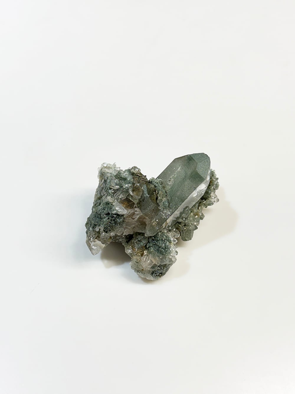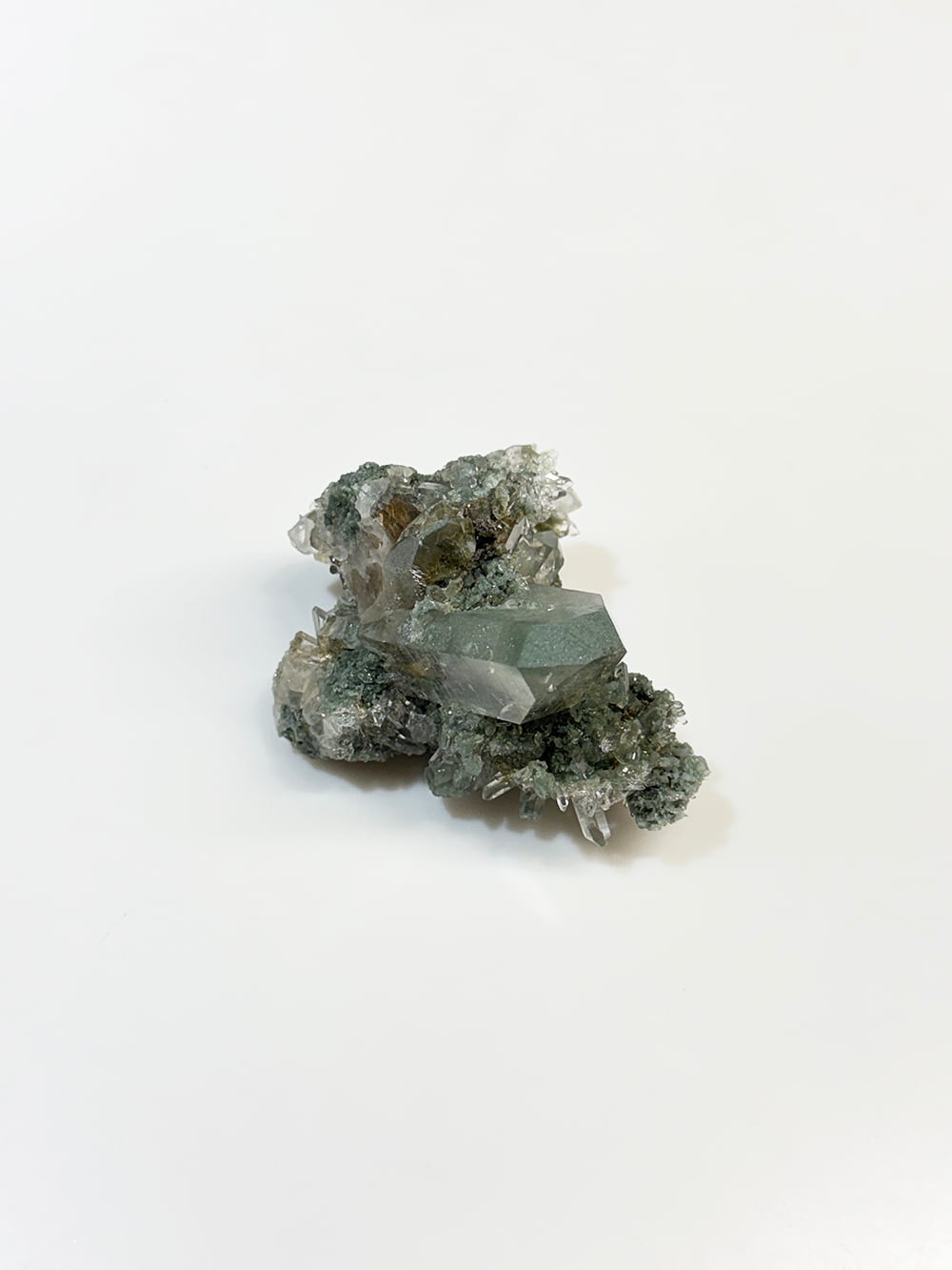 クォーツとクローライトがとても美しく生成されており、その中にルチルも覗き見ることができる素晴らしい一点。全体に散りばめられている小さなクォーツ達も、光の当て方でキラキラと輝きます。どの角度から見ても違う景色を楽しむことが出来る、マニハールらしい鉱物です。