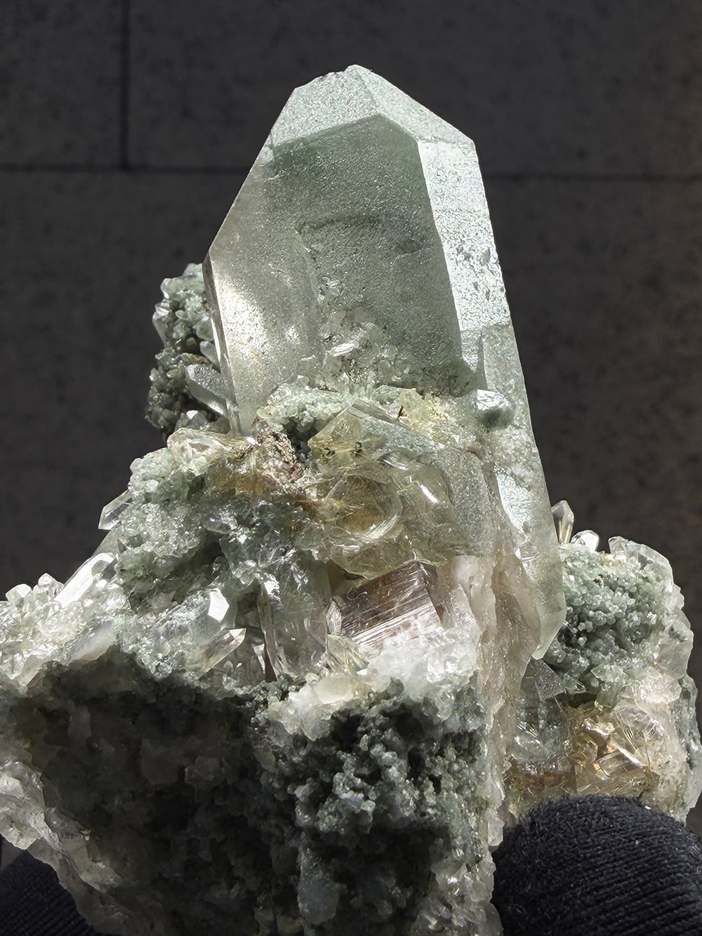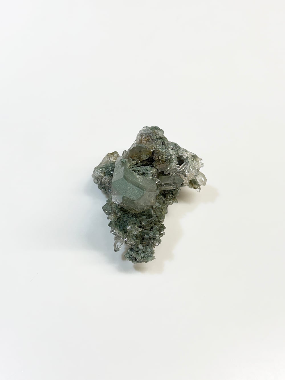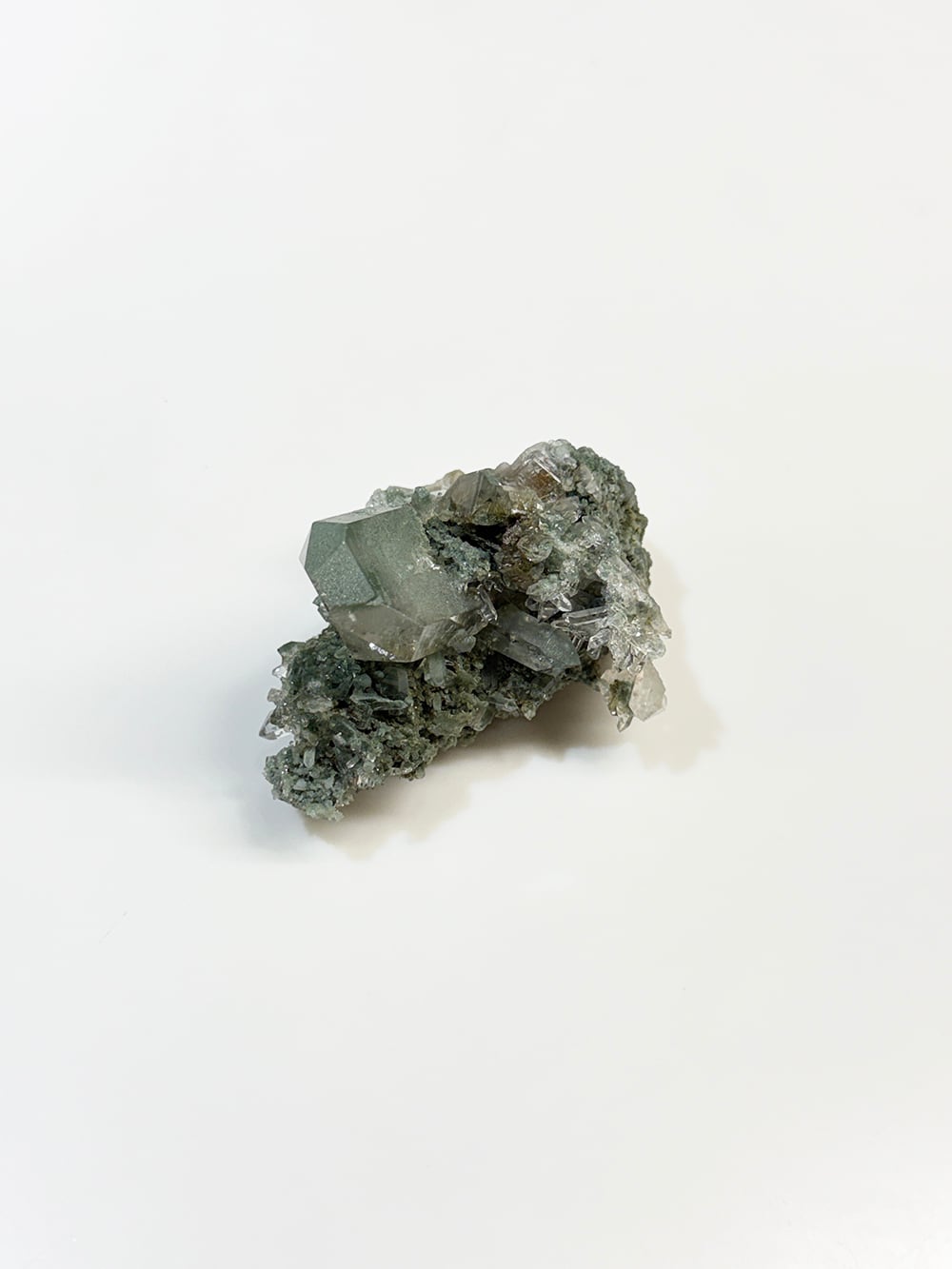 クォーツとクローライトがとても美しく生成されており、その中にルチルも覗き見ることができる素晴らしい一点。全体に散りばめられている小さなクォーツ達も、光の当て方でキラキラと輝きます。どの角度から見ても違う景色を楽しむことが出来る、マニハールらしい鉱物です。