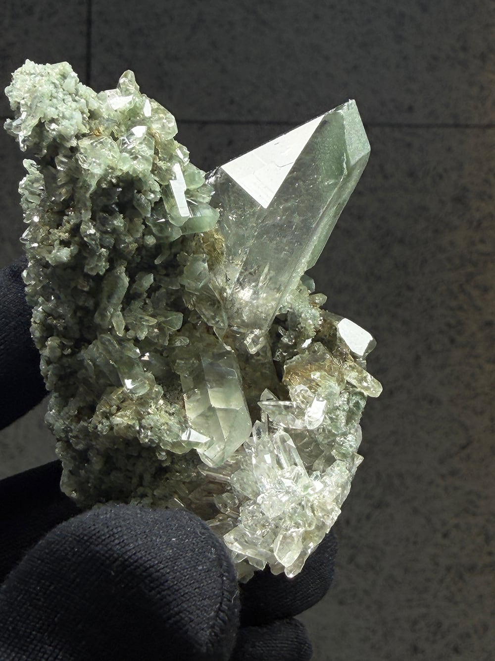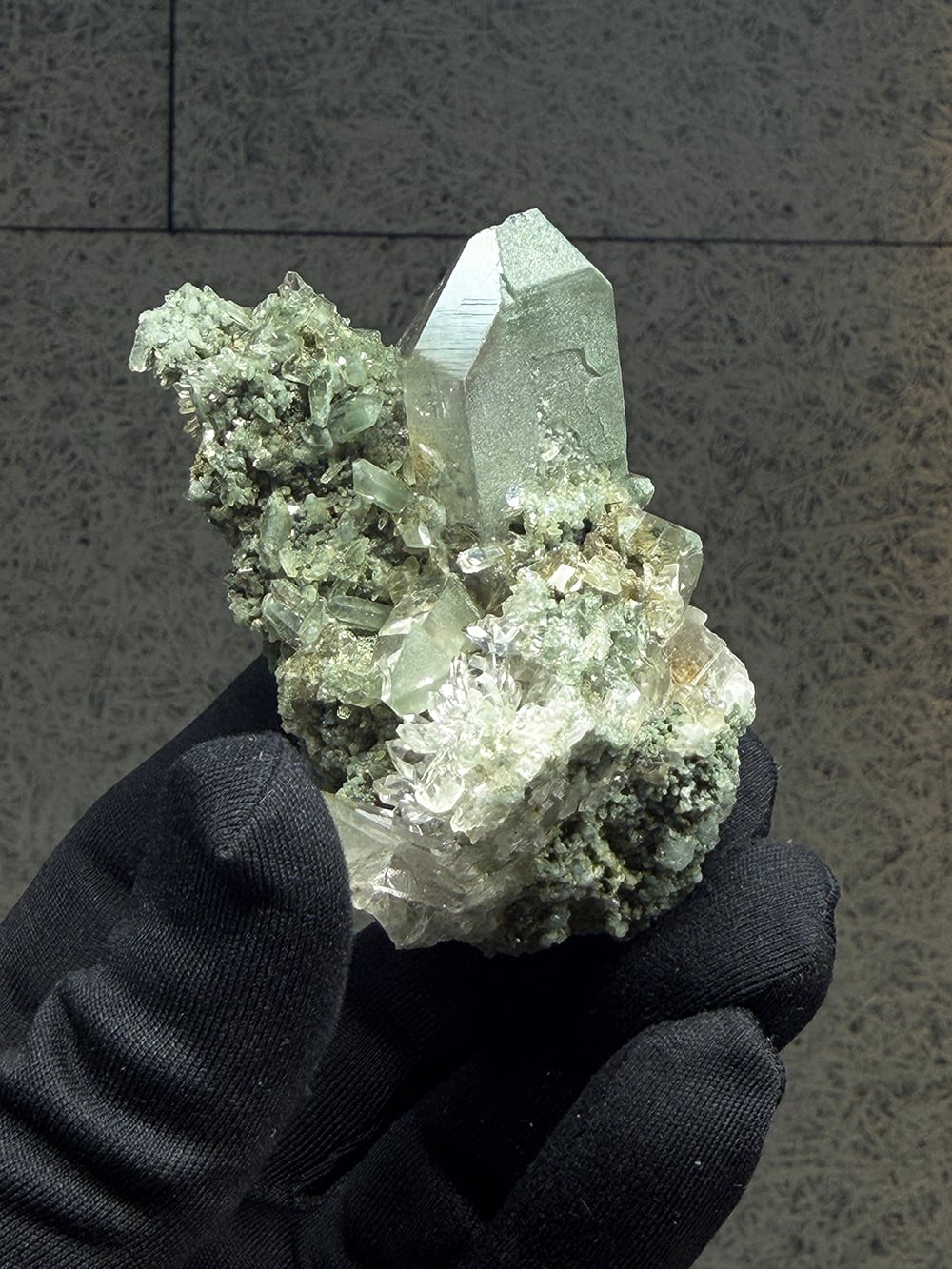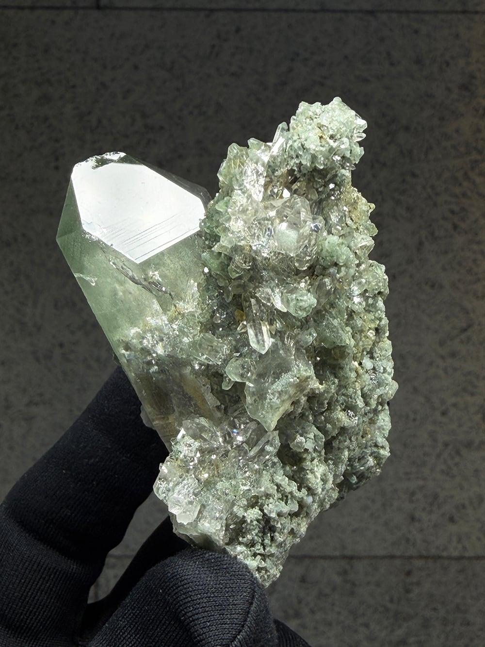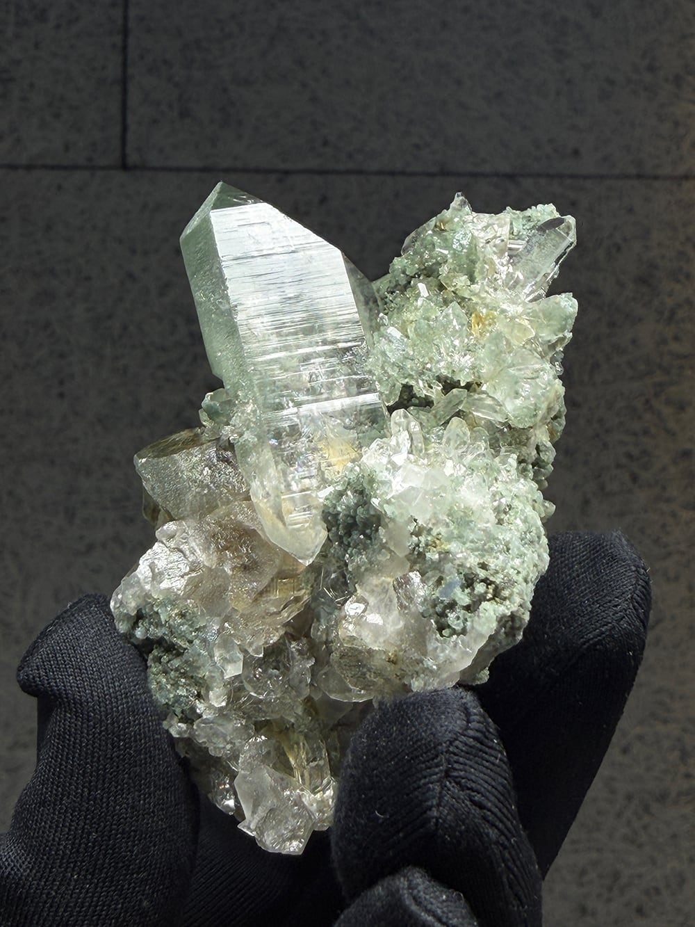 クォーツとクローライトがとても美しく生成されており、その中にルチルも覗き見ることができる素晴らしい一点。全体に散りばめられている小さなクォーツ達も、光の当て方でキラキラと輝きます。どの角度から見ても違う景色を楽しむことが出来る、マニハールらしい鉱物です。