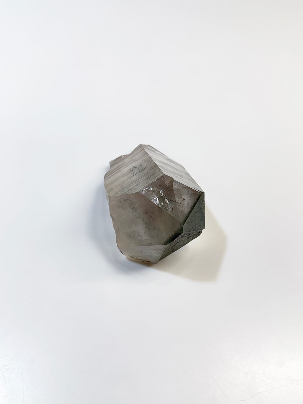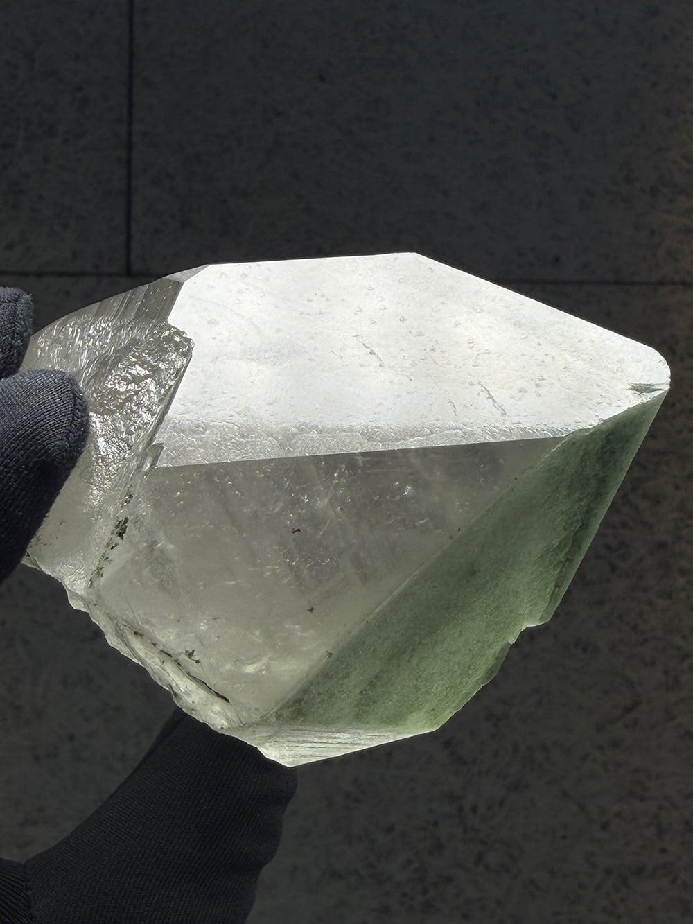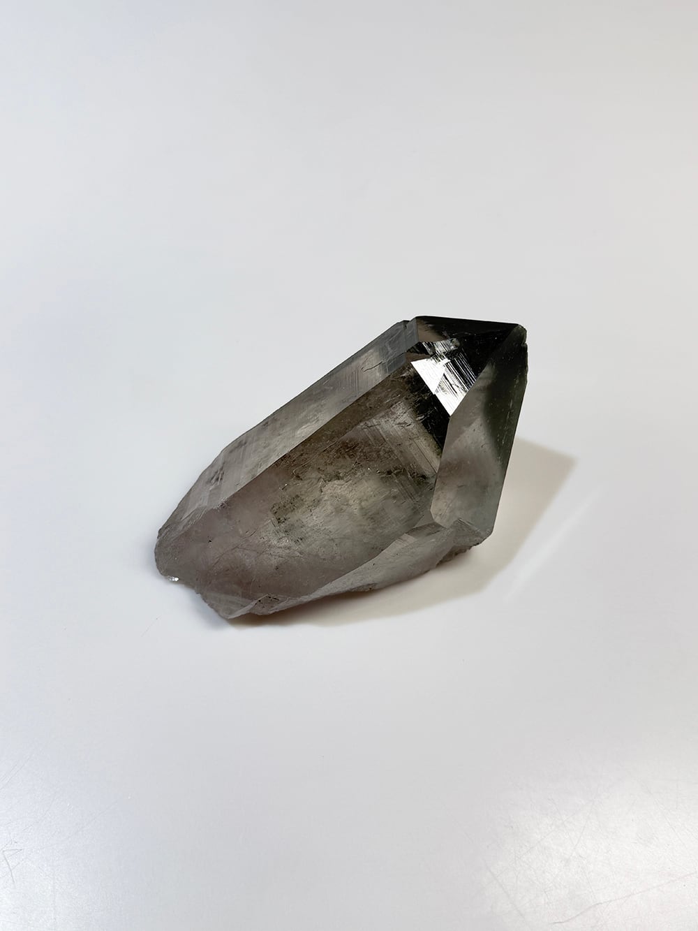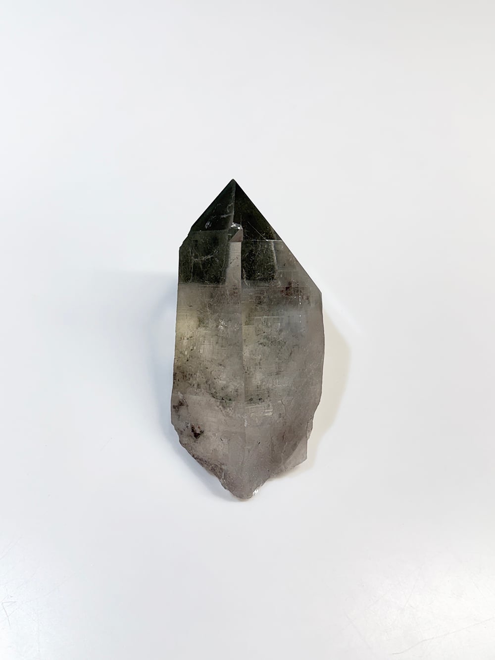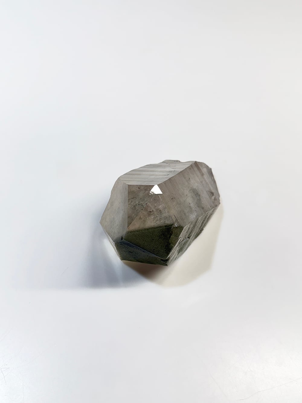 ボリューム感のあるマニハールの単結晶。表面の照りが美しい面と、クローライトが表面に被膜を作って輝く面の両方を楽しむことができます。置いた底の面も再結晶(セルフヒールド)されており、色々な面から楽しむことのできる素晴らしい一点です。