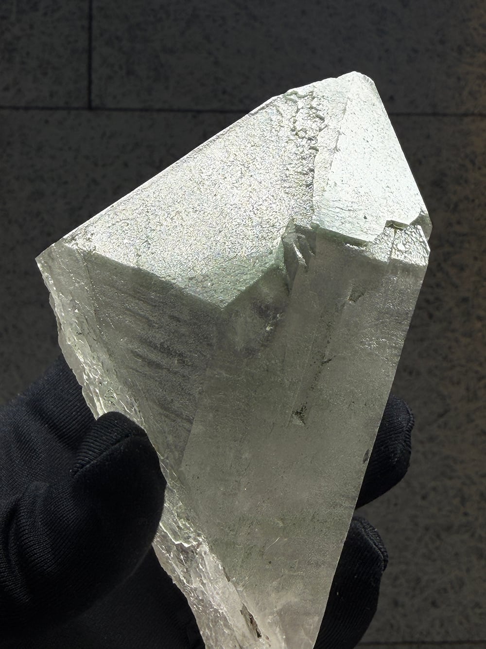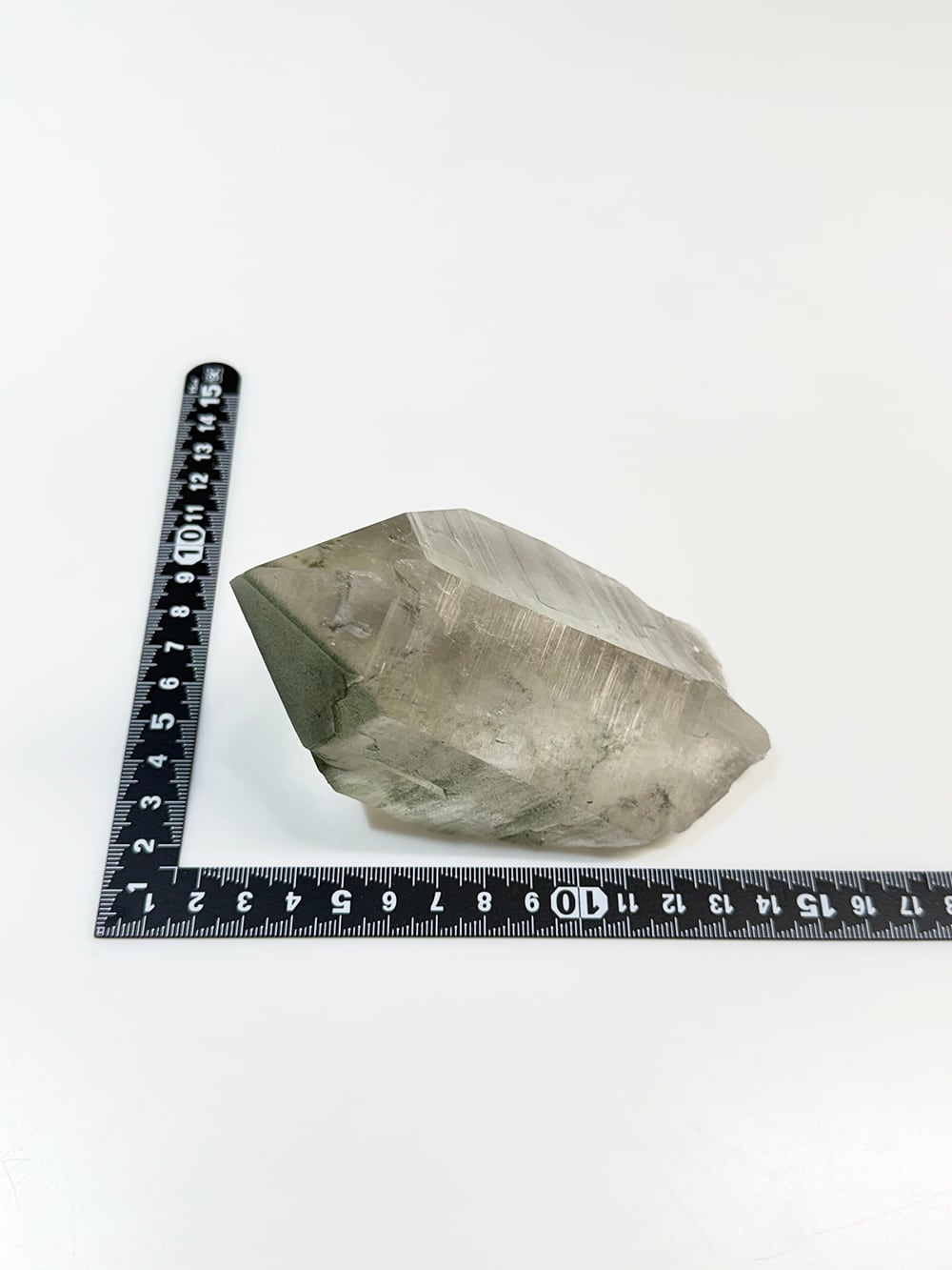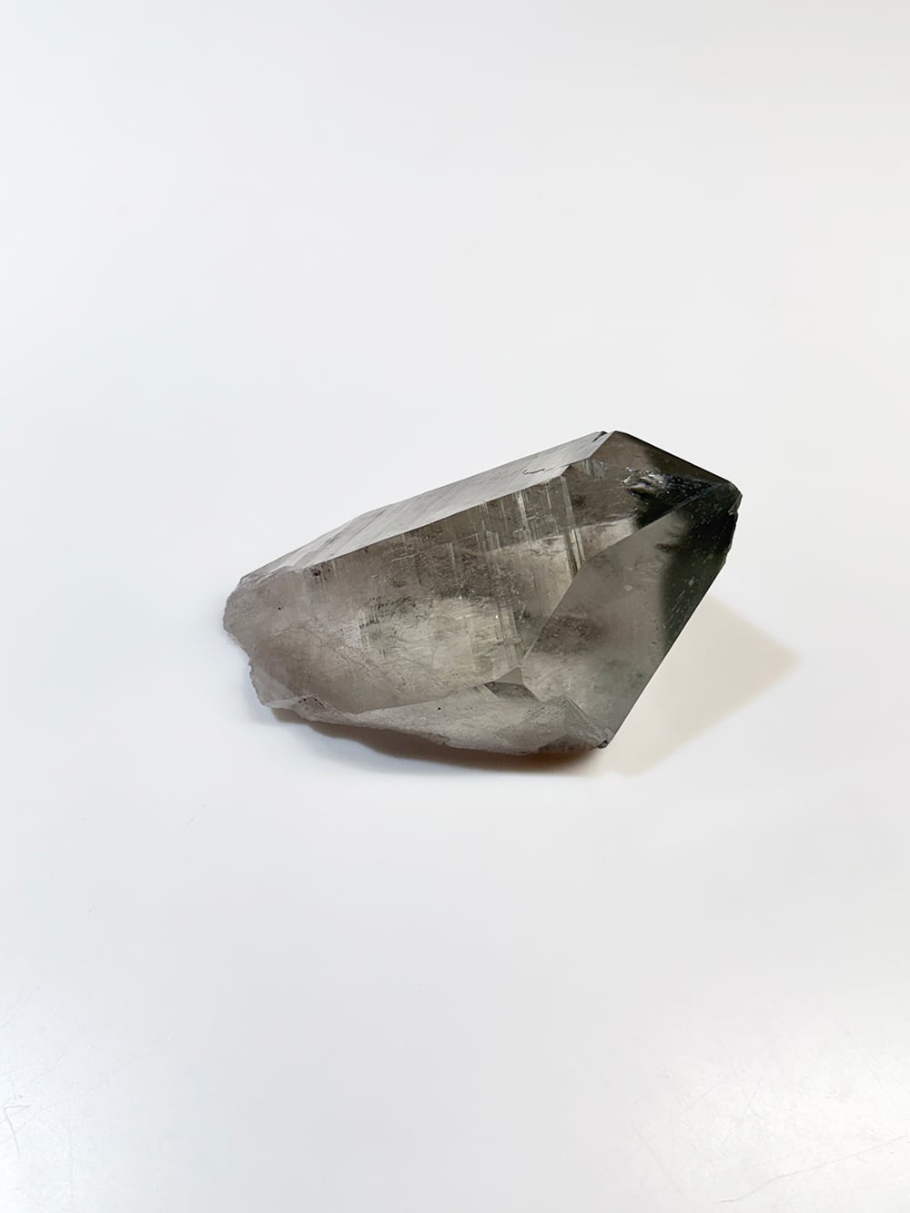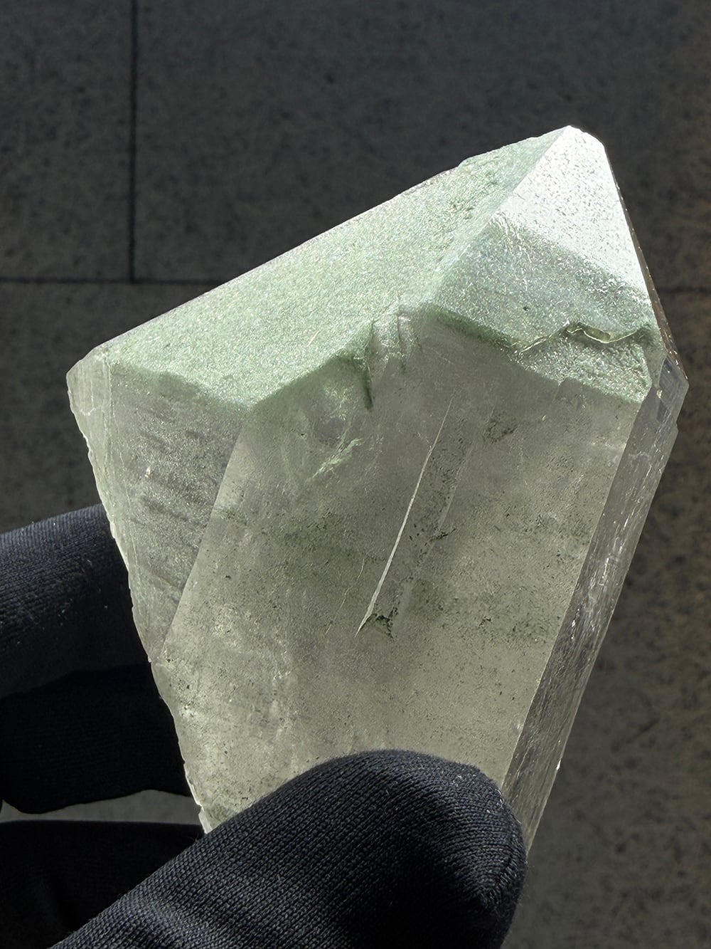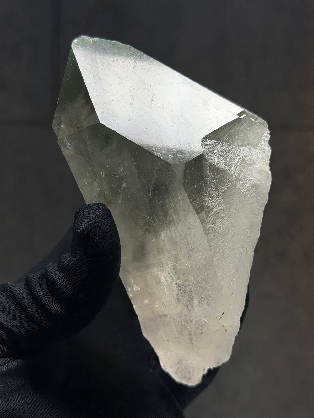 ボリューム感のあるマニハールの単結晶。表面の照りが美しい面と、クローライトが表面に被膜を作って輝く面の両方を楽しむことができます。置いた底の面も再結晶(セルフヒールド)されており、色々な面から楽しむことのできる素晴らしい一点です。