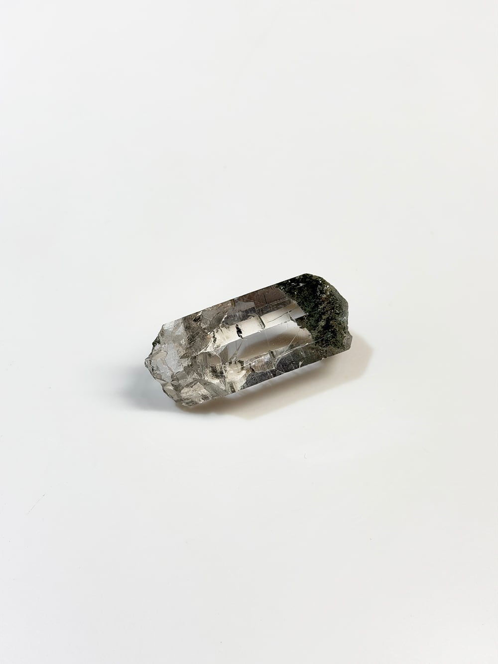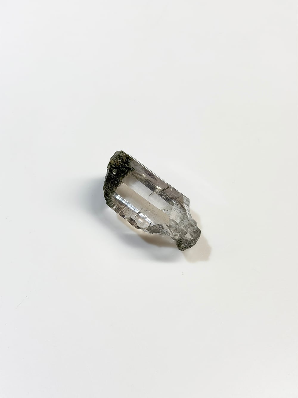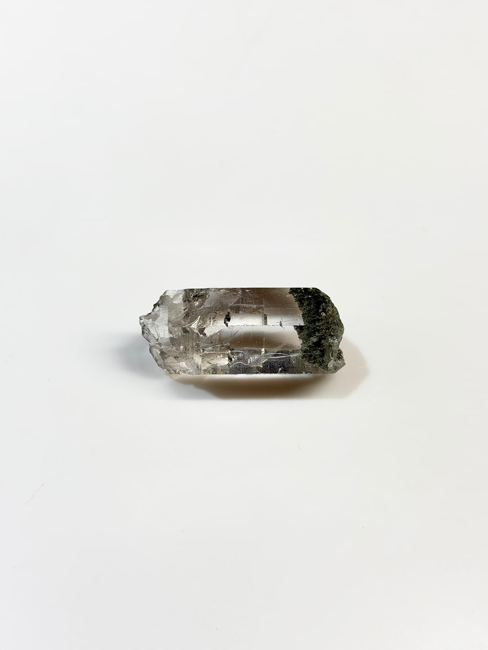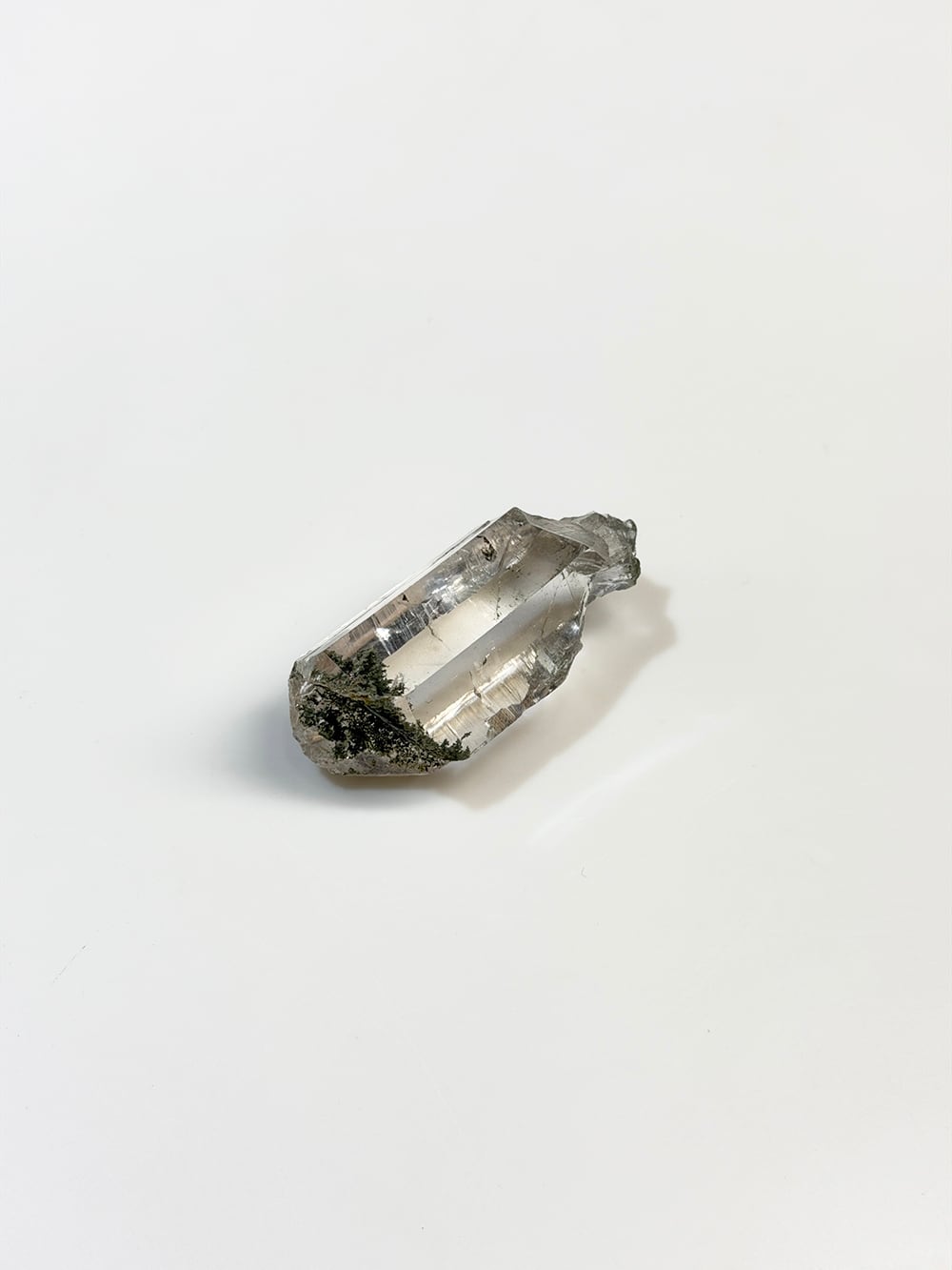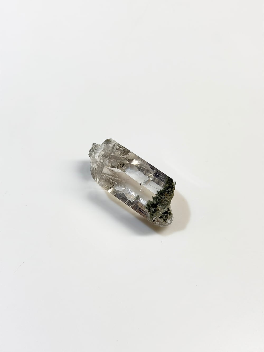 圧倒的な透明感を持ったマニハールクォーツ。そしてよく見るとその中心に美しいファントムを見ることができます。きれいに整った六角形はどの面の照りも素晴らしく、少しインクルージョンされたクローライトはガーデンクォーツにもなっています。手のひらに収まる大きさのクォーツですが、存分にマニハール産の素晴らしさを感じて頂けます。