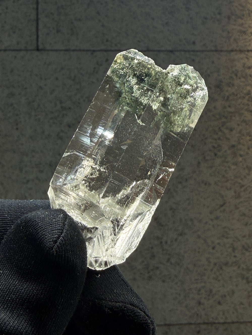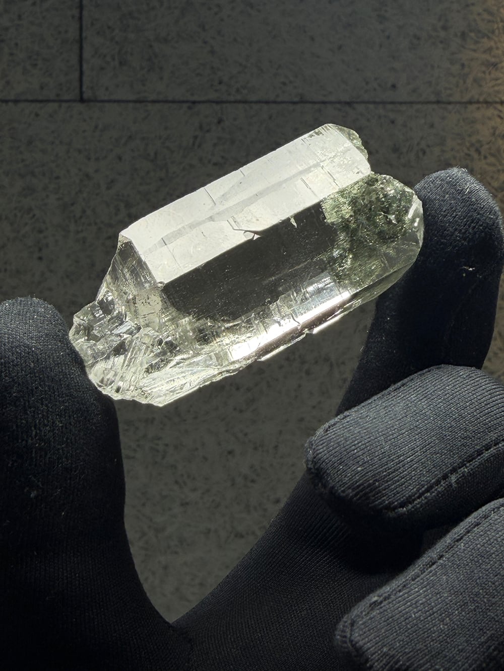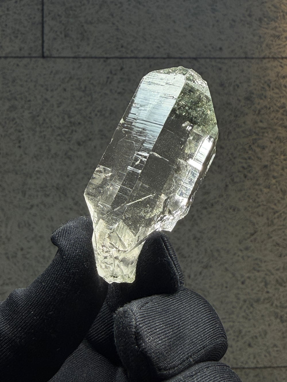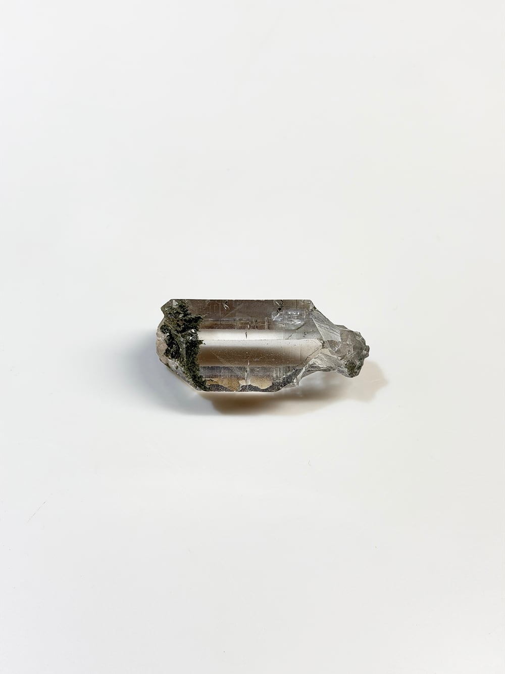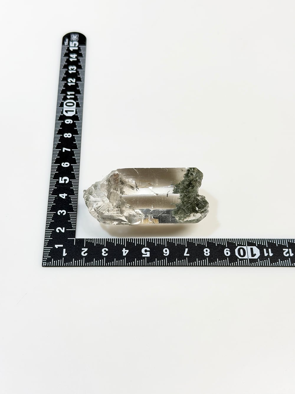 圧倒的な透明感を持ったマニハールクォーツ。そしてよく見るとその中心に美しいファントムを見ることができます。きれいに整った六角形はどの面の照りも素晴らしく、少しインクルージョンされたクローライトはガーデンクォーツにもなっています。手のひらに収まる大きさのクォーツですが、存分にマニハール産の素晴らしさを感じて頂けます。