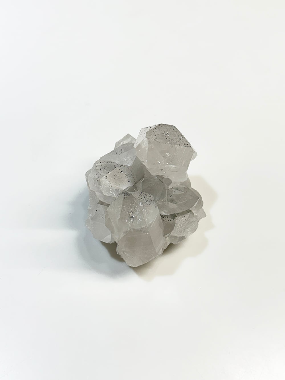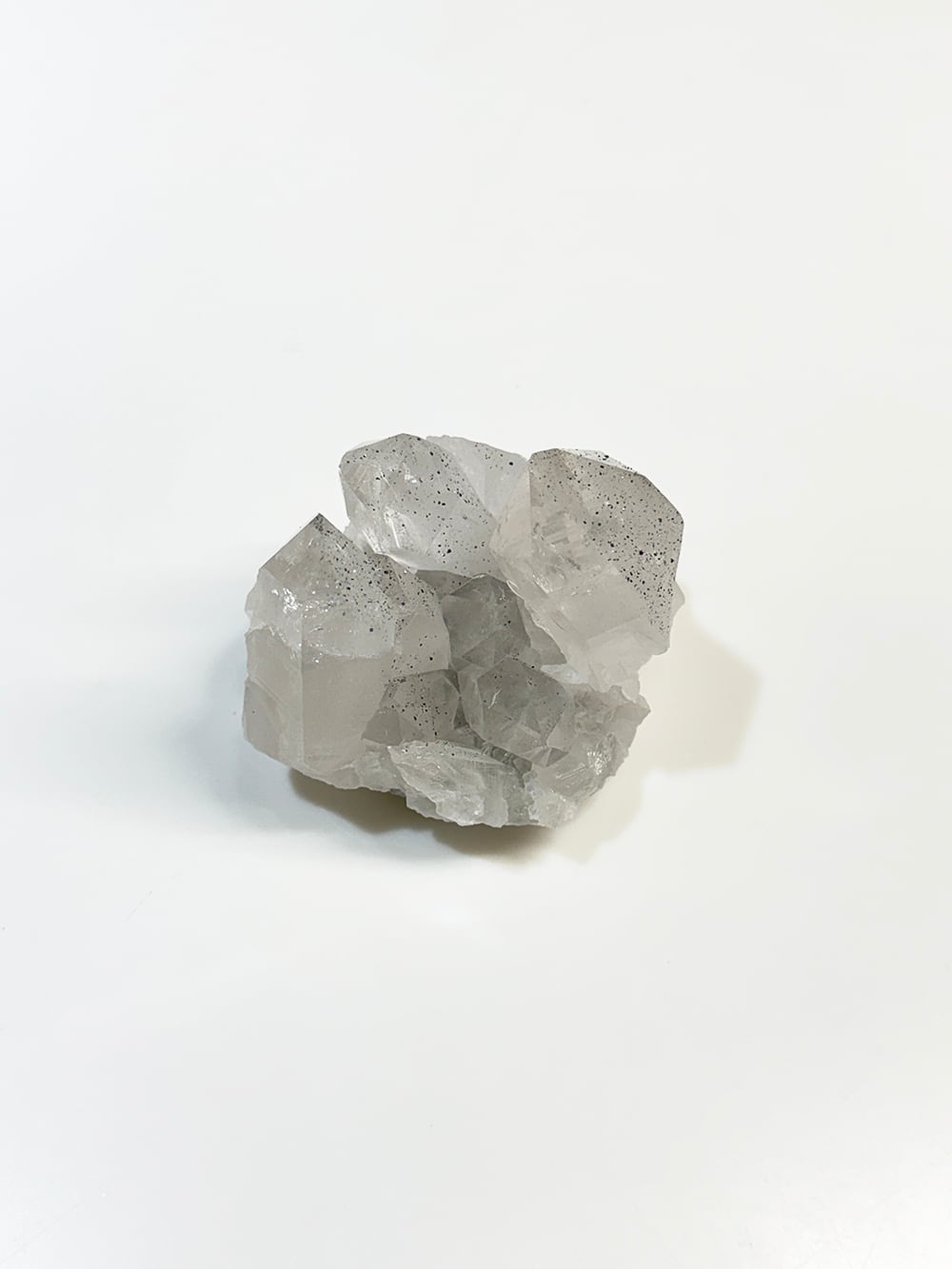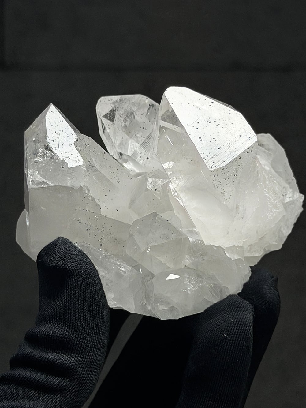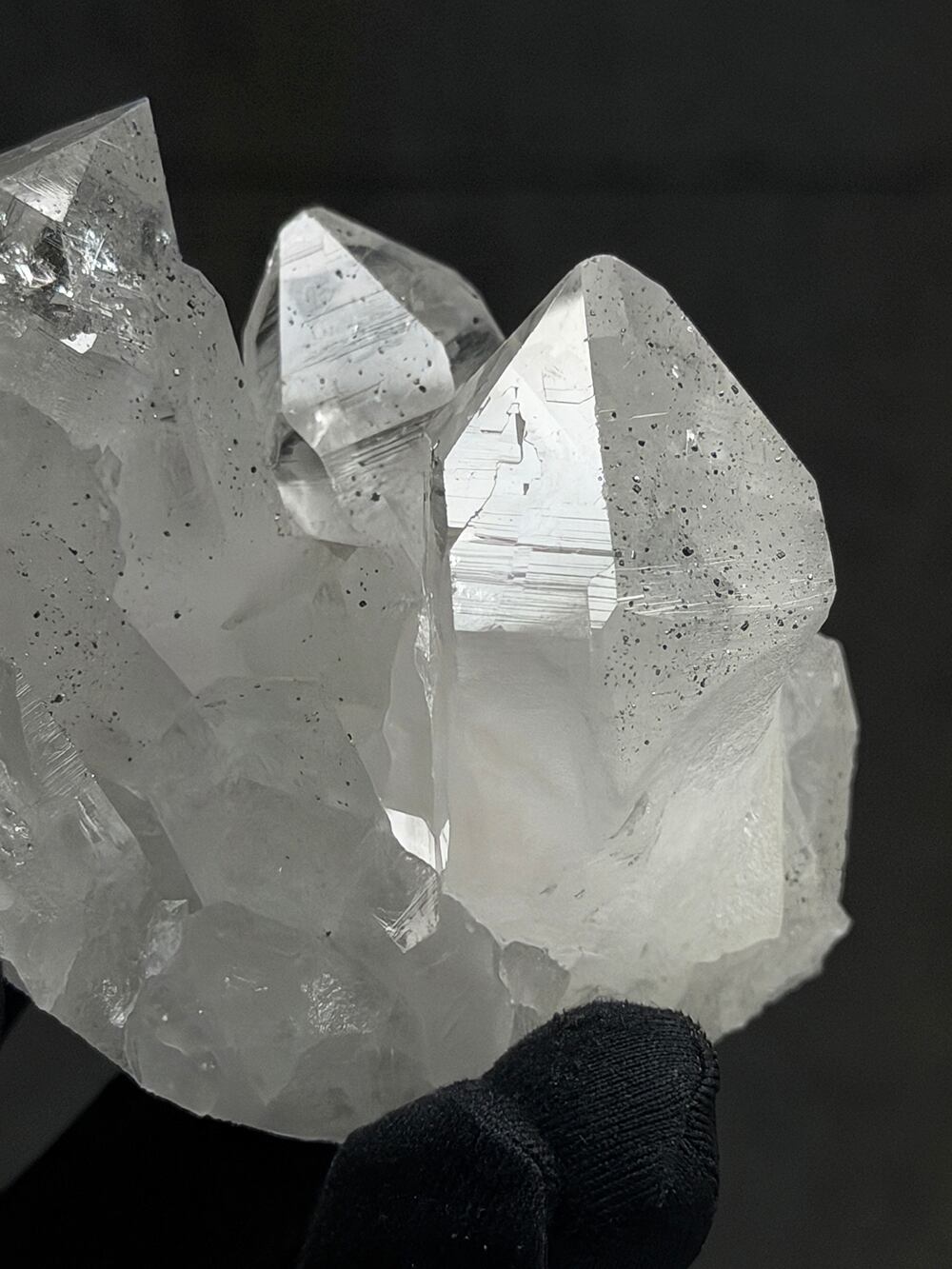 とても美しいマニハールのクォーツクラスター。全体のシルエットとバランスがとても良く、表面の照りも素晴らしい一点。黒いパウダーのようなアナテースがアクセントになっており、マニハールらしい美しさも引き立てています。底の面には少しだけクローライトも付着しており、全体の色合いに深みを与える良い役割を果たしています。