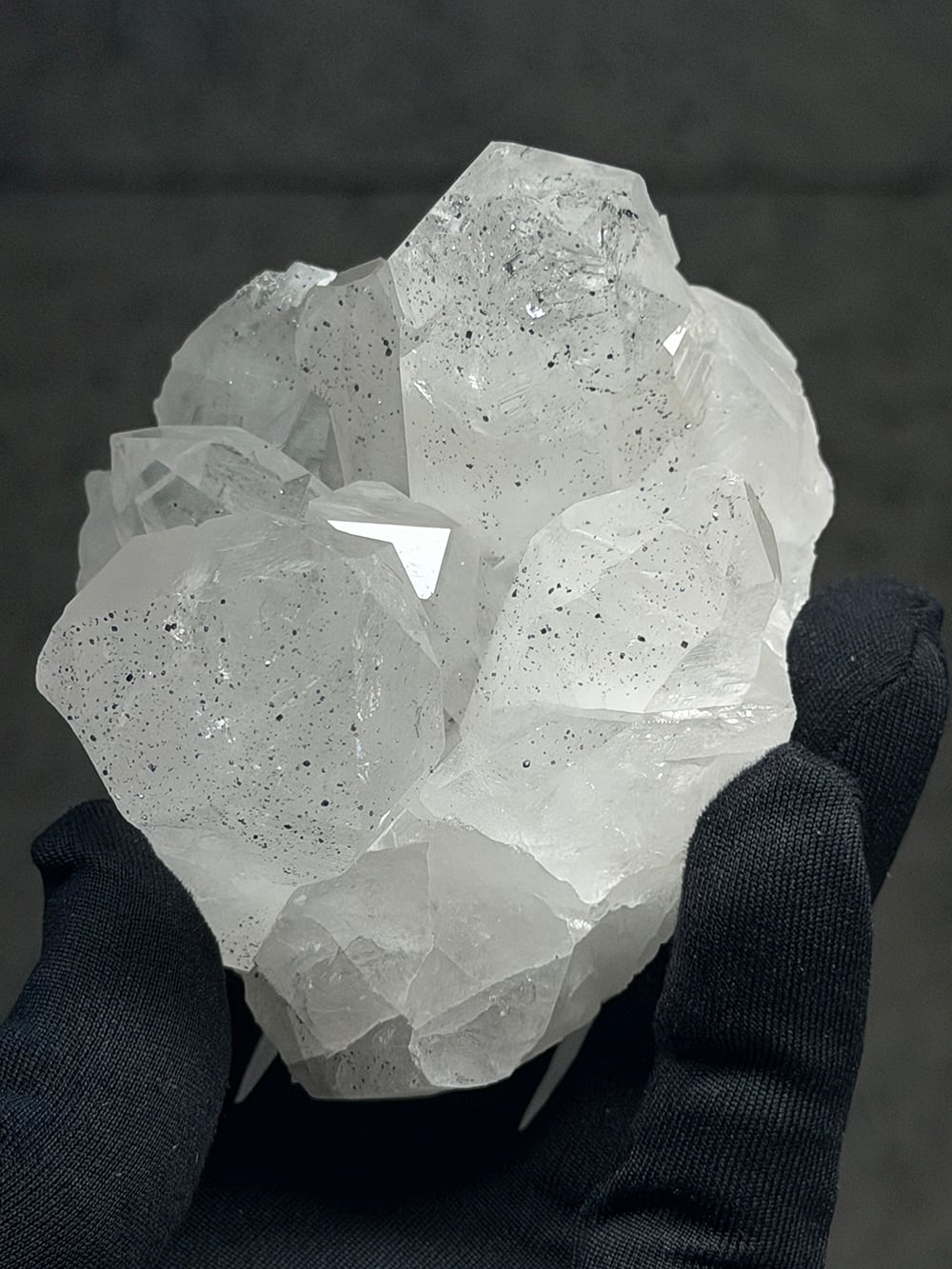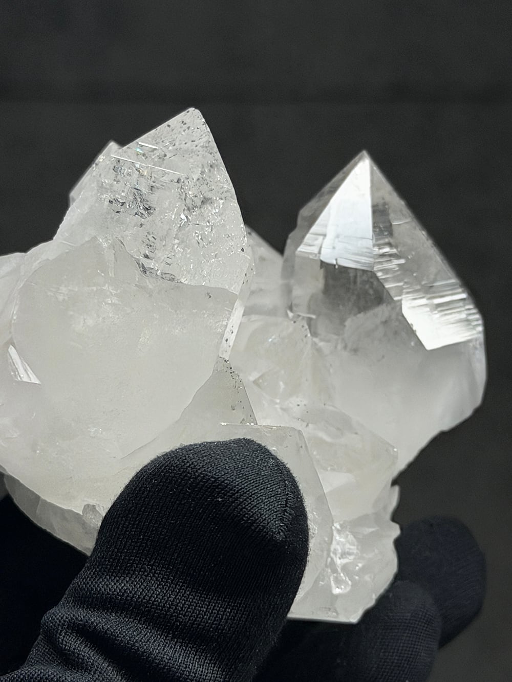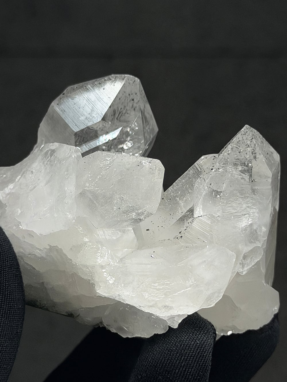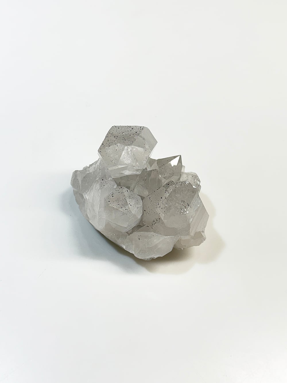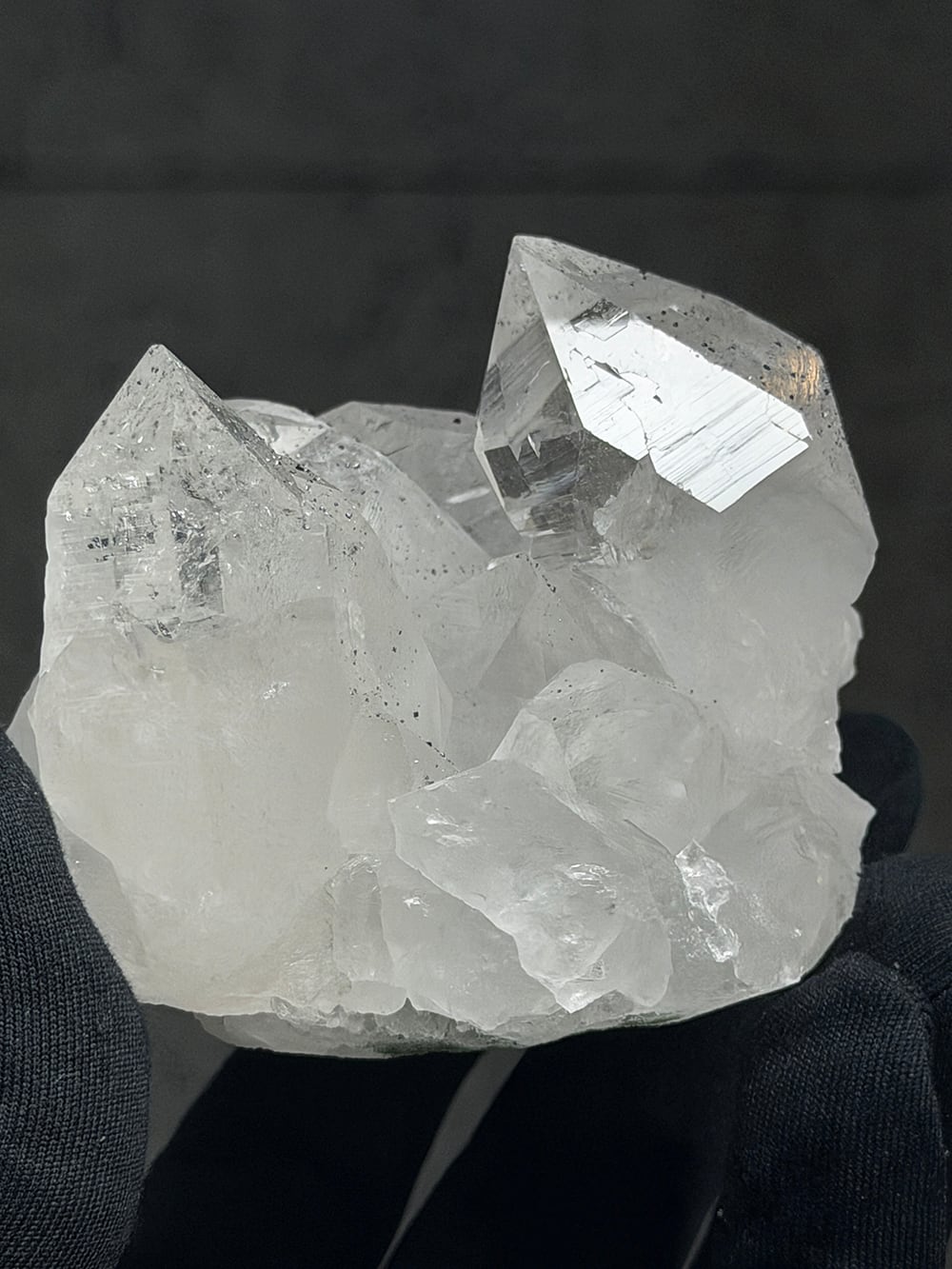 とても美しいマニハールのクォーツクラスター。全体のシルエットとバランスがとても良く、表面の照りも素晴らしい一点。黒いパウダーのようなアナテースがアクセントになっており、マニハールらしい美しさも引き立てています。底の面には少しだけクローライトも付着しており、全体の色合いに深みを与える良い役割を果たしています。